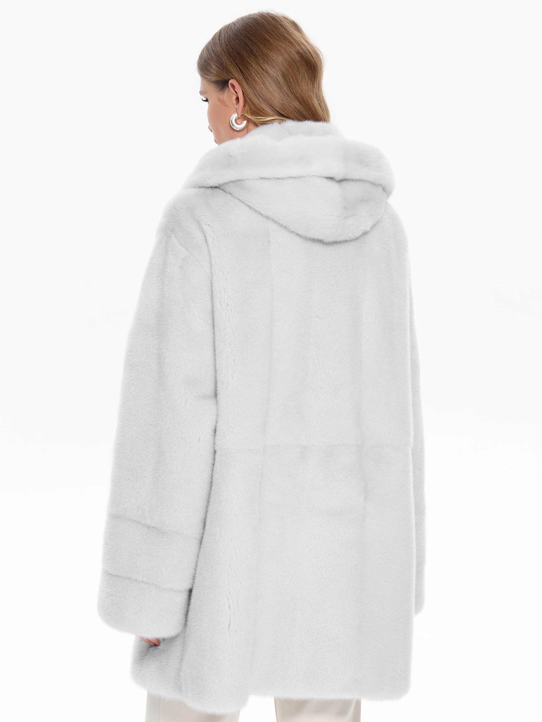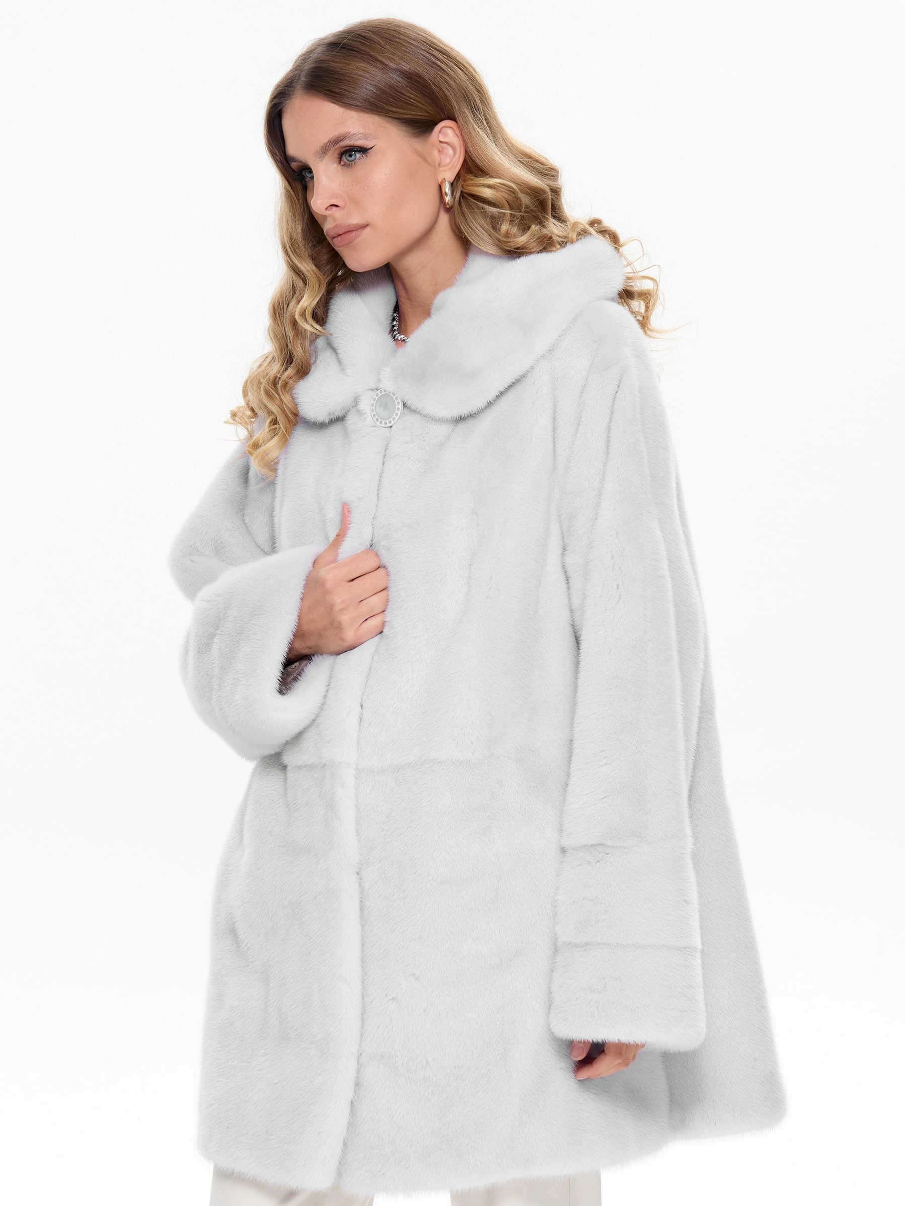 Короткую белоснежную шубу с объемным капюшоном и спущенной линией плеча выполнили из густого нежного меха норки. Свободная модель с двумя врезными боковыми карманами застегивается металлическими клипсами.