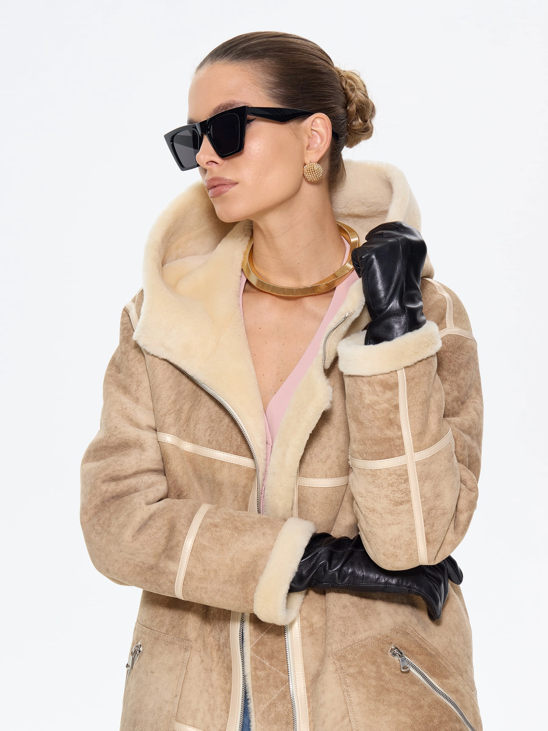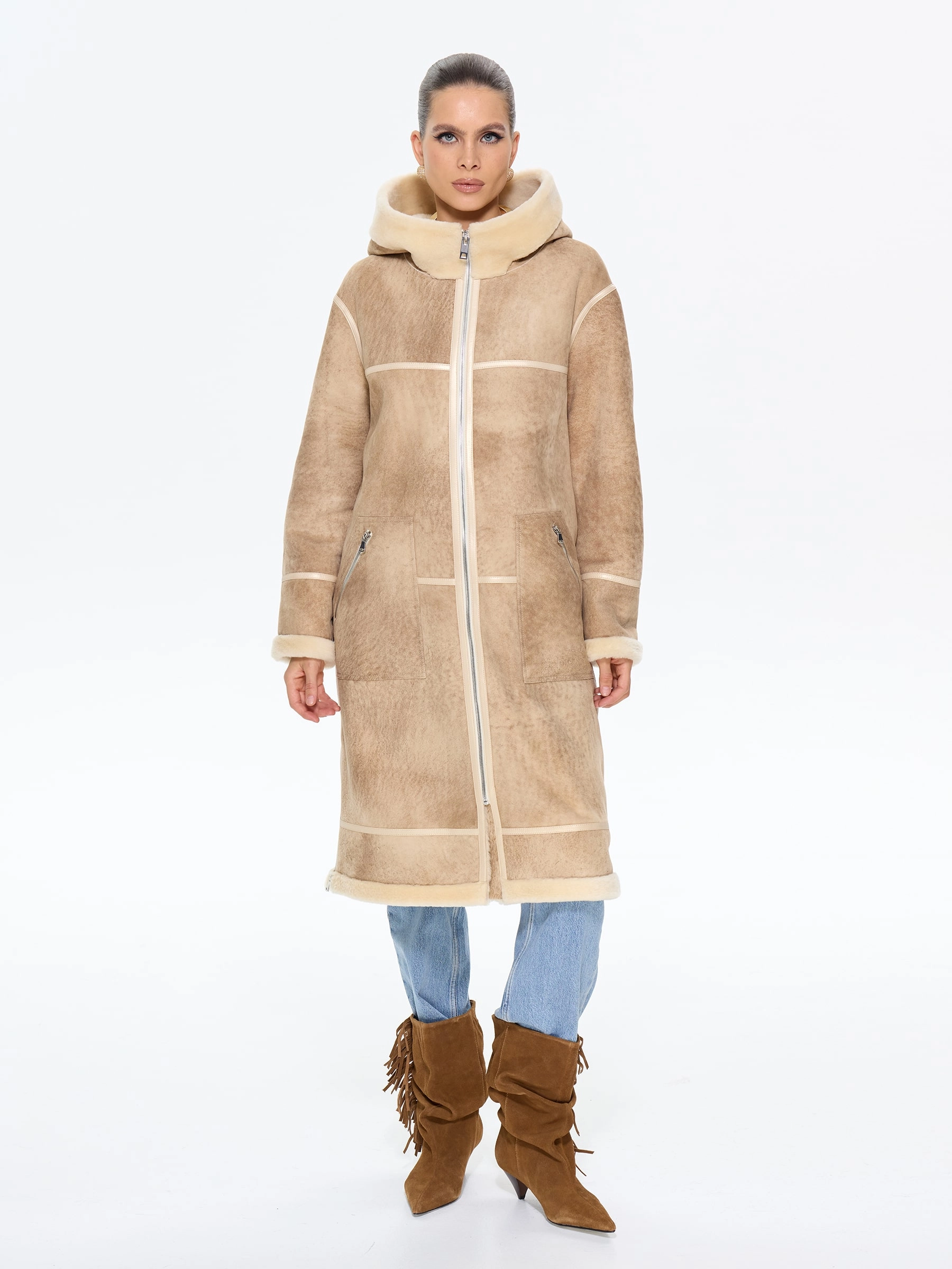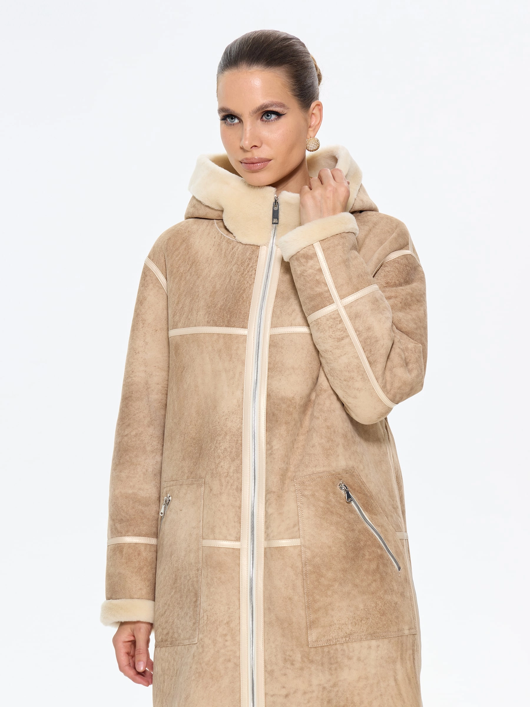 Эта стильная дубленка свободного кроя из натуральной овчины мерино премиум-класса в благородной бежевой гамме — идеальный выбор для современных женщин, ценящих безупречный союз комфорта и утонченного шарма в зимнем гардеробе. Удлиненный силуэт длиной 105 см со спущенной линией плеча и глубоким капюшоном с меховой опушкой создает атмосферу уюта и расслабленной элегантности, а удобные молнии на изделии и стильных врезных карманах добавляют практичности без ущерба для эстетики. Изящные кожаные канты и меховая отделка подчеркивают безупречное внимание к деталям, превращая эту модель в истинное воплощение сдержанной роскоши. Стилисты рекомендуют использовать универсальность этой дубленки для создания образов с разным настроением: для повседневной динамики носите ее с джинсами-скинни и грубоватыми кожаными ботинками, чтобы создать модный контраст фактур, а для максимально уютного и завершенного зимнего лука сочетайте с вязаным платьем и уггами — такой ансамбль позволит роскошной овчине красиво драпироваться, даря в