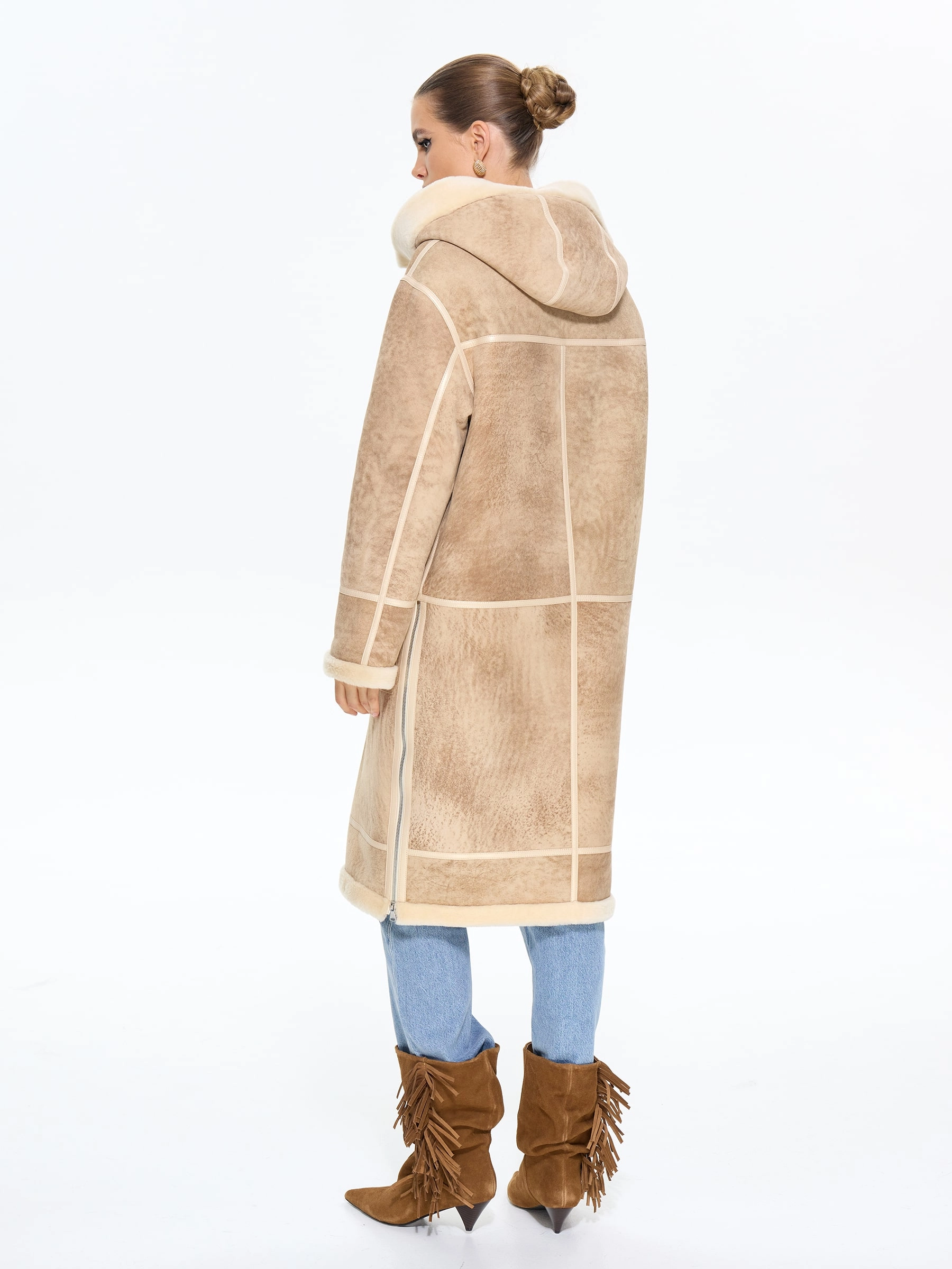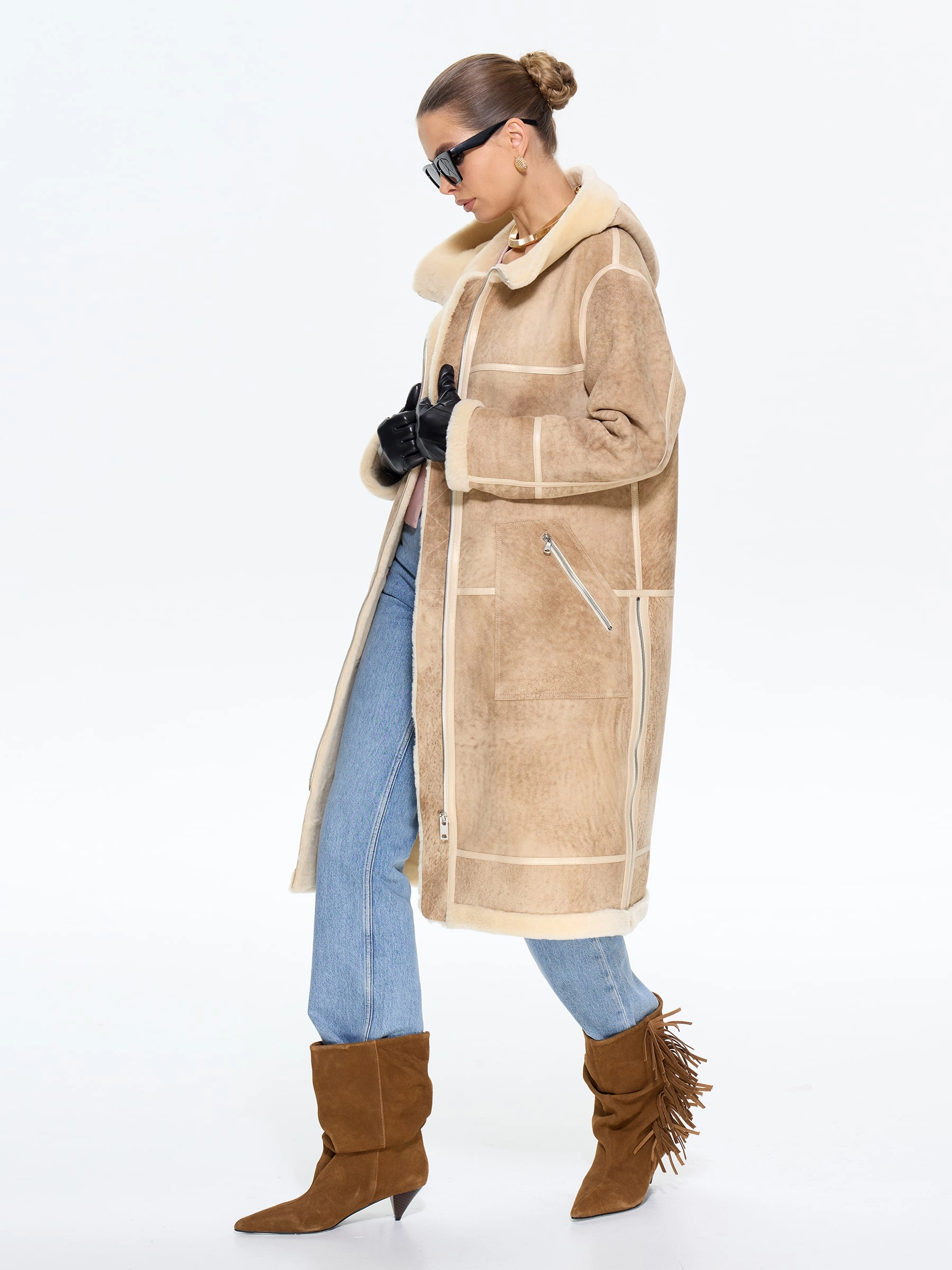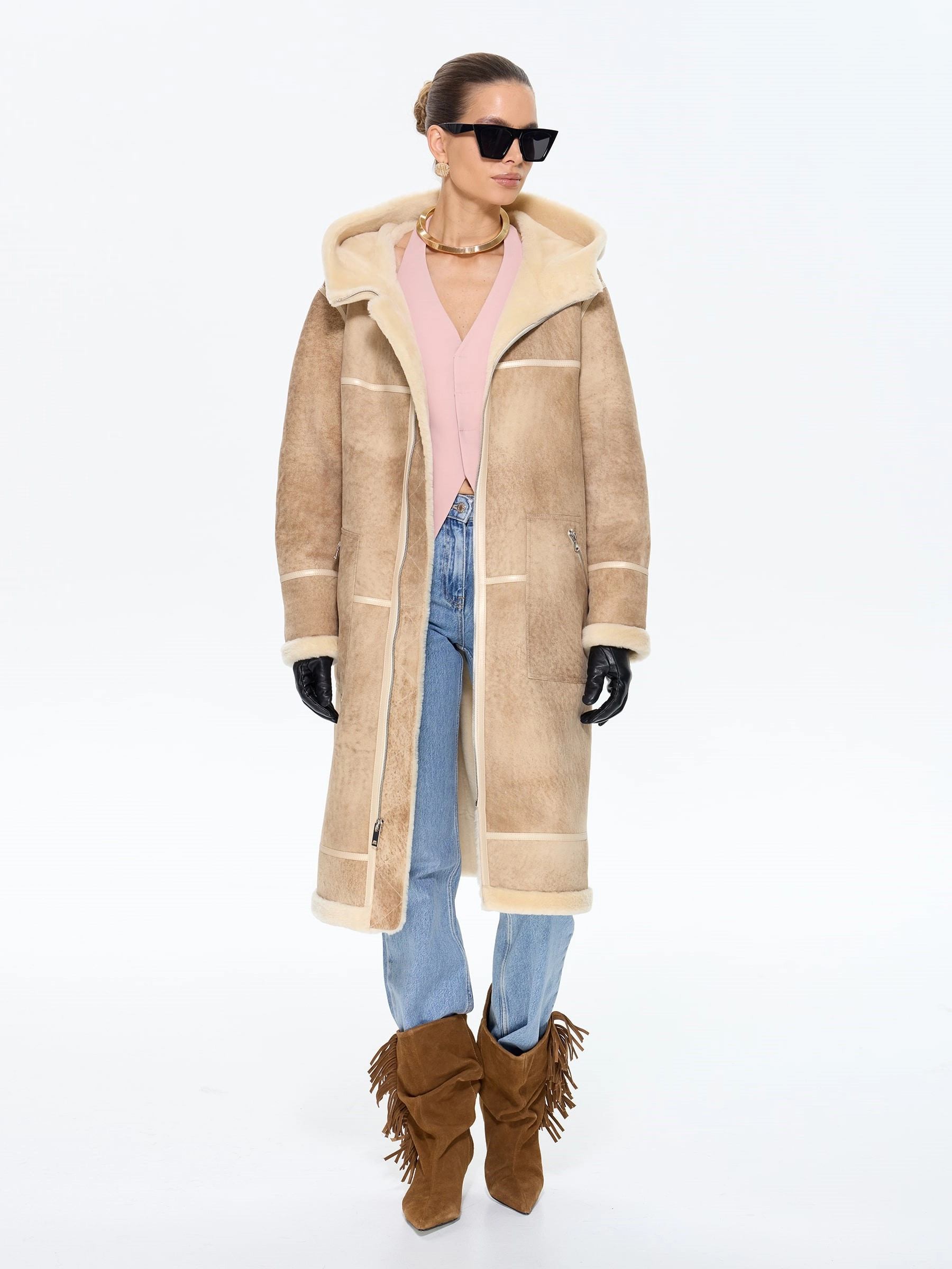 Эта стильная дубленка свободного кроя из натуральной овчины мерино премиум-класса в благородной бежевой гамме — идеальный выбор для современных женщин, ценящих безупречный союз комфорта и утонченного шарма в зимнем гардеробе. Удлиненный силуэт длиной 105 см со спущенной линией плеча и глубоким капюшоном с меховой опушкой создает атмосферу уюта и расслабленной элегантности, а удобные молнии на изделии и стильных врезных карманах добавляют практичности без ущерба для эстетики. Изящные кожаные канты и меховая отделка подчеркивают безупречное внимание к деталям, превращая эту модель в истинное воплощение сдержанной роскоши. Стилисты рекомендуют использовать универсальность этой дубленки для создания образов с разным настроением: для повседневной динамики носите ее с джинсами-скинни и грубоватыми кожаными ботинками, чтобы создать модный контраст фактур, а для максимально уютного и завершенного зимнего лука сочетайте с вязаным платьем и уггами — такой ансамбль позволит роскошной овчине красиво драпироваться, даря в