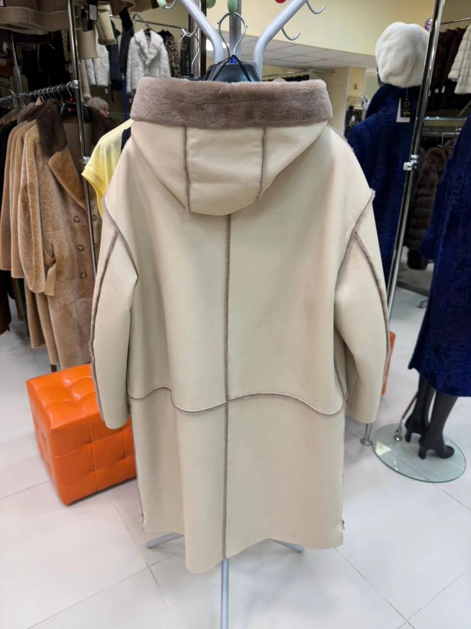 Товар бежевая женская дубленка с капюшоном 2077, размер 50, артикул 65110 выполнен из овчина "мерино" с застежкой молния. Рассчитан на сезон: зима. Длина изделия 75 см, силуэт сободный.