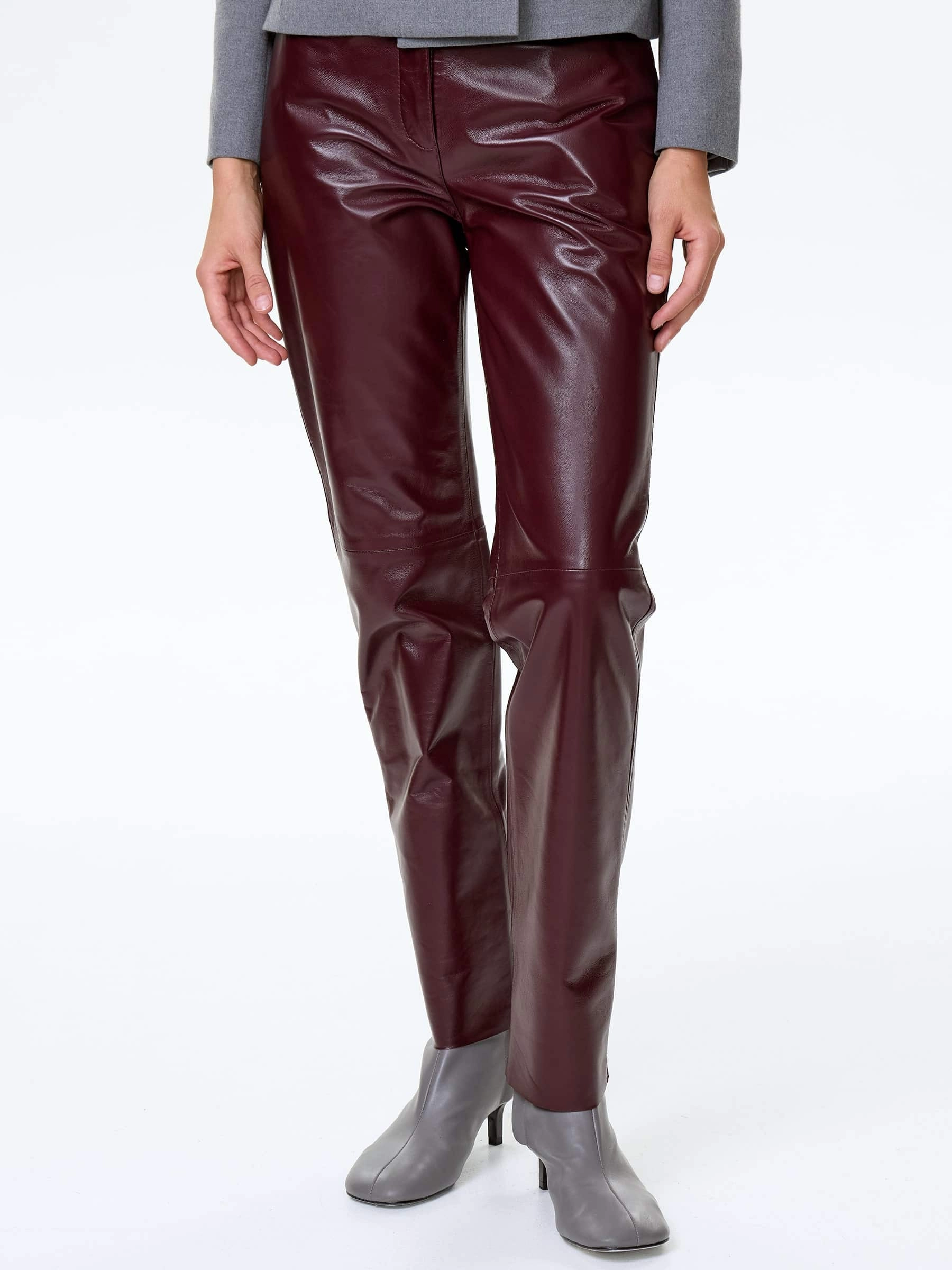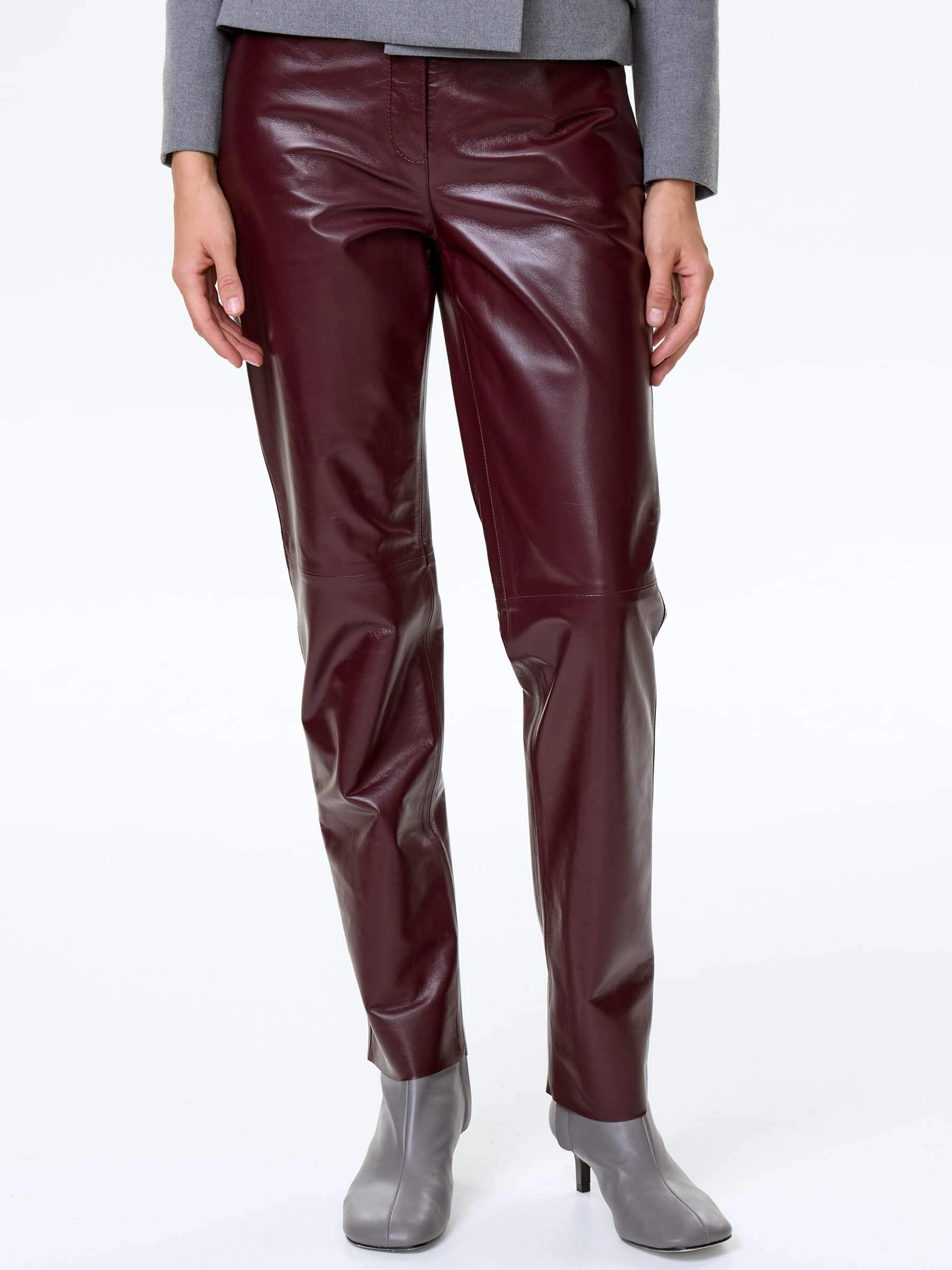 Товар бордовые зауженные кожаные женские брюки 02, размер 42, артикул 85492 выполнен из натуральной кожи с застежкой молния. Рассчитан на сезон: демисезон. Длина изделия 105 см, силуэт прямой.