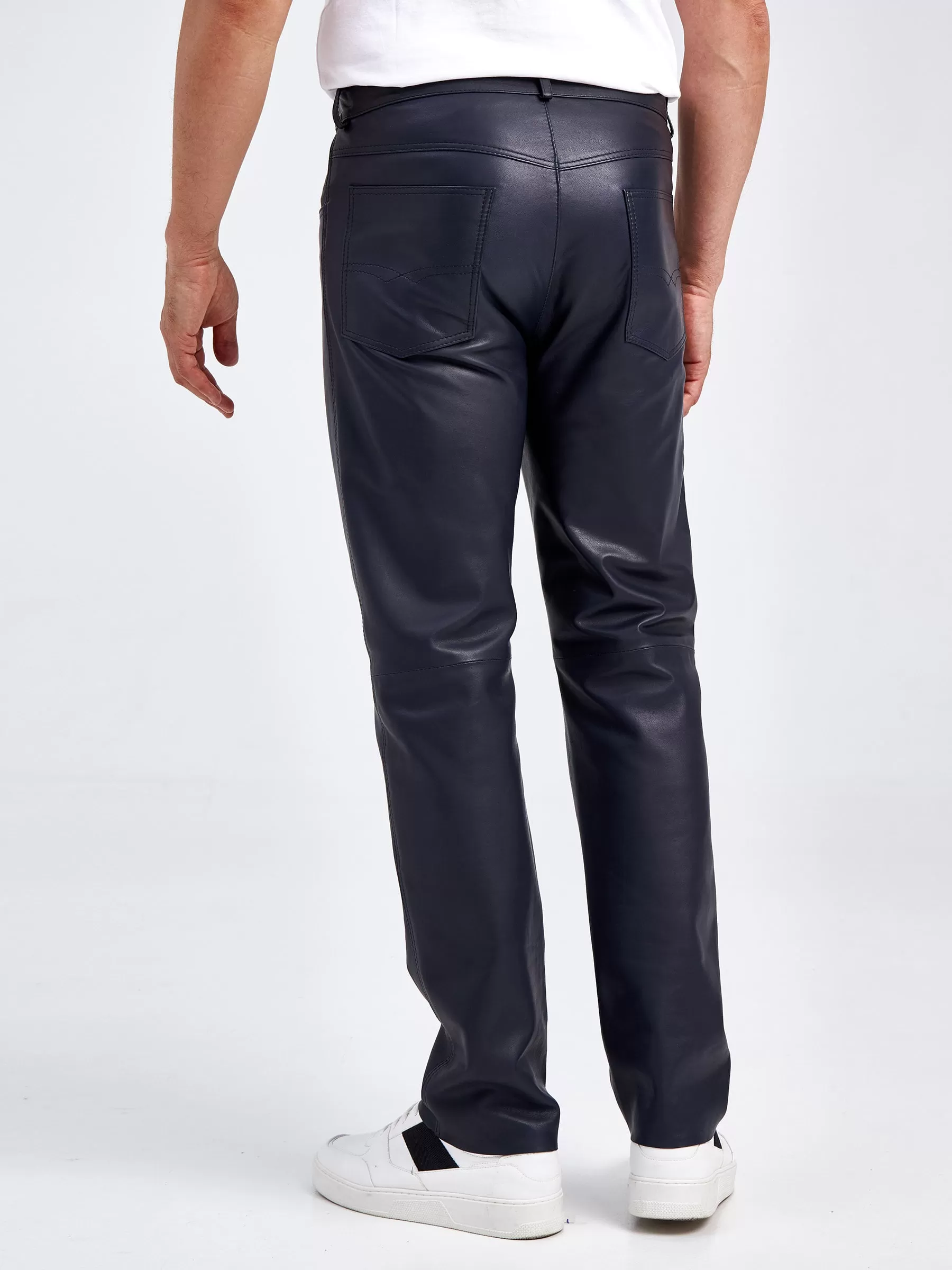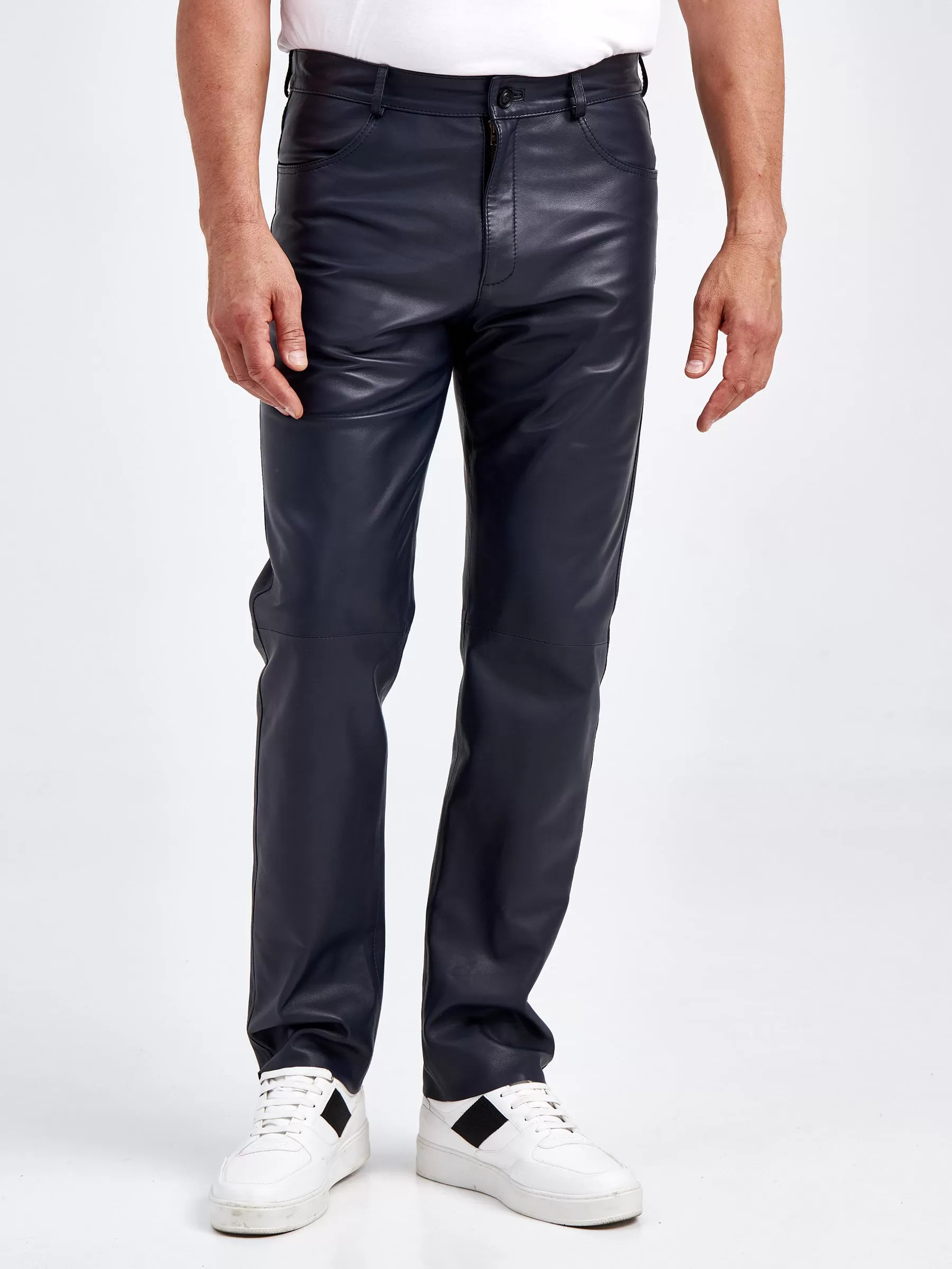 Товар мужские брюки из натуральной кожи премиум класса 01, синие, размер 48, артикул 120021 выполнен из натуральной кожи с застежкой молния. Рассчитан на сезон: демисезон. Длина изделия 103 см, силуэт прямой.