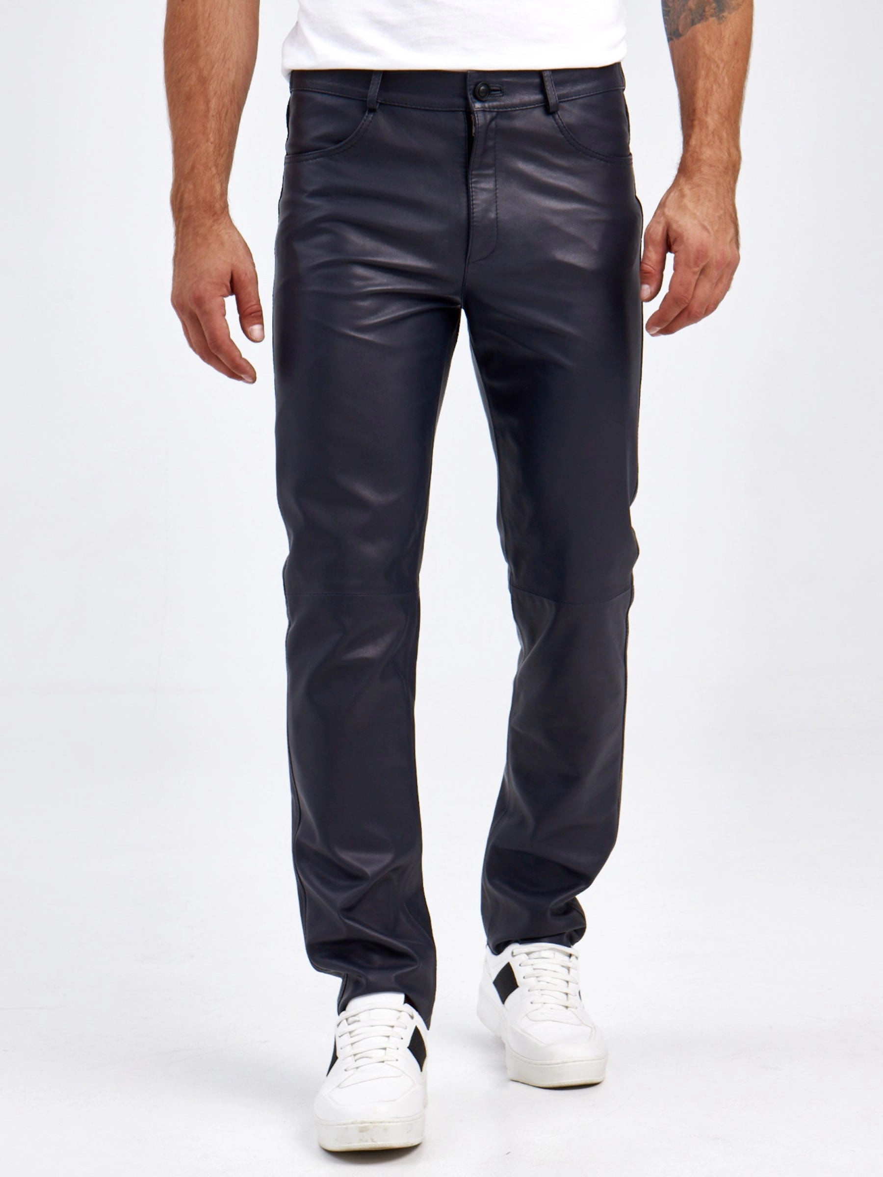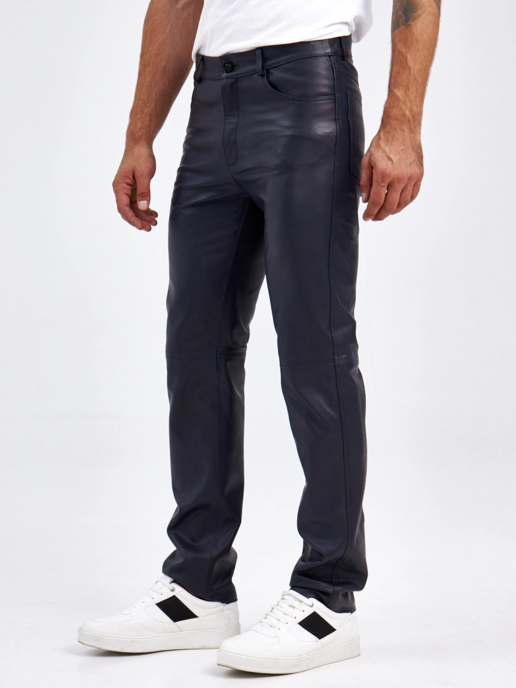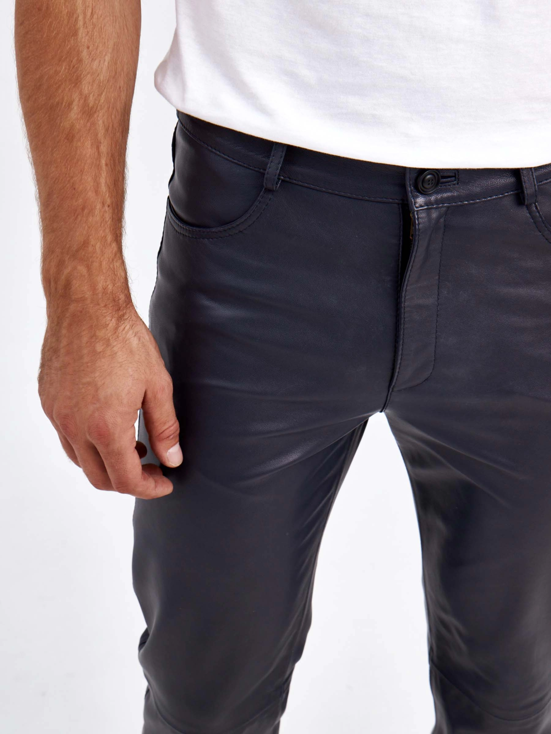 Товар мужские брюки из натуральной кожи премиум класса 01, синие, размер 48, артикул 120022 выполнен из натуральной кожи с застежкой молния. Рассчитан на сезон: демисезон. Длина изделия 103 см, силуэт прямой.