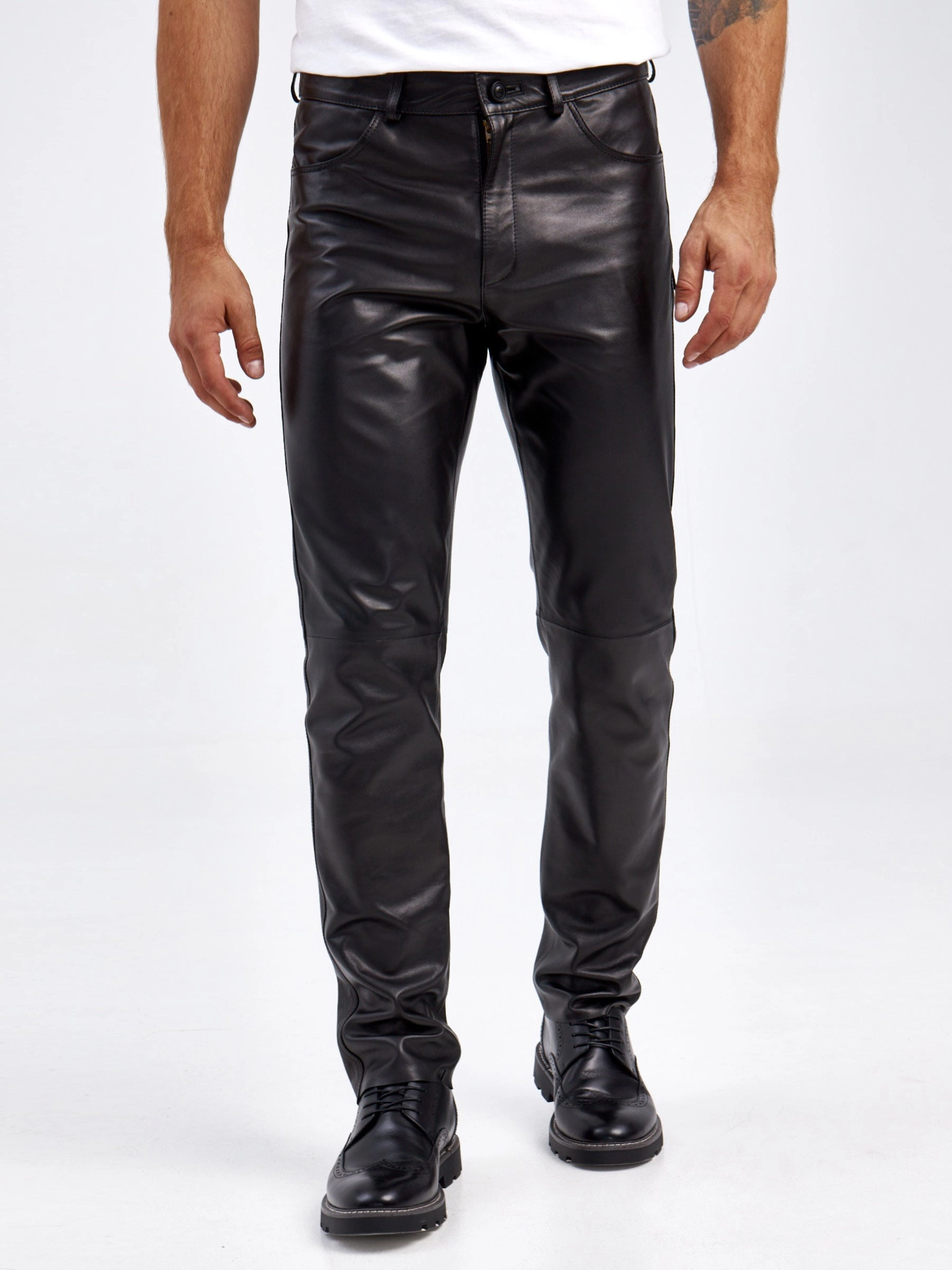 Товар мужские брюки из натуральной кожи премиум класса 01, черные, размер 48, артикул 120012 выполнен из натуральной кожи с застежкой молния. Рассчитан на сезон: демисезон. Длина изделия 103 см, силуэт прямой.