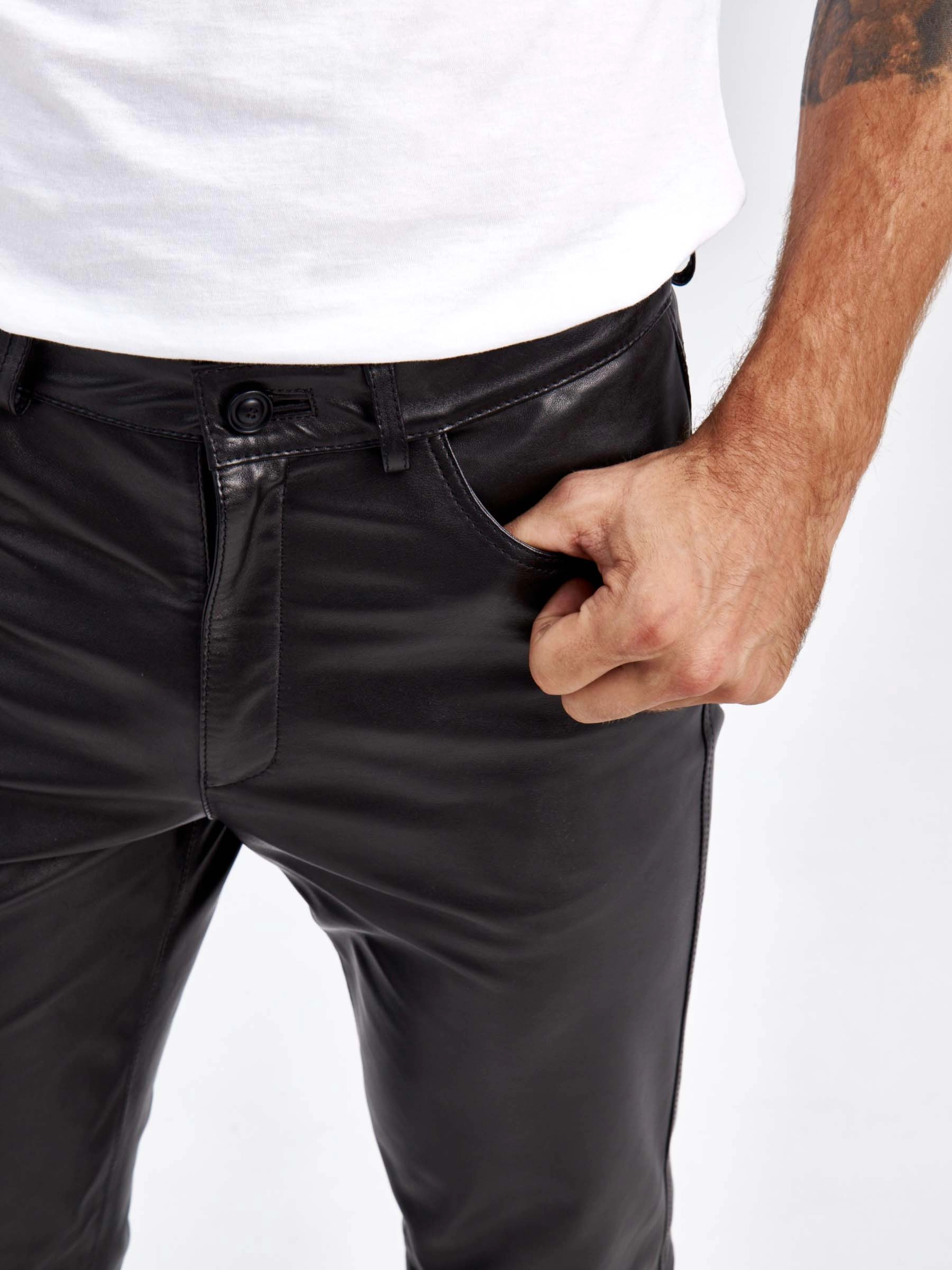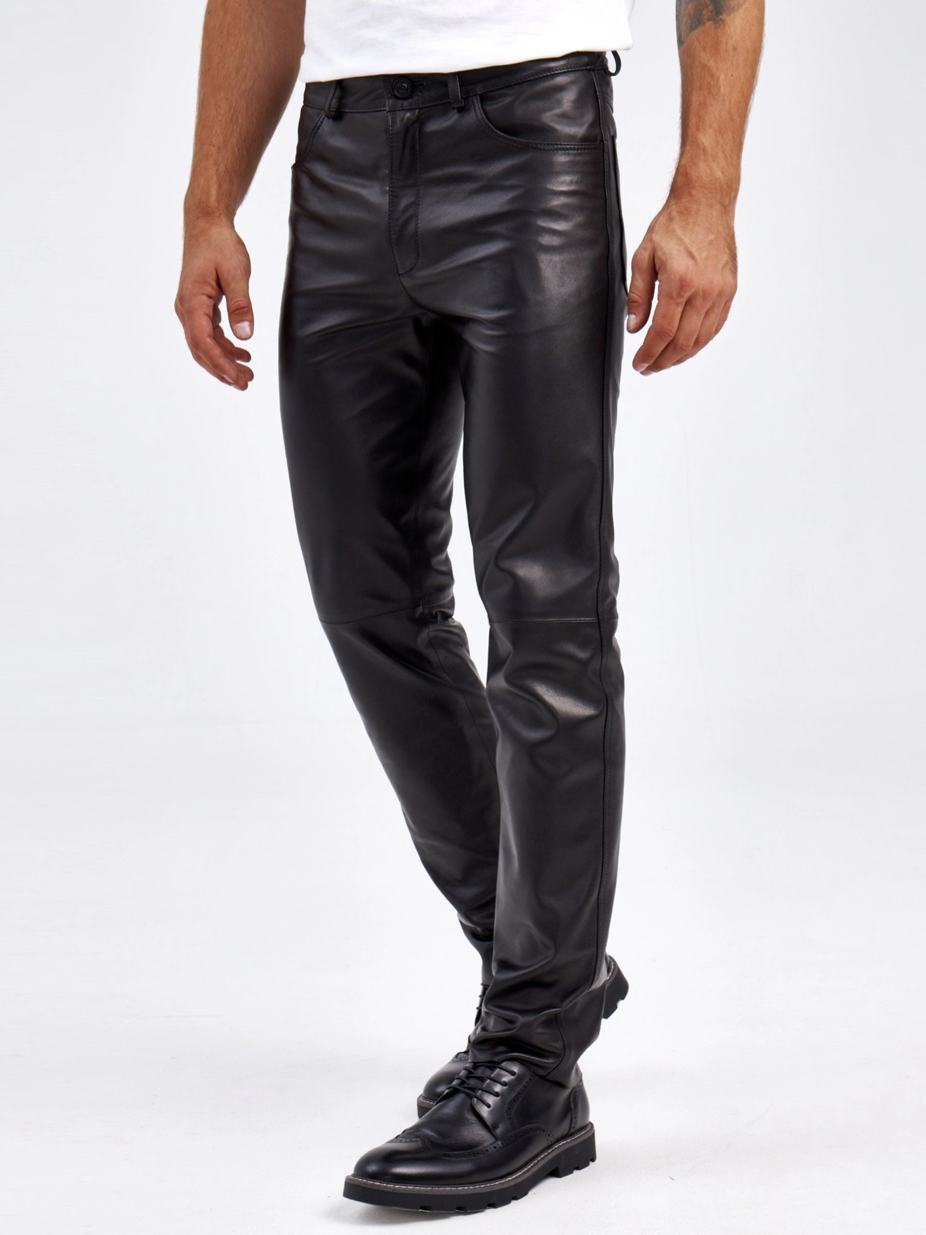 Прямые кожаные джинсы с классическим кроем. Модель поможет сформировать самые разные образы, одинаково удачно сочетаясь как с футболкой и кедами, так и с пальто и челси. Кожа особенно мягкая и слегка эластичная, поэтому вещь комфортно садится по фигуре и не сковывает движения.