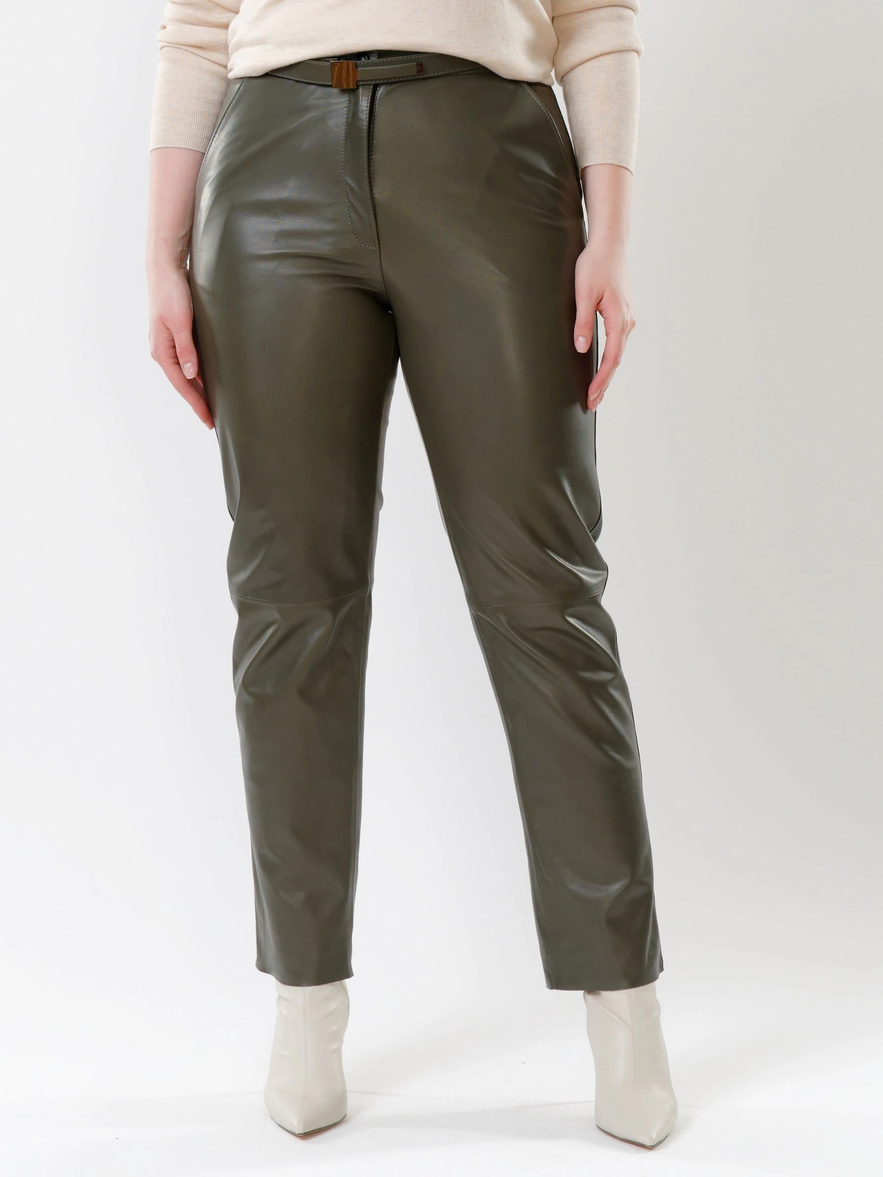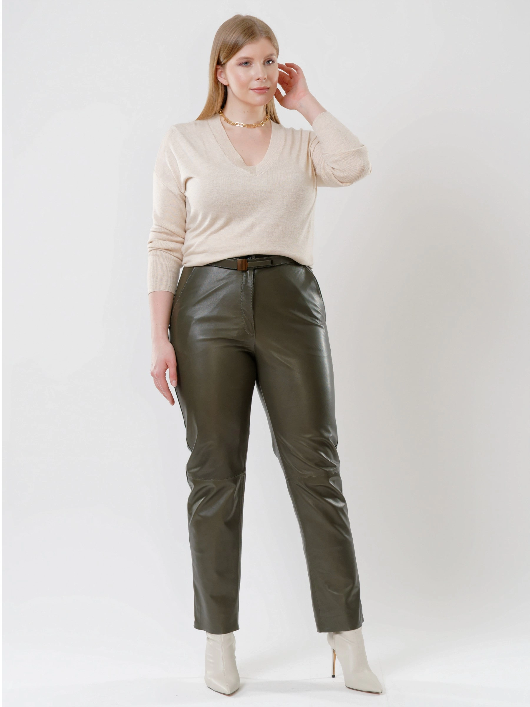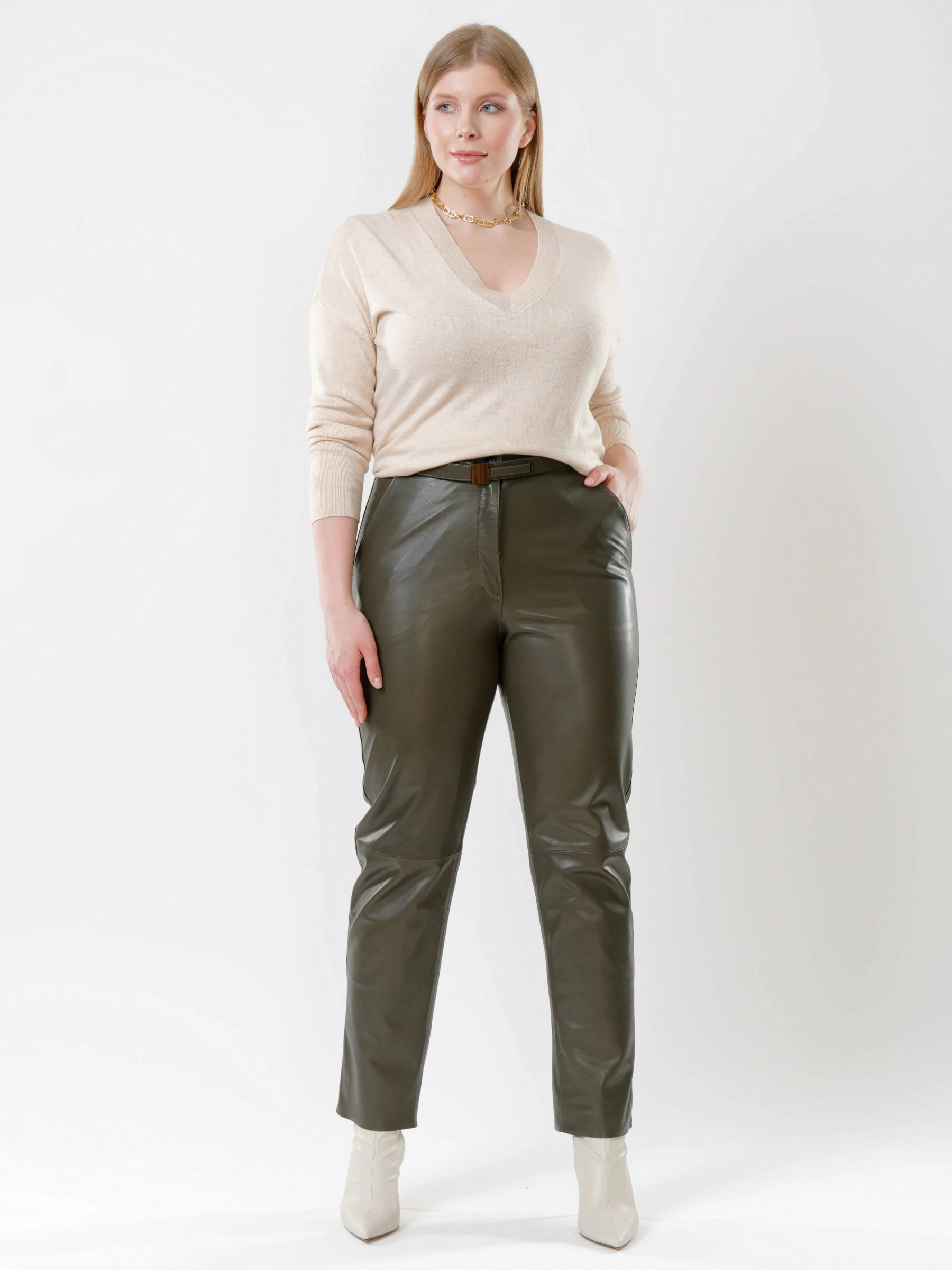 Прямые женские кожаные брюки 04, оливковые, размер 46, артикул 85530