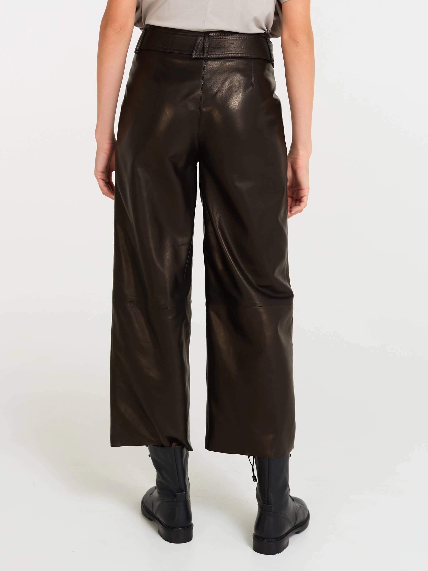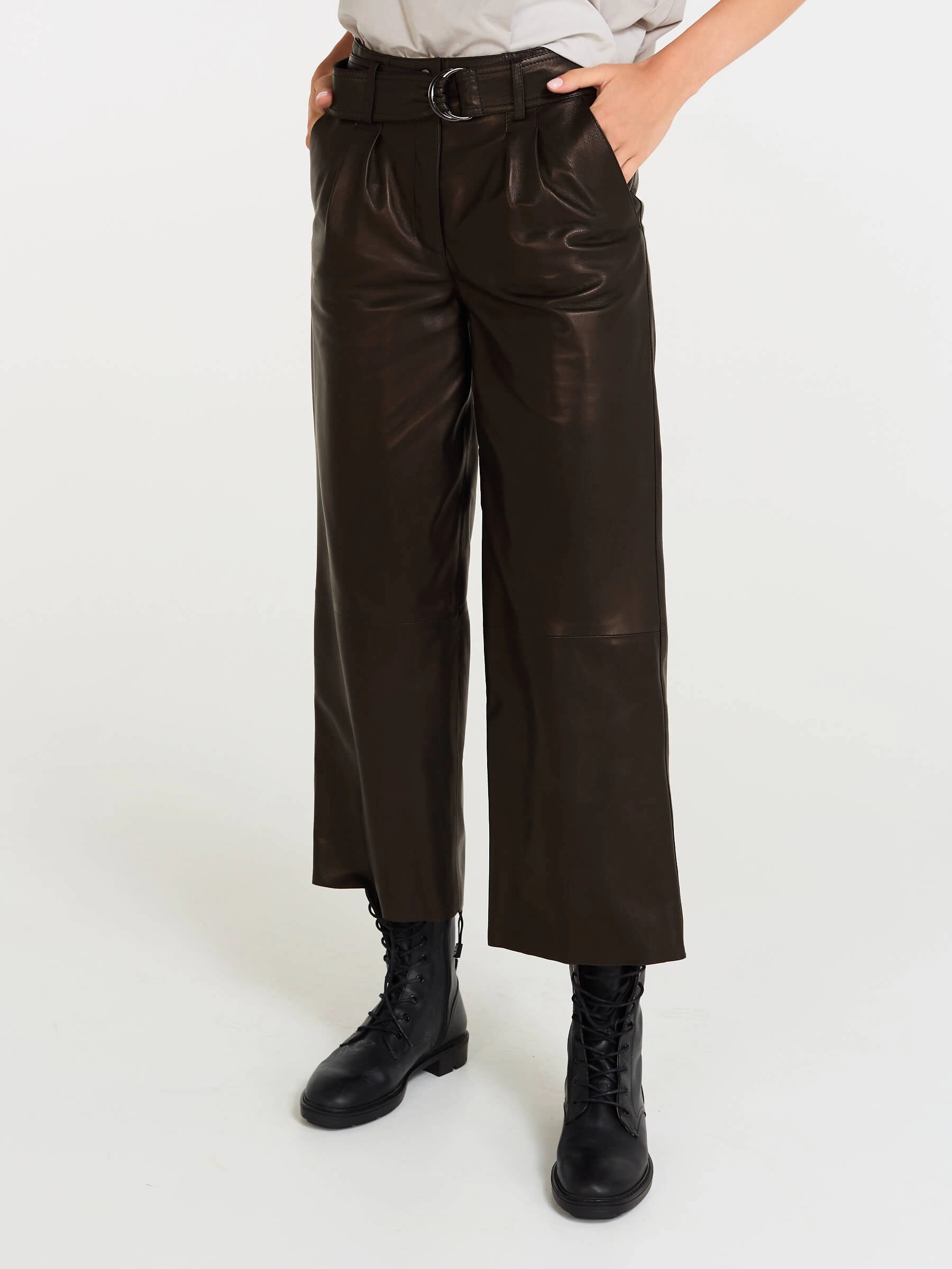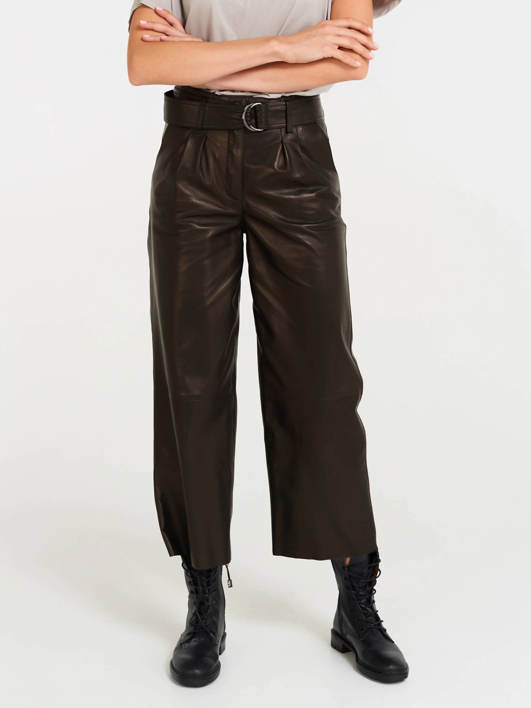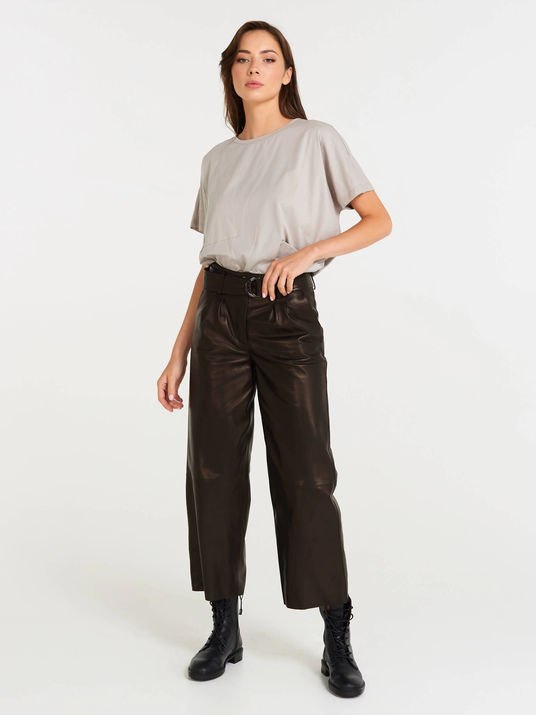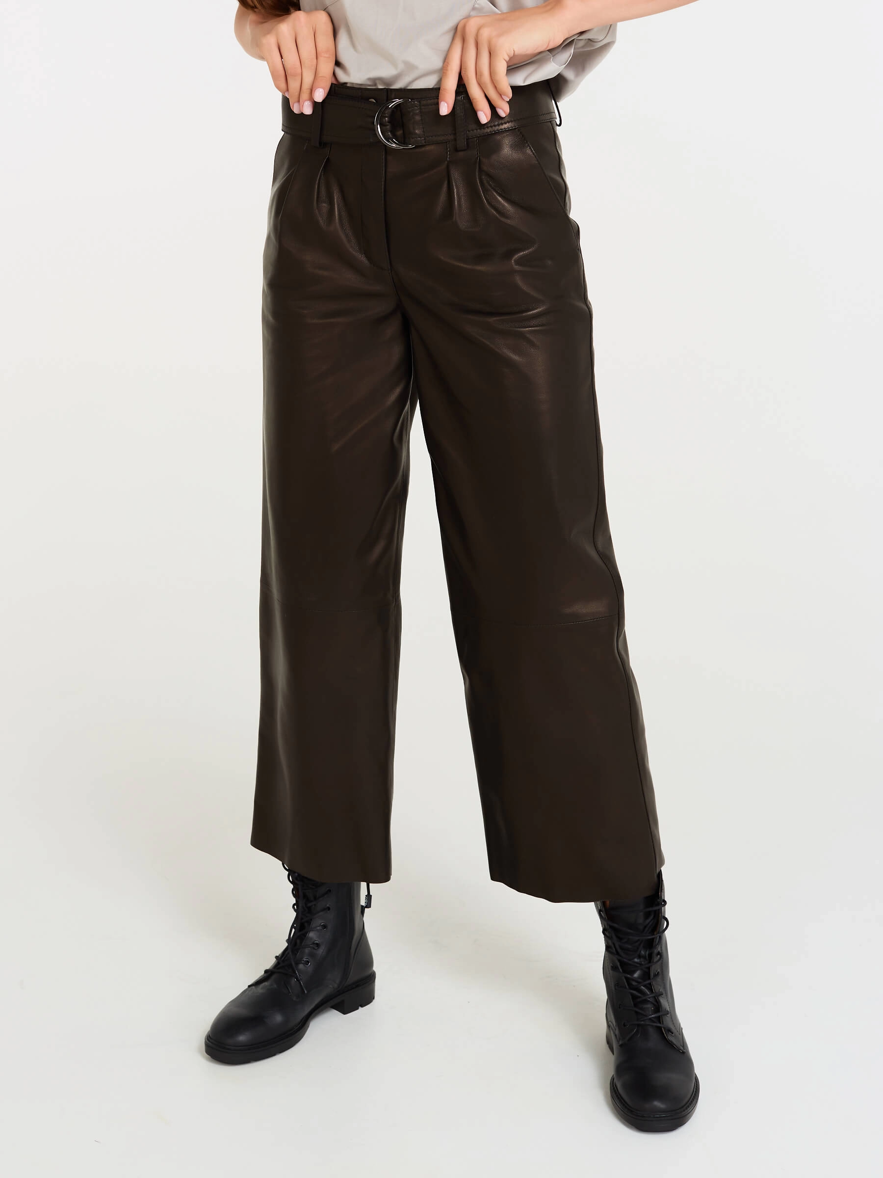 Эти дерзкие кожаные брюки премиум-класса, выполненные в укороченном крое длиной 91 см, предлагают идеальный баланс бунтарского духа и универсальности. Их свободный силуэт с акцентом на широком поясе с пряжкой и застёжкой-молнией создаёт смелый, современный образ, а врезные карманы вносят практичную ноту. Идеальная посадка подчёркивает фигуру, позволяя легко варьировать стиль: от уличного с кедами и кроп-топом до дерзкого офисного — с пиджаком и лаковой обувью, или же для повседневного уюта с массивным свитером.
