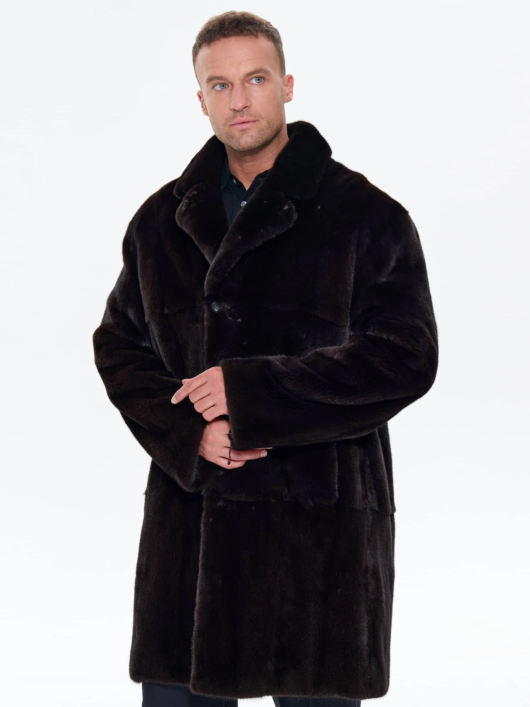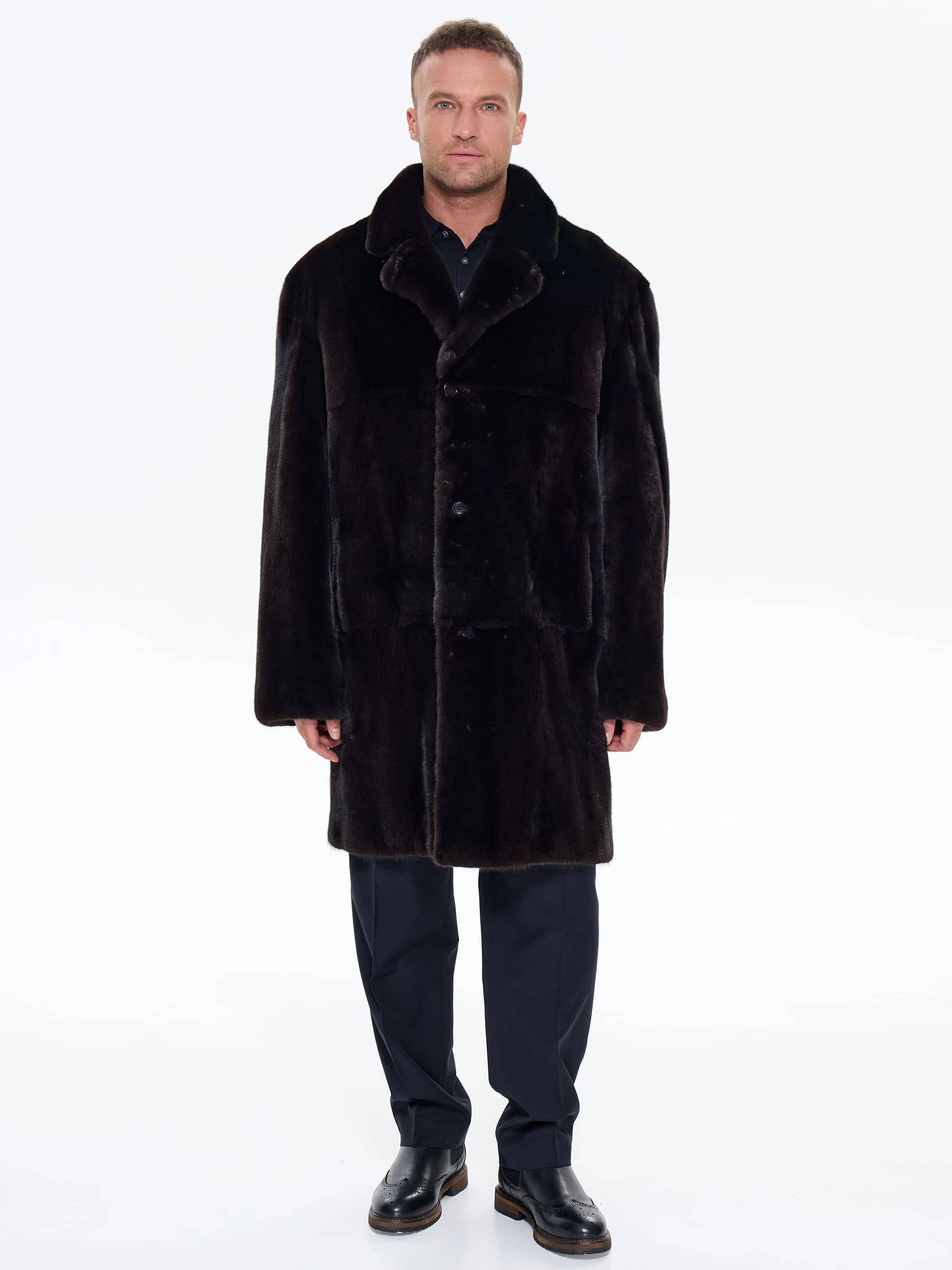 Классическую мужскую шубу пошили из густого меха норки премиум-класса. Строгий английский воротник - подчеркивает аристократизм, совместим с галстуком и шарфами, а прямой крой подчеркивает мужественную строгость».Универсальная длина - закрывает бедра, баланс тепла и мобильности. Полное отсутствие декора акцентирует качество меха. Не высокая шлица сзади улучшает подвижность при ходьбе. Изделие отлично сохраняет тепло в морозную погоду. Модель дополнили двумя внутренними и двумя боковыми карманами. Застежка: пуговицы.