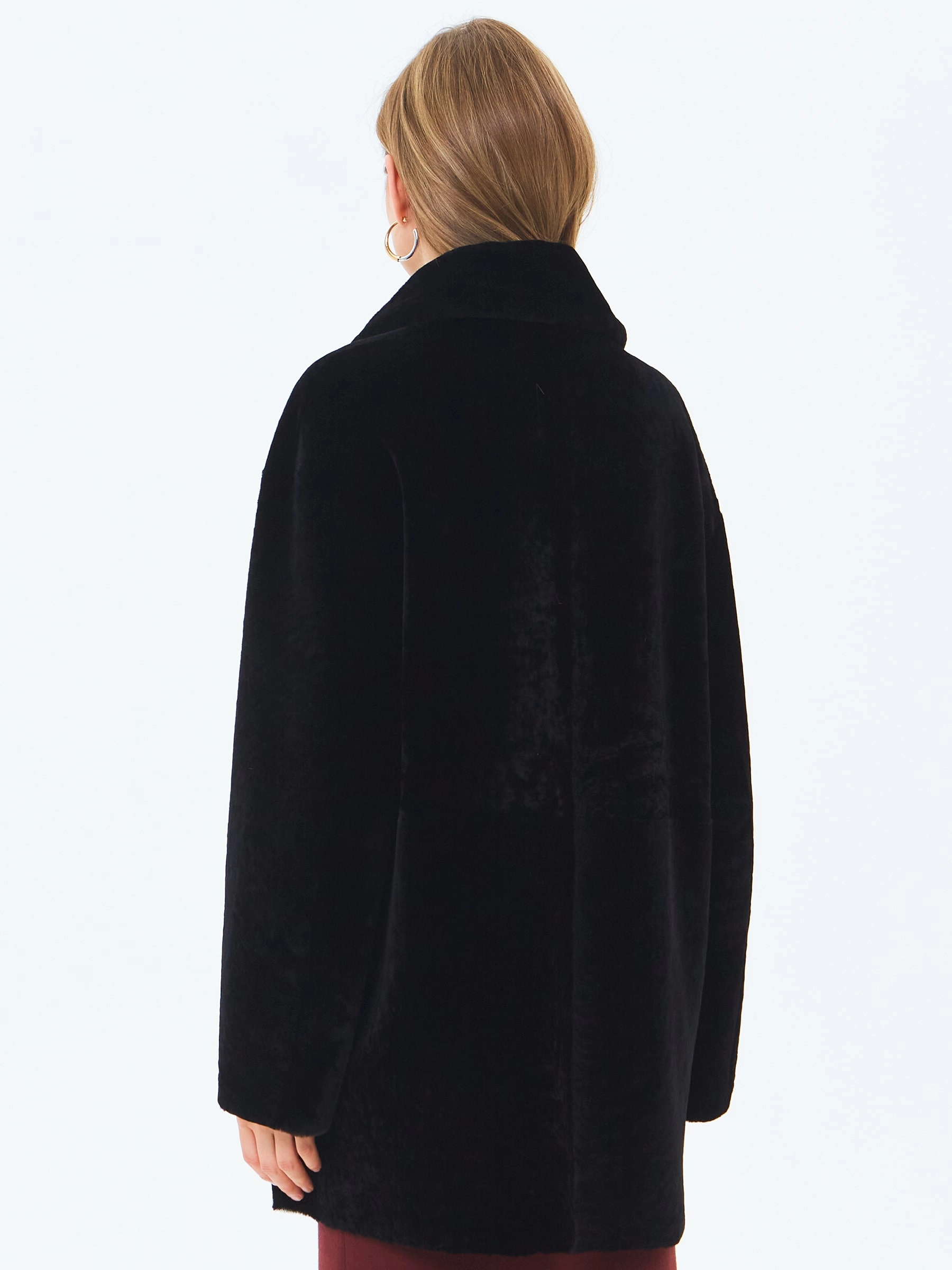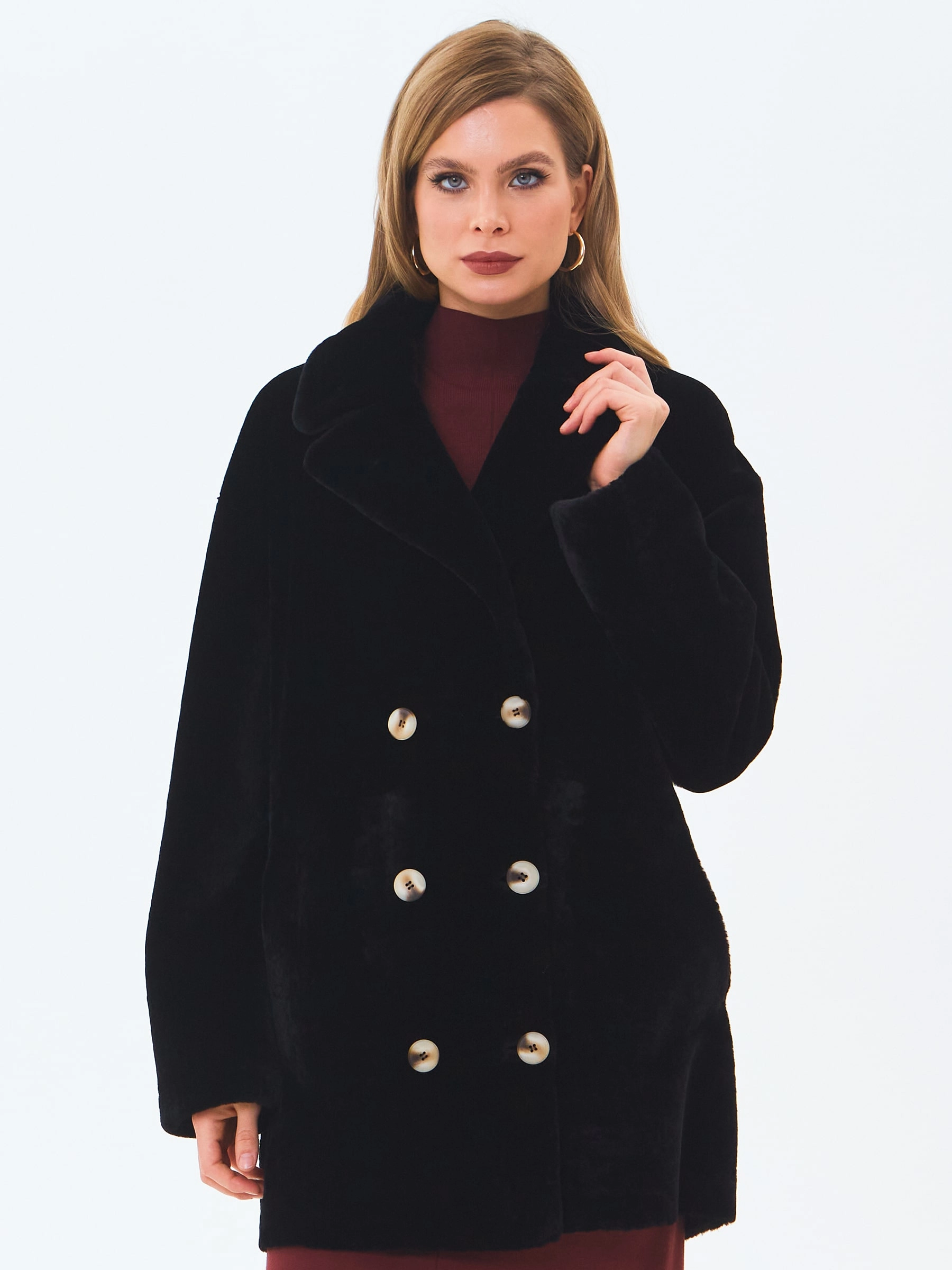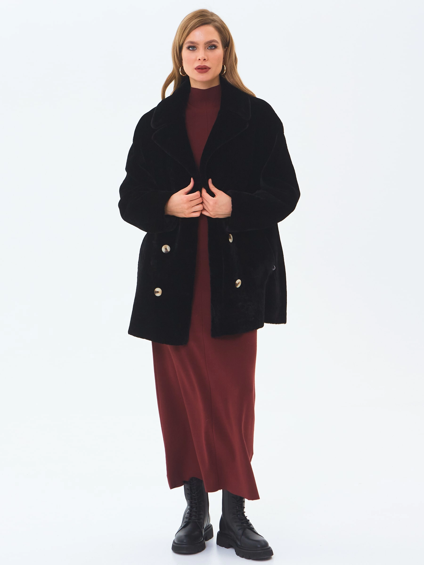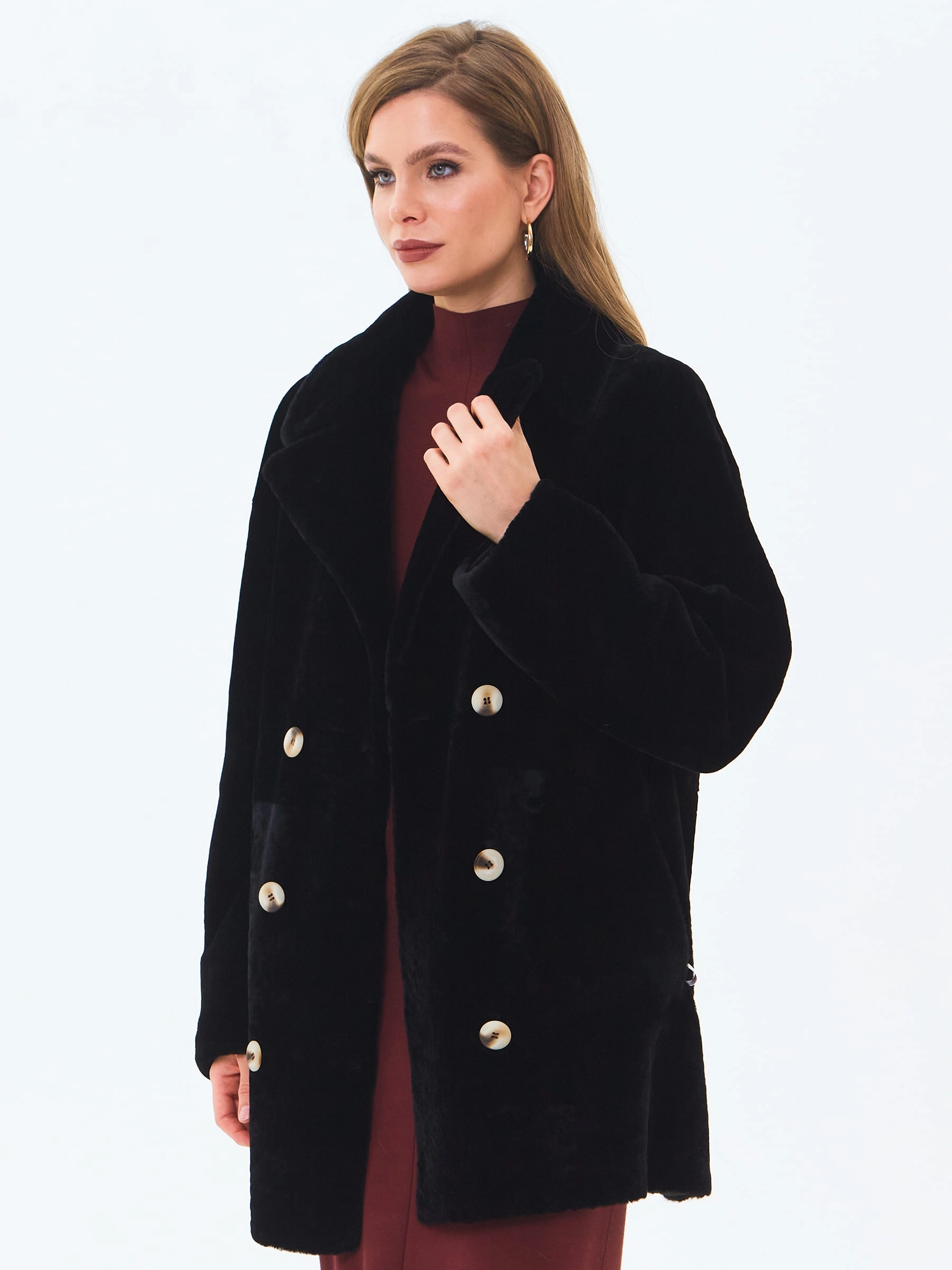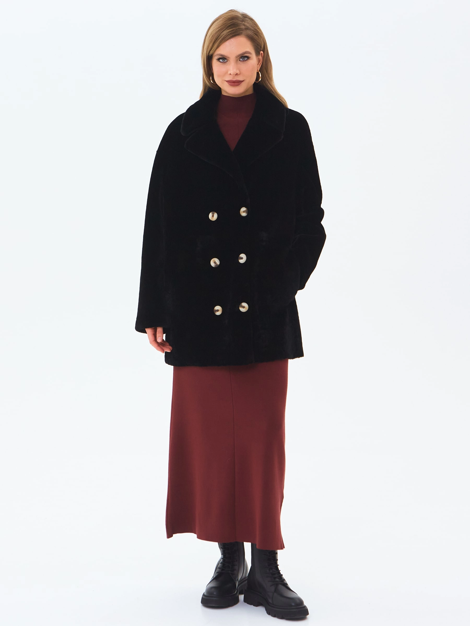 Классическую двубортную модель выполнили из нежного меха овчины астраган. Прямой крой, широкие лацканы, два врезных боковых кармана. Изменить силуэт поможет кожаный пояс. Шуба застегивается крупными пуговицами.