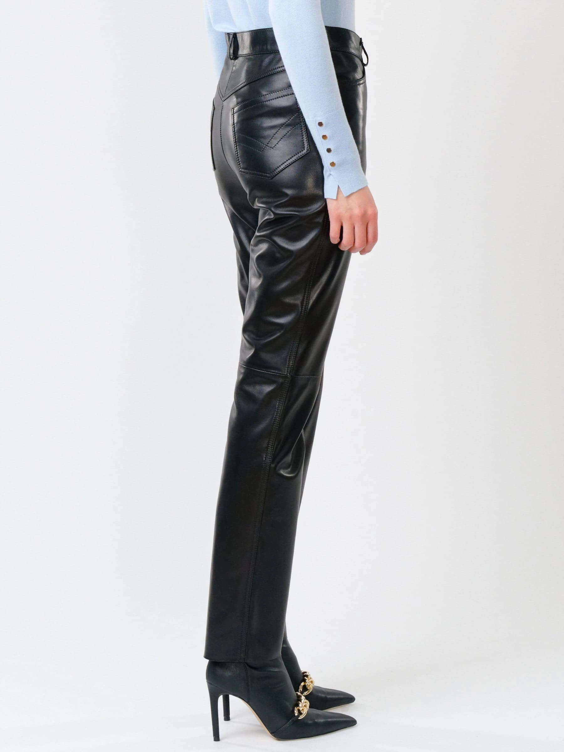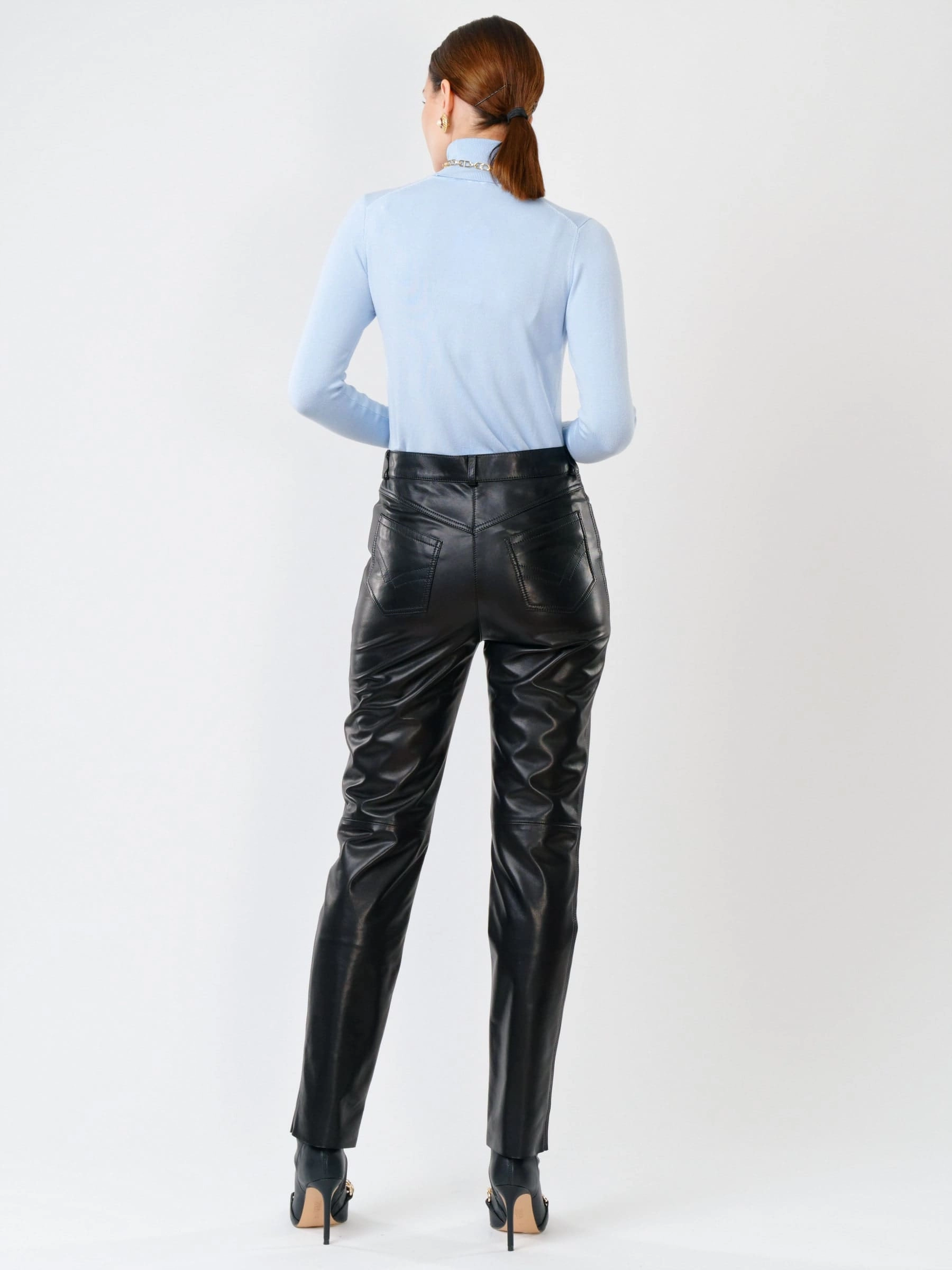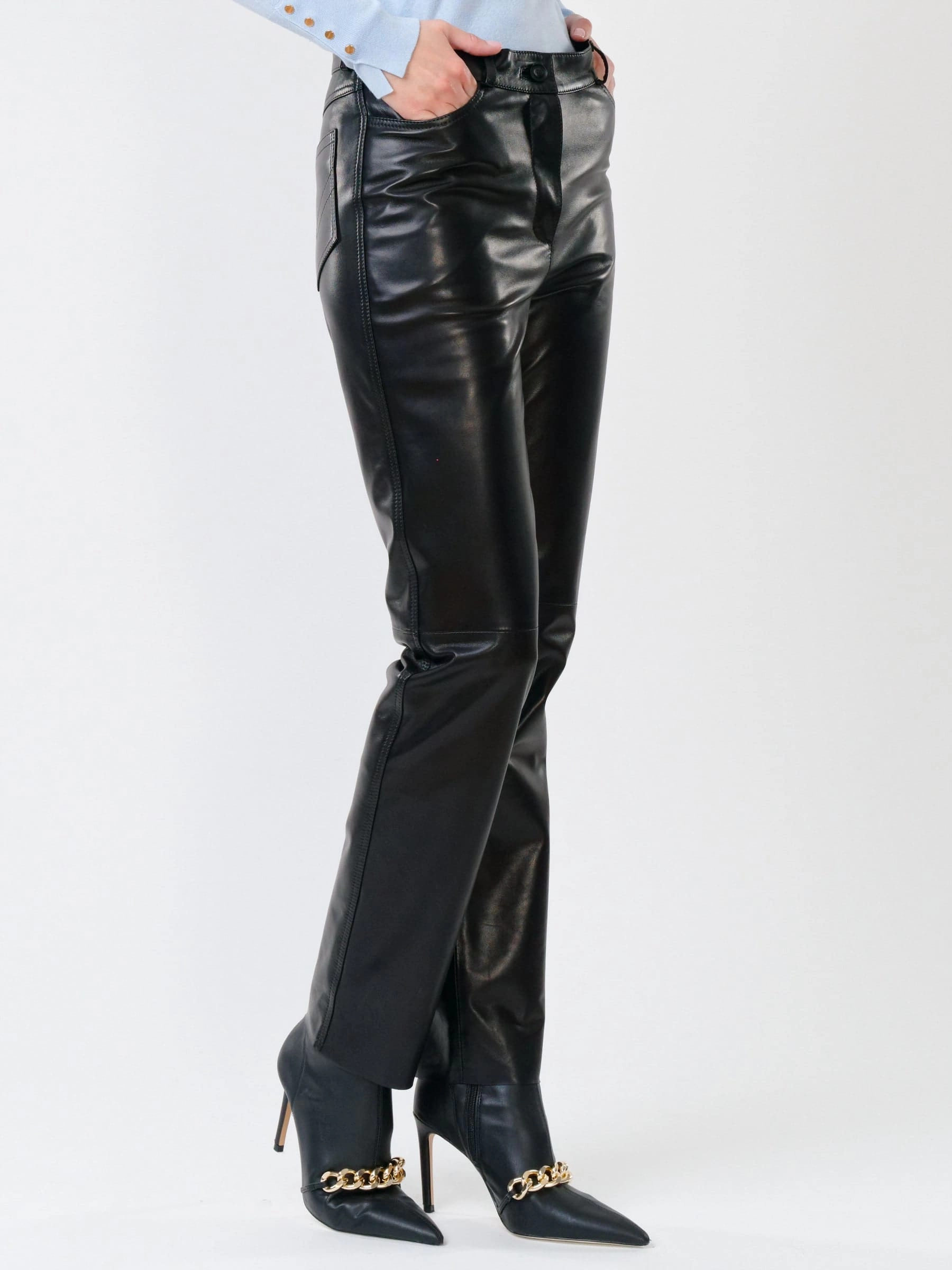 Строгие зауженные брюки из натуральной черной кожи воплощают современную элегантность. Классический прямой силуэт со средней посадкой подчеркивает женственный образ, сохраняя при этом максимальный комфорт. Идеальная длина 105 см создает визуальную стройность. Четыре продуманных кармана - два накладных спереди и два скрытых сзади - сочетают функциональность с чистотой линий. Глубокий черный цвет открывает безграничные возможности для создания образов: от офисных ансамблей с классическими блузами до дерзких вечерних луков с атласными топами или кожаными косухами. Эти брюки - образец вневременной стильности, где каждая деталь продумана для тех, кто ценит лаконичность и безупречный вкус.