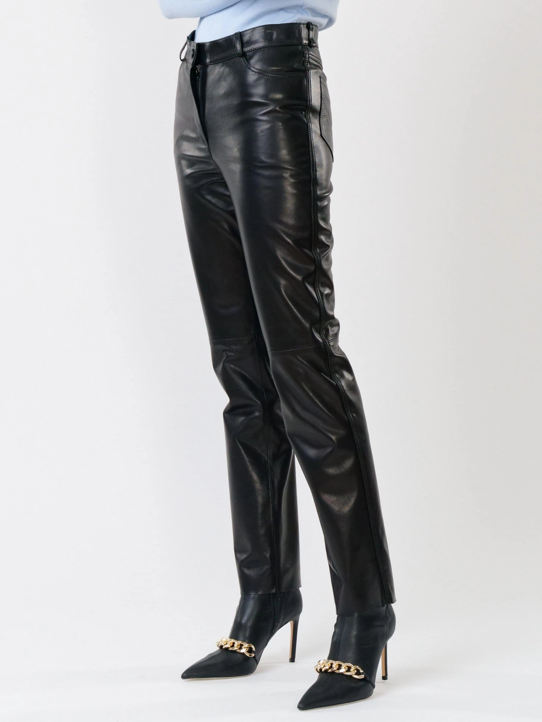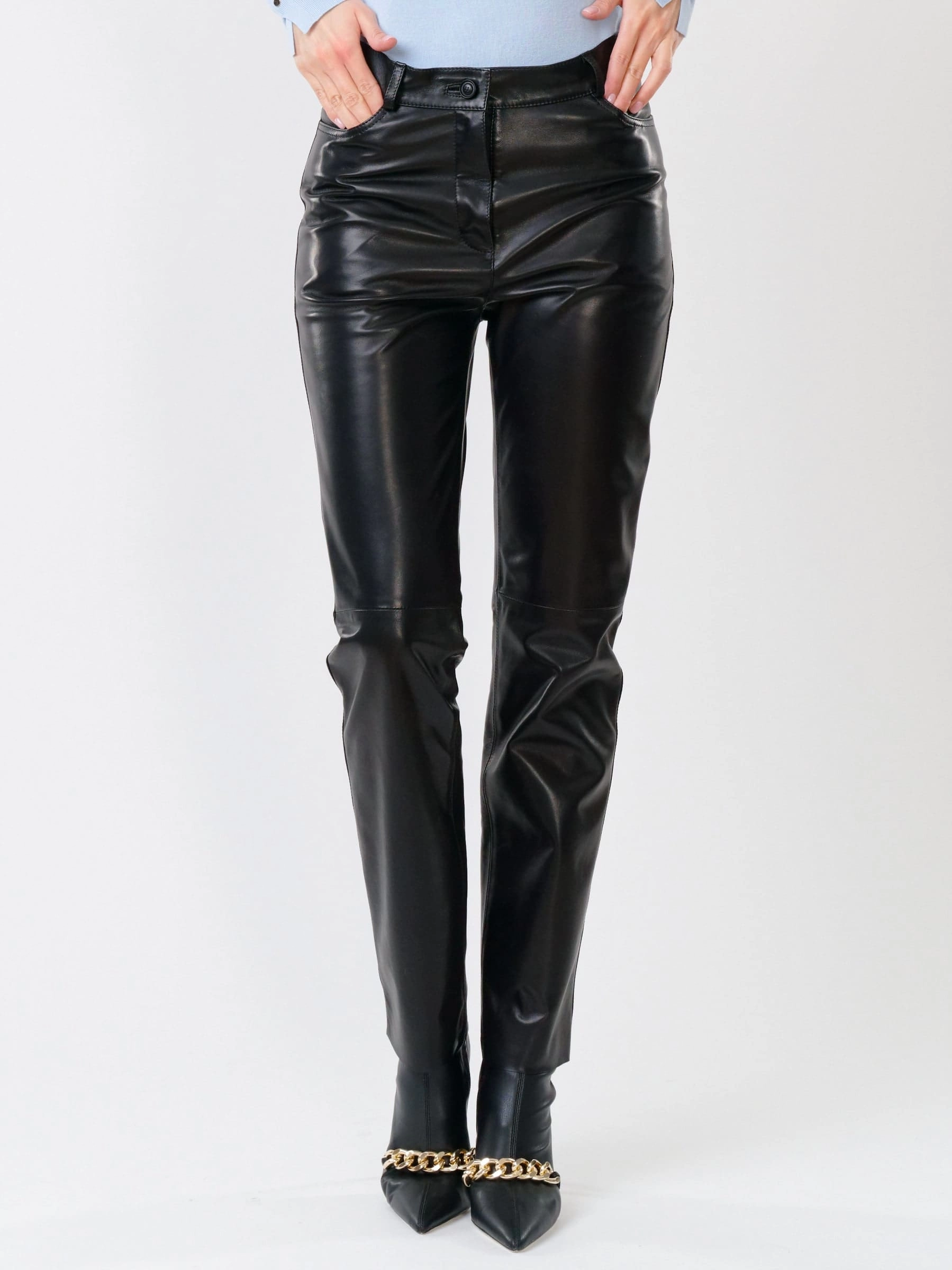 Товар черные зауженные женские кожаные брюки 02, размер 48, артикул 85232 выполнен из натуральной кожи с застежкой молния. Рассчитан на сезон: демисезон. Длина изделия 105 см, силуэт прямой.