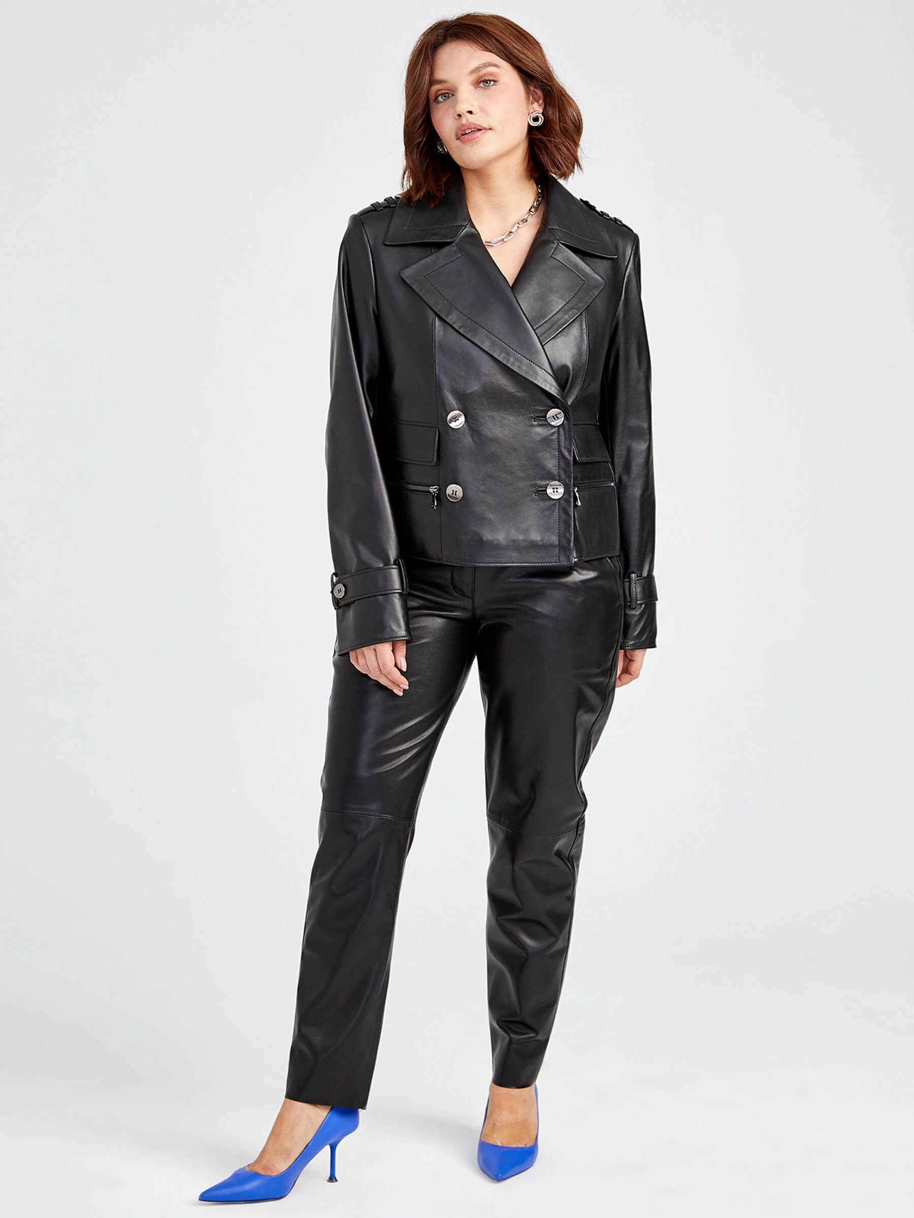 Товар черный двубортный женский кожаный пиджак 3014, размер 48, артикул 91570 выполнен из натуральной кожи с застежкой пуговицы. Рассчитан на сезон: осень-зима. Длина изделия 57 см, силуэт прямой.
