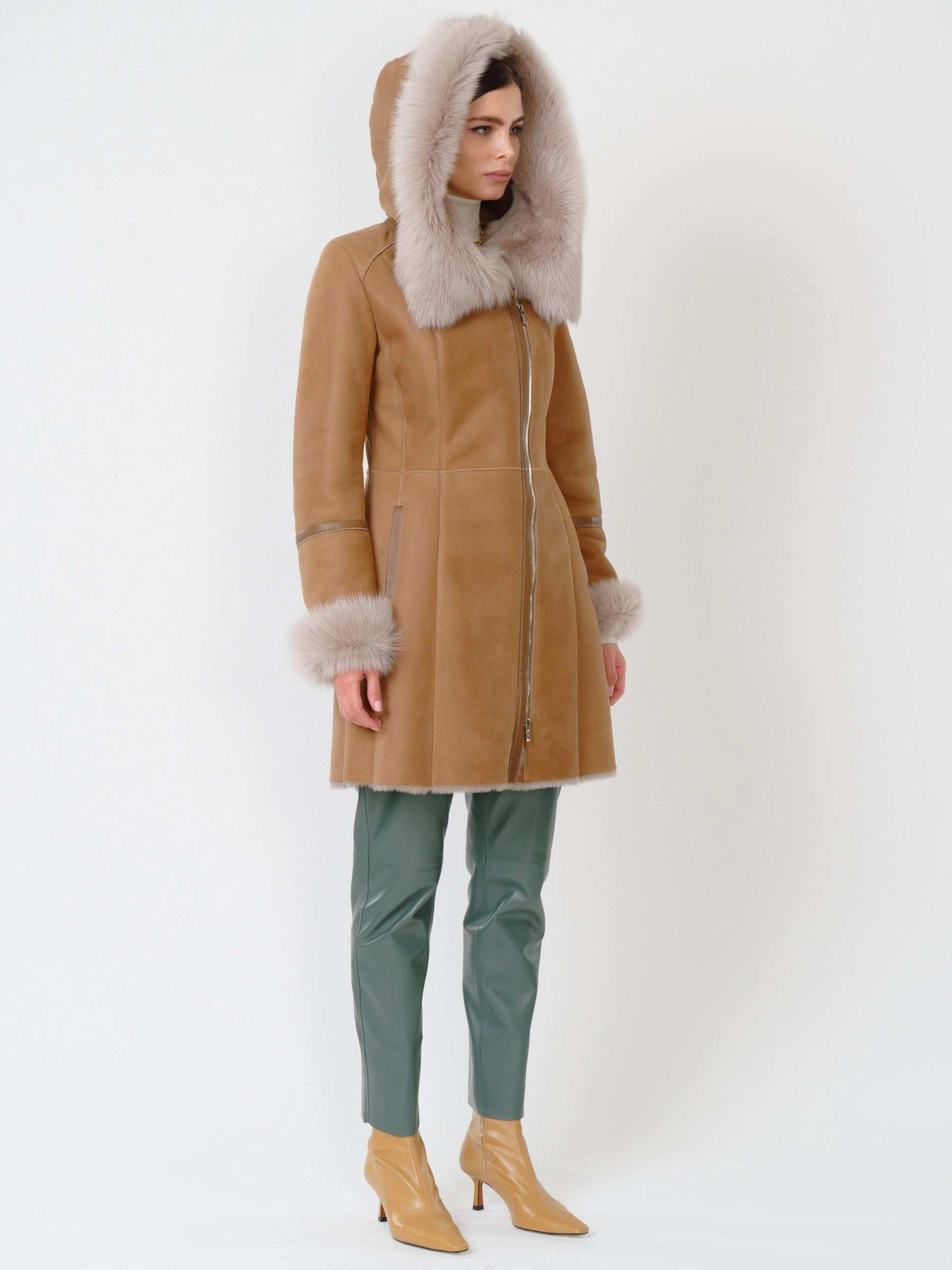 Практичная дублёнка из овчины мерино и кожаные брюки. Удобный капюшон дублёнки украшен опушью из тосканской овчины. Универсальное сочетание для холодной зимней погоды. Безупречная работа наших портных.