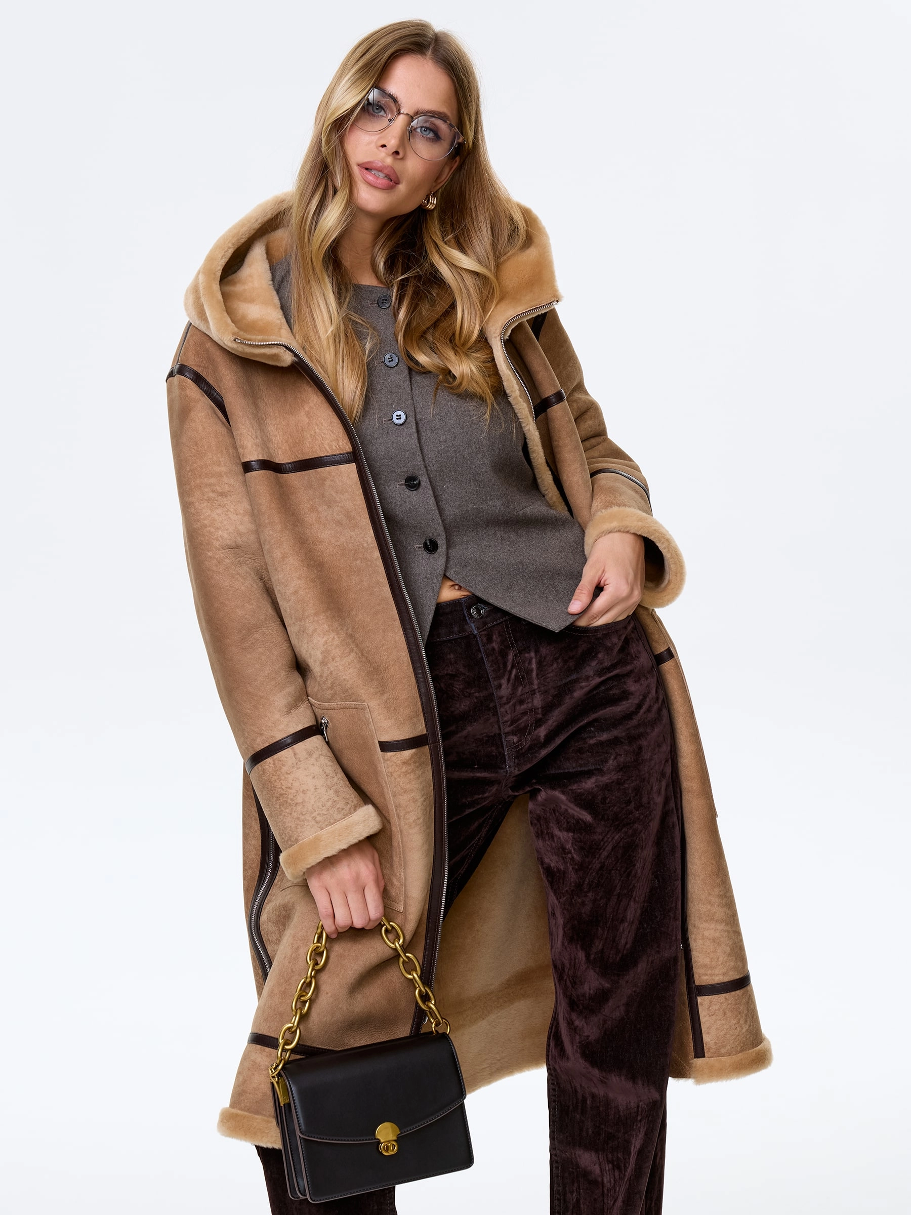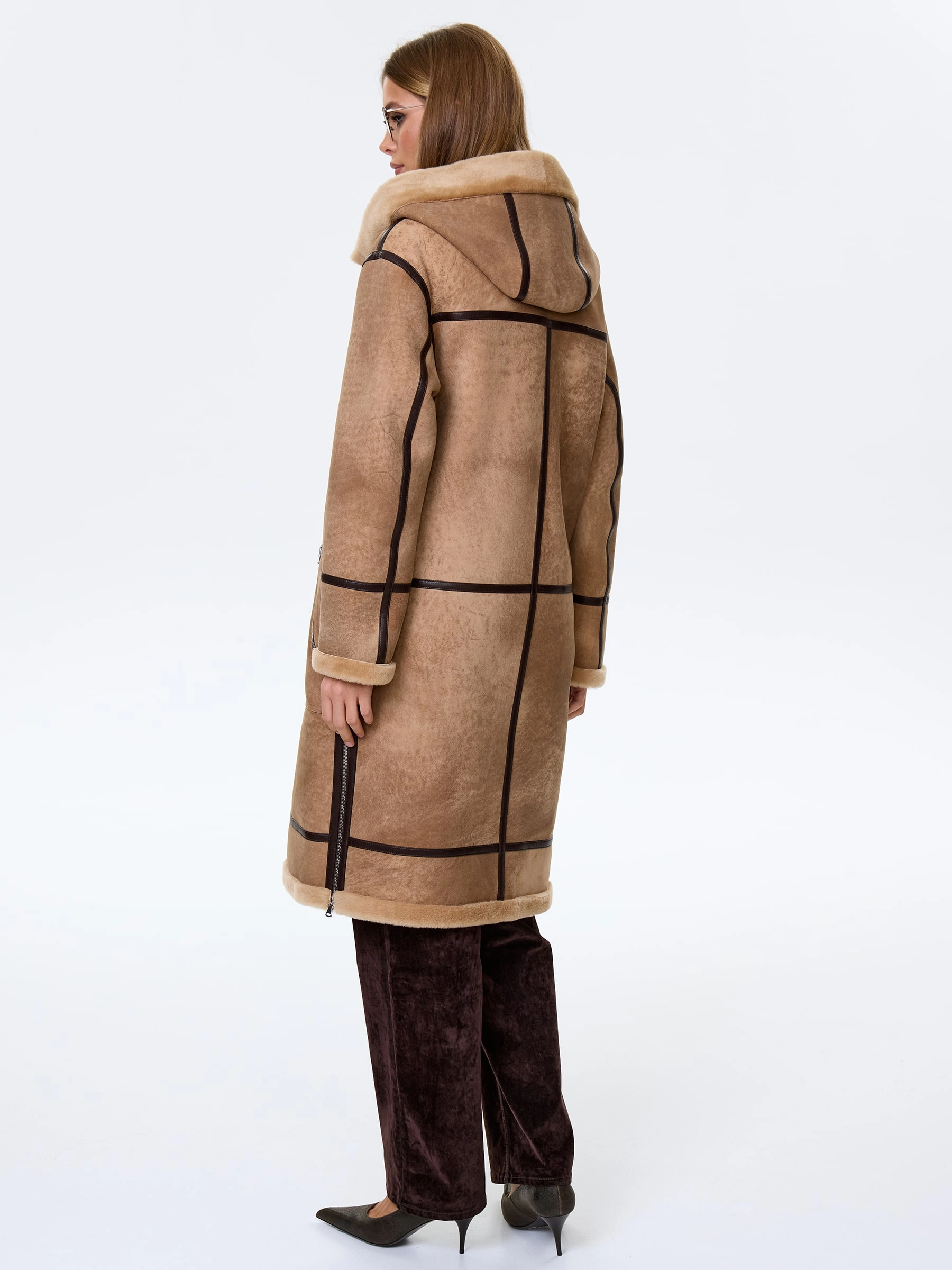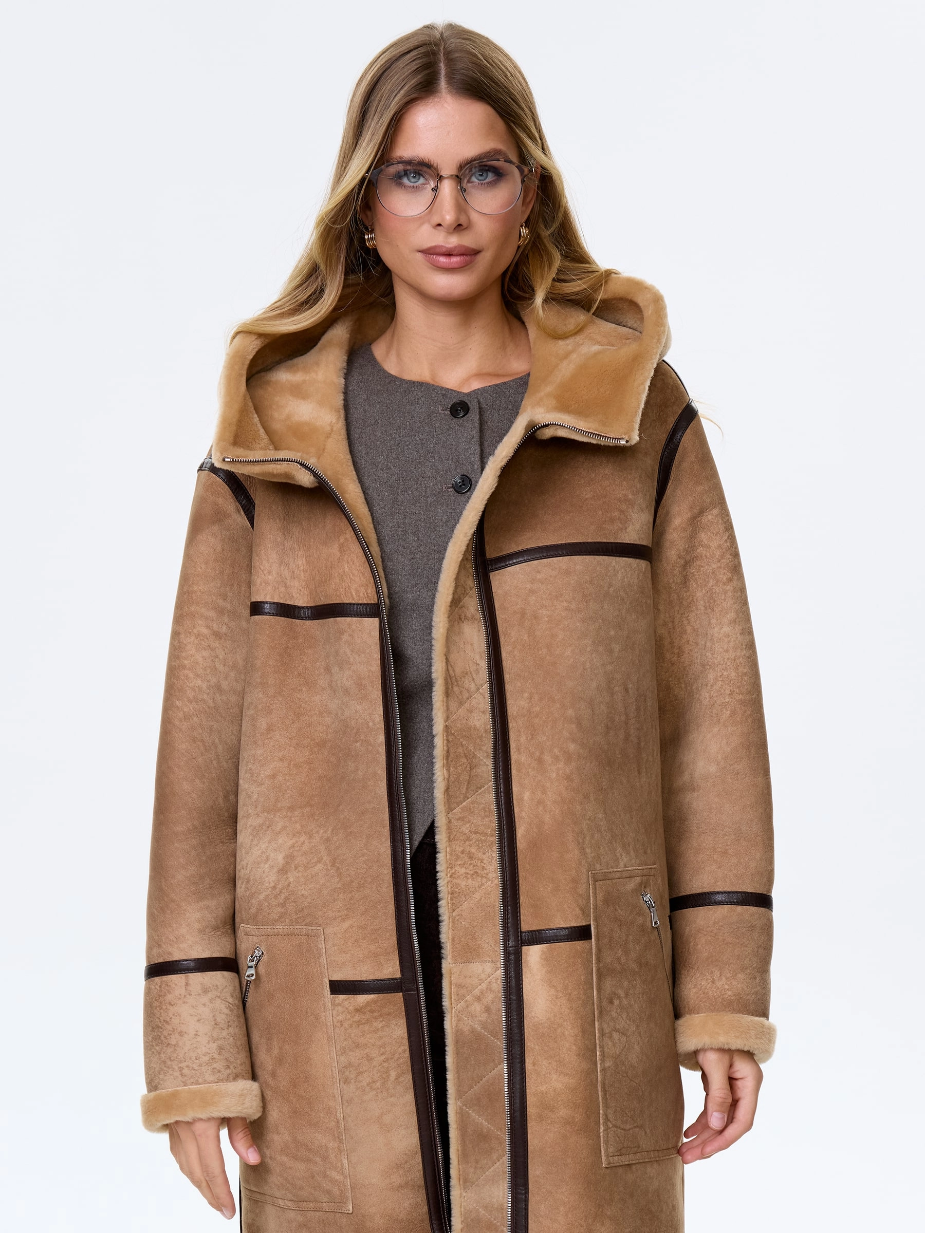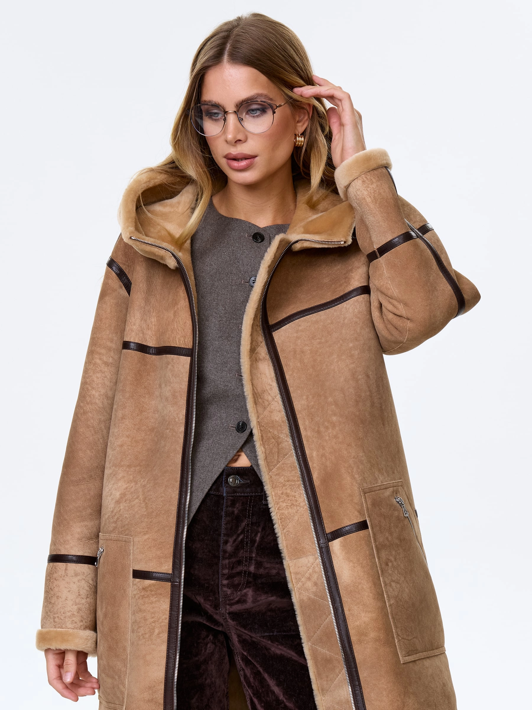 Дубленку прямого кроя выполнили из плотной мягкой овчины. Изделие с графичной отделкой из тонких кожаных кантов дополнили глубоким капюшоном и двумя боковыми карманами. Модель застегивается крупной молнией.