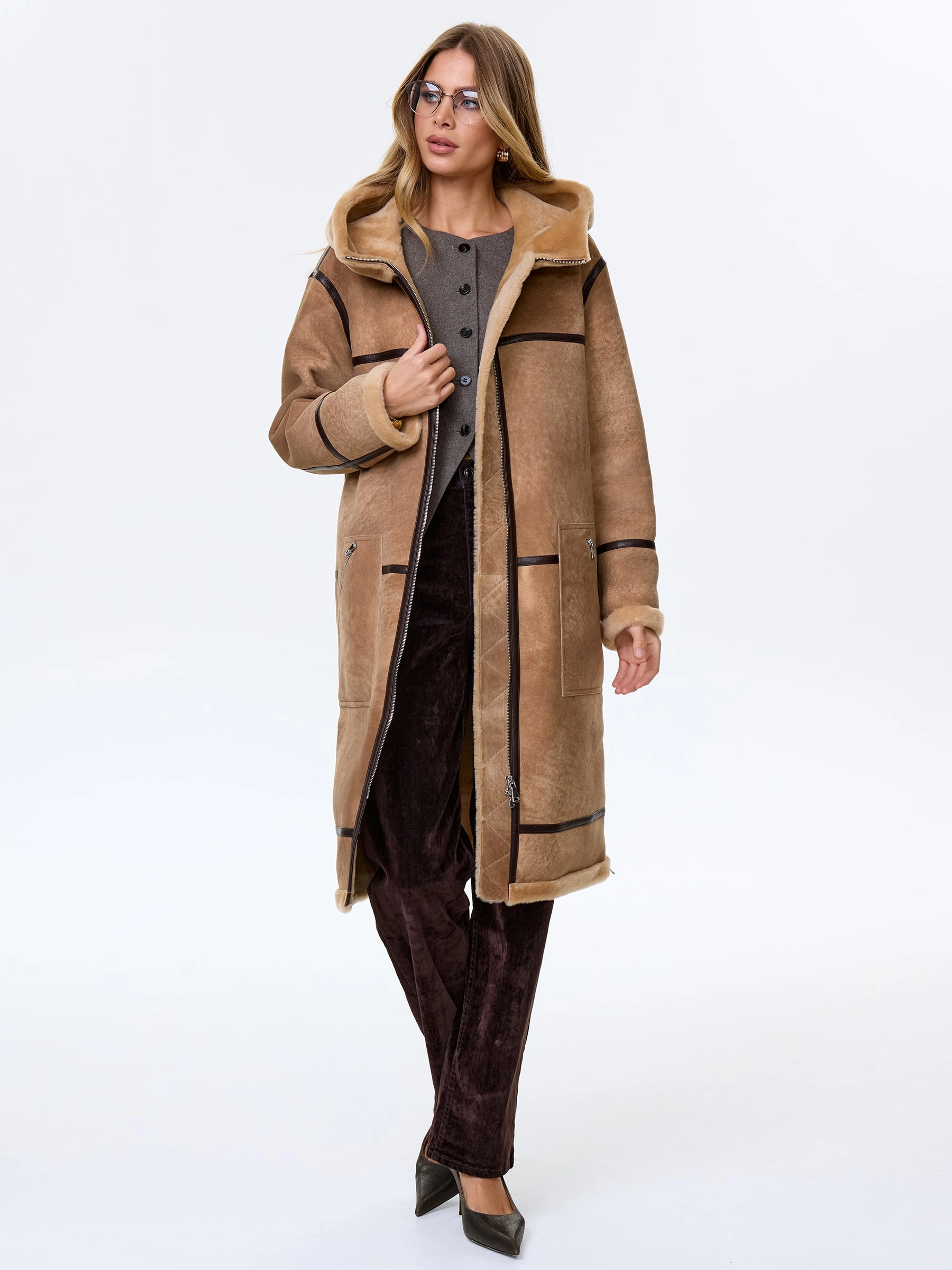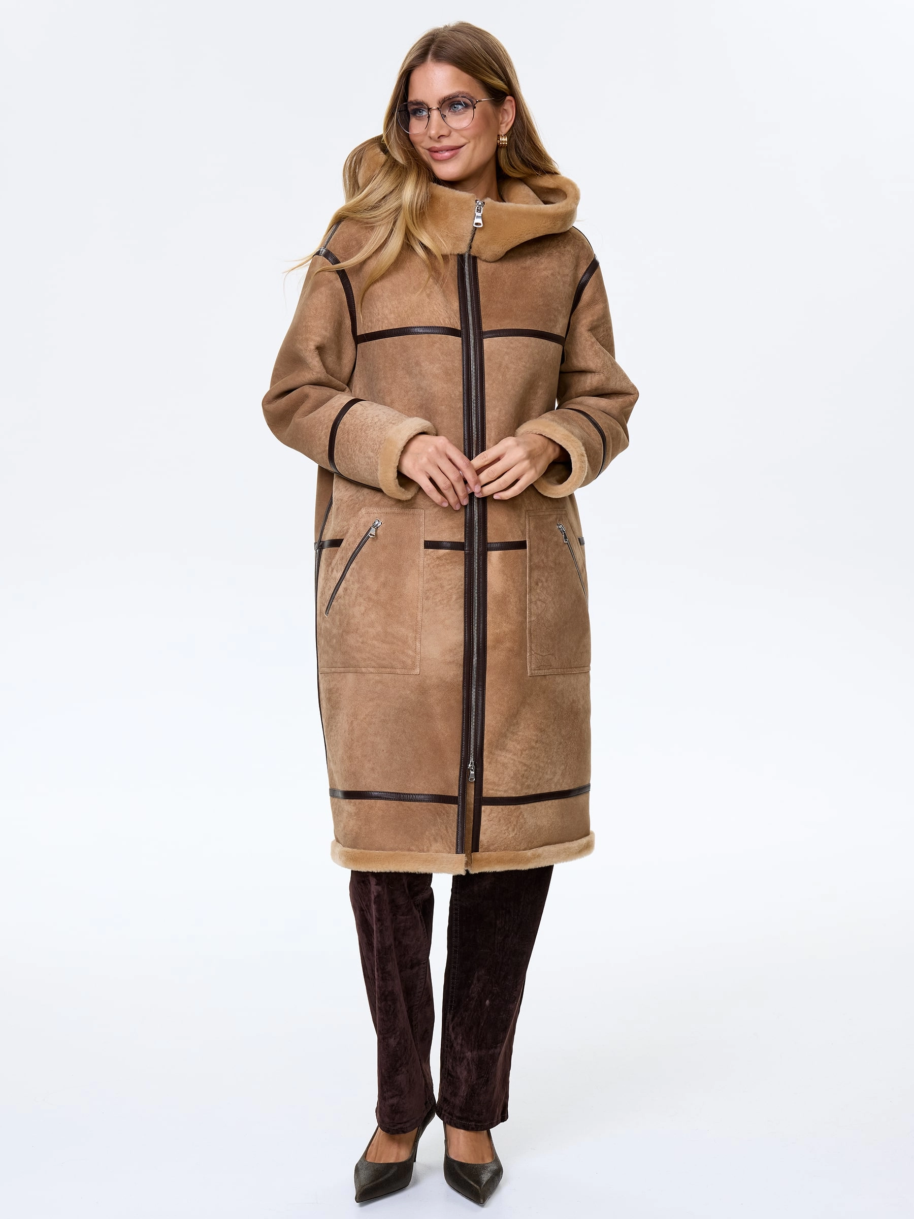 Товар длинная дубленка с объемным капюшоном для женщин премиум класса 2061, светло-коричневая, размер 44, артикул 64220 выполнен из овчина "мерино" с застежкой молния. Рассчитан на сезон: осень-зима. Длина изделия 105 см, силуэт прямой.