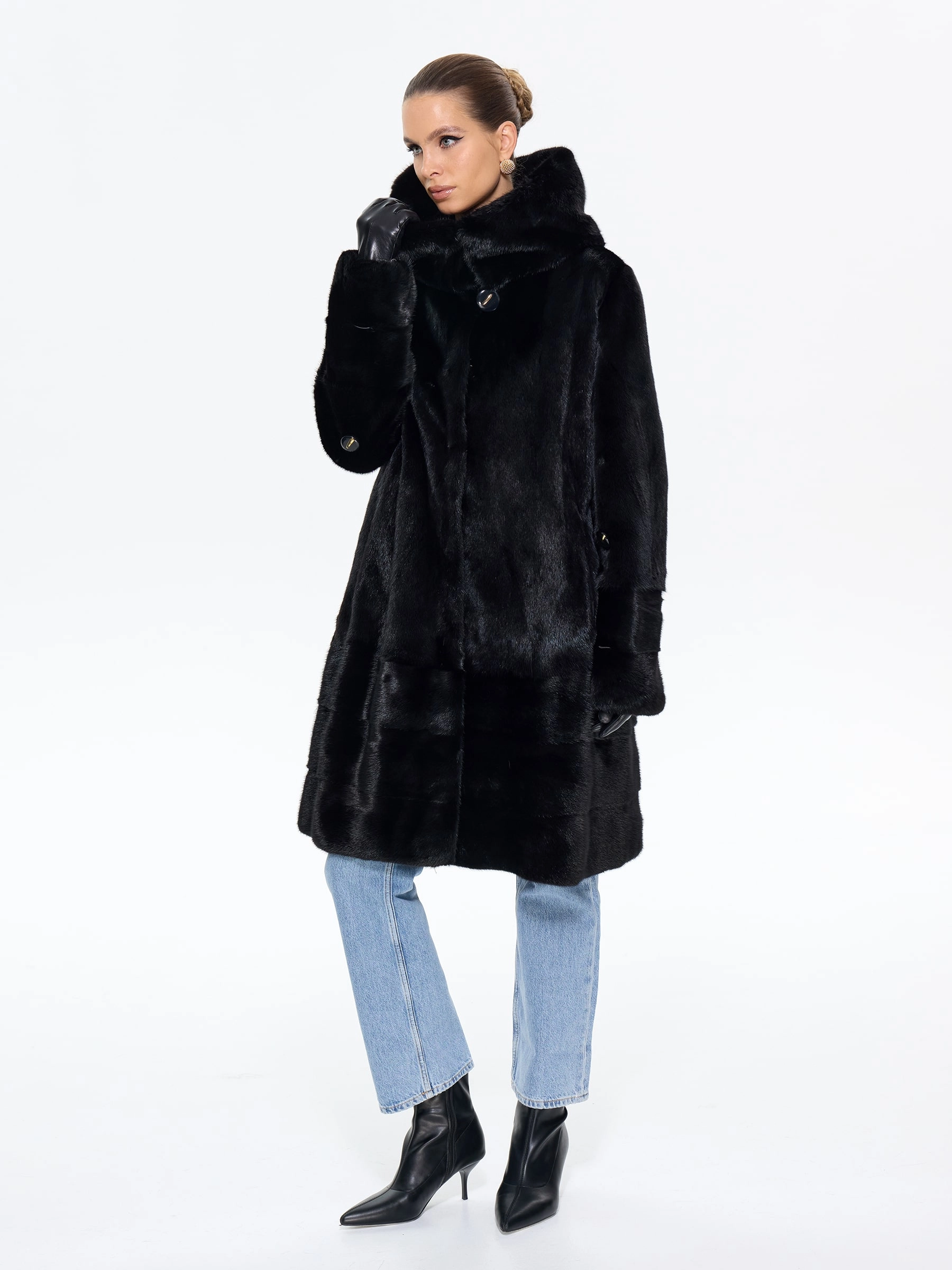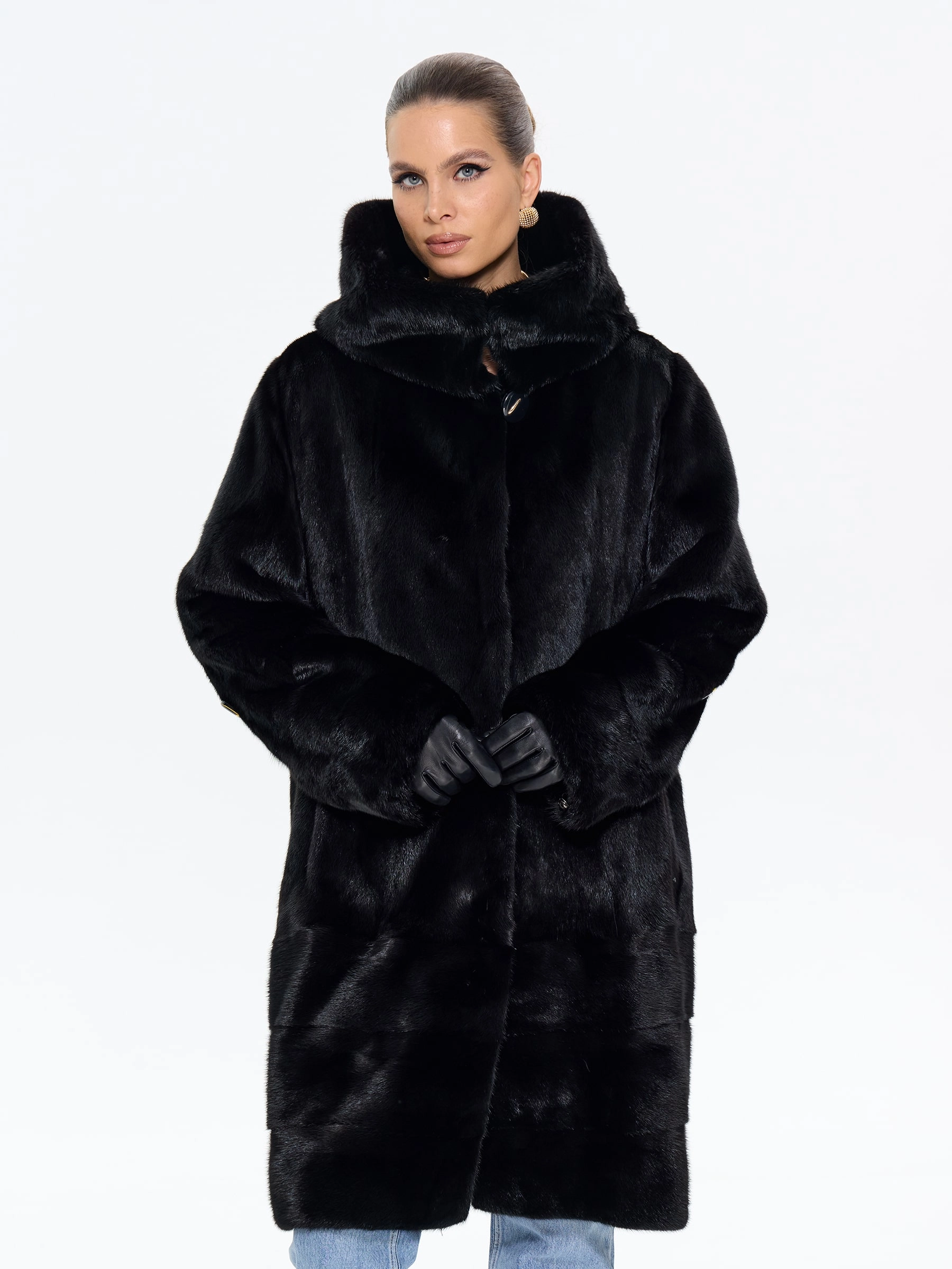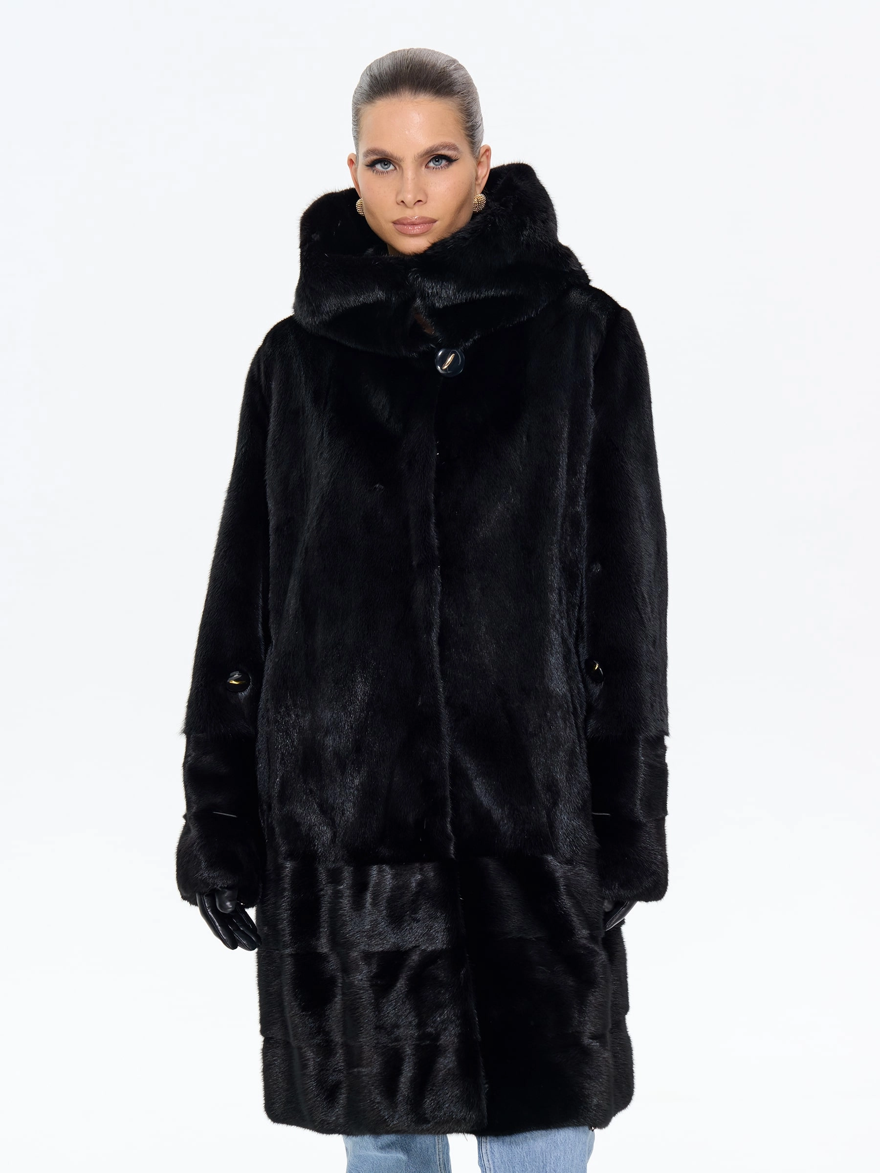 Длинная норковая женская шуба с капюшоном черного цвета — воплощение вневременной роскоши и безупречного вкуса: модель прямого классического силуэта длиной 100 см выполнили из черной норки премиум-класса с густым шелковистым ворсом, который дарит благородный блеск, невероятную мягкость и надежное тепло даже в самые холодные дни. Изысканной деталью, придающей модели особый шик, стала поперечная выкладка меха по низу изделия, создающая выразительную графику и подчеркивающая мастерство исполнения. Глубокий капюшон надежно защищает от ветра и позволяет обойтись без головного убора, а втачные рукава с возможностью регулировки длины обеспечивают идеальную посадку и дополнительный комфорт. Продуманная конструкция с подкладкой из смесовой ткани и удобные клипсы гарантируют безупречную фиксацию и бережное отношение к меху. Совет стилиста: универсальность этой шубы позволяет создавать самые разные образы — носите ее с джинсами, грубыми ботинками и объемным свитером для дерзкого повседневного лука, с кожаными брюками и