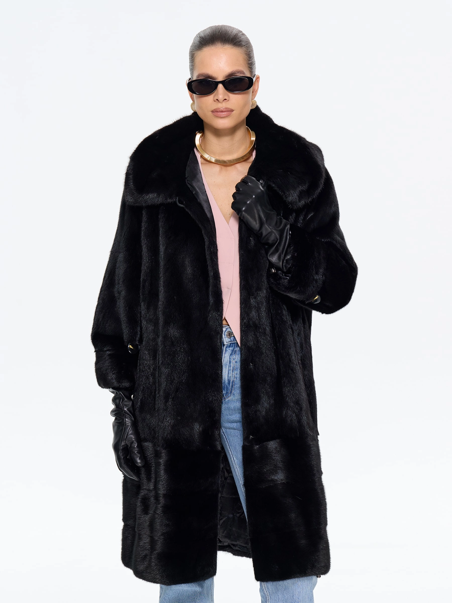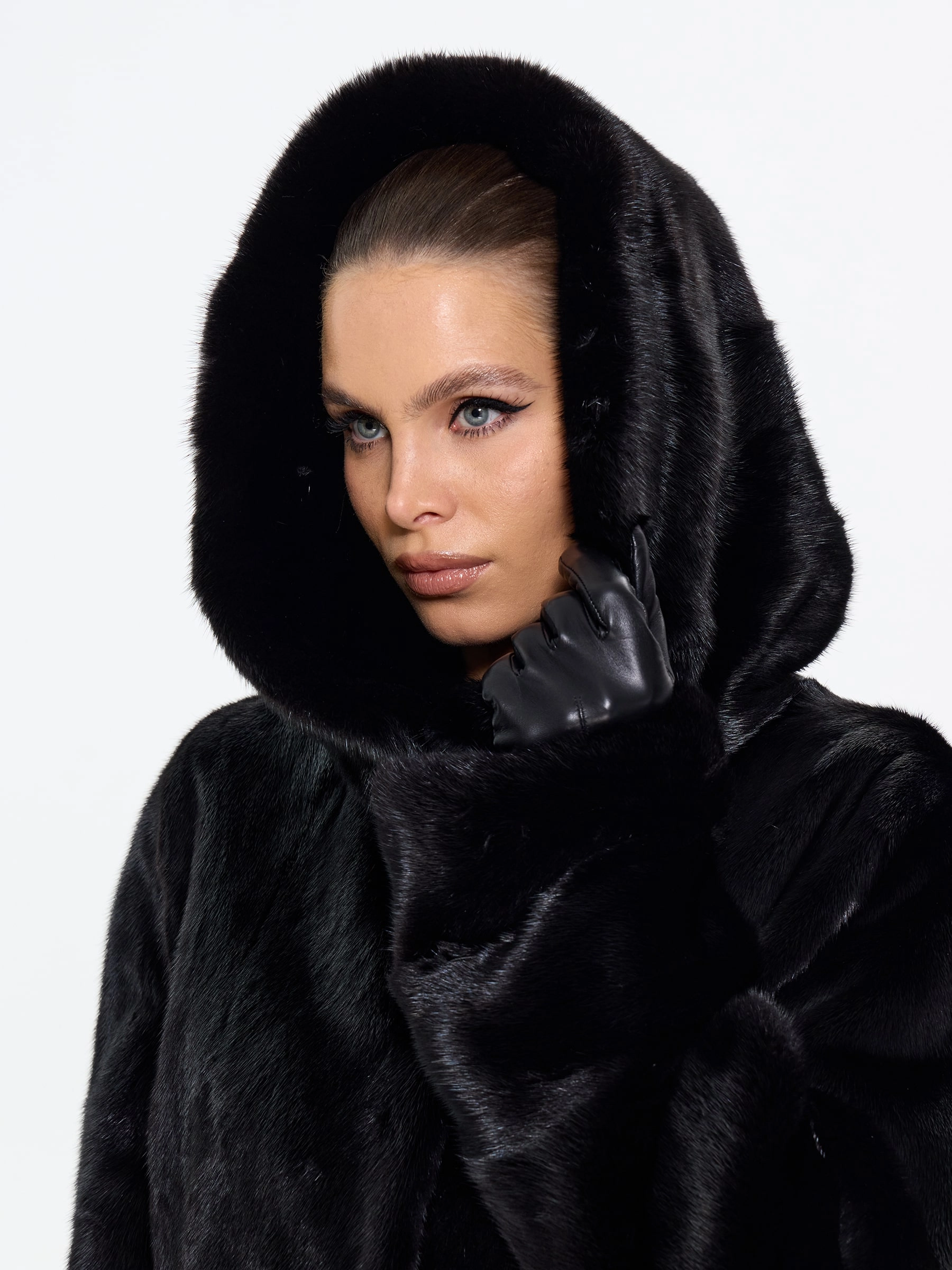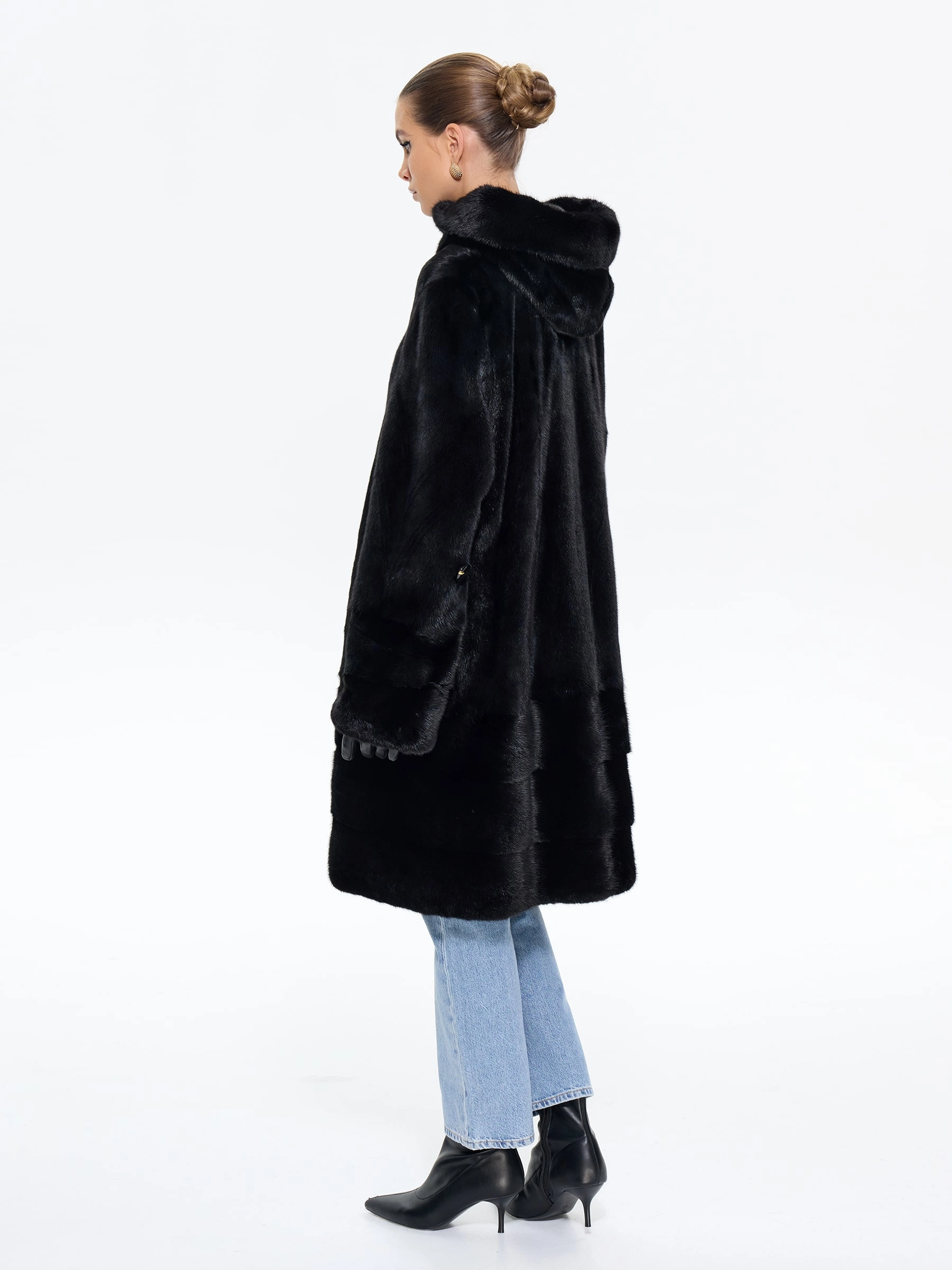Длинная норковая женская шуба с капюшоном черного цвета — воплощение вневременной роскоши и безупречного вкуса: модель прямого классического силуэта длиной 100 см выполнили из черной норки премиум-класса с густым шелковистым ворсом, который дарит благородный блеск, невероятную мягкость и надежное тепло даже в самые холодные дни. Изысканной деталью, придающей модели особый шик, стала поперечная выкладка меха по низу изделия, создающая выразительную графику и подчеркивающая мастерство исполнения. Глубокий капюшон надежно защищает от ветра и позволяет обойтись без головного убора, а втачные рукава с возможностью регулировки длины обеспечивают идеальную посадку и дополнительный комфорт. Продуманная конструкция с подкладкой из смесовой ткани и удобные клипсы гарантируют безупречную фиксацию и бережное отношение к меху. Совет стилиста: универсальность этой шубы позволяет создавать самые разные образы — носите ее с джинсами, грубыми ботинками и объемным свитером для дерзкого повседневного лука, с кожаными брюками и