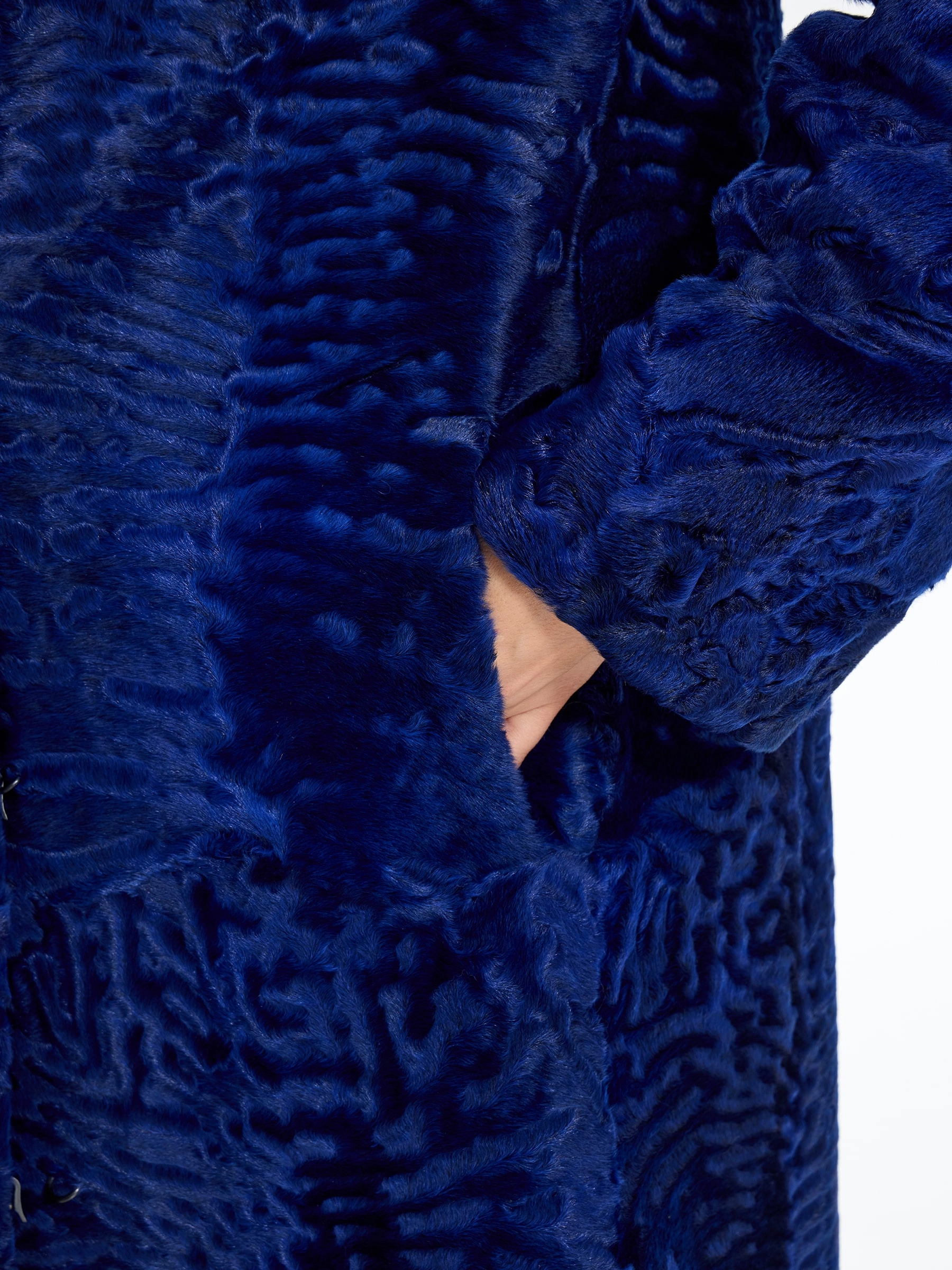Товар длинная синяя каракулевая женская шуба алиса, размер 48, артикул 65190 выполнен из мех каракульчи с застежкой клипсы. Рассчитан на сезон: весна-осень. Длина изделия 110 см, силуэт прямой.