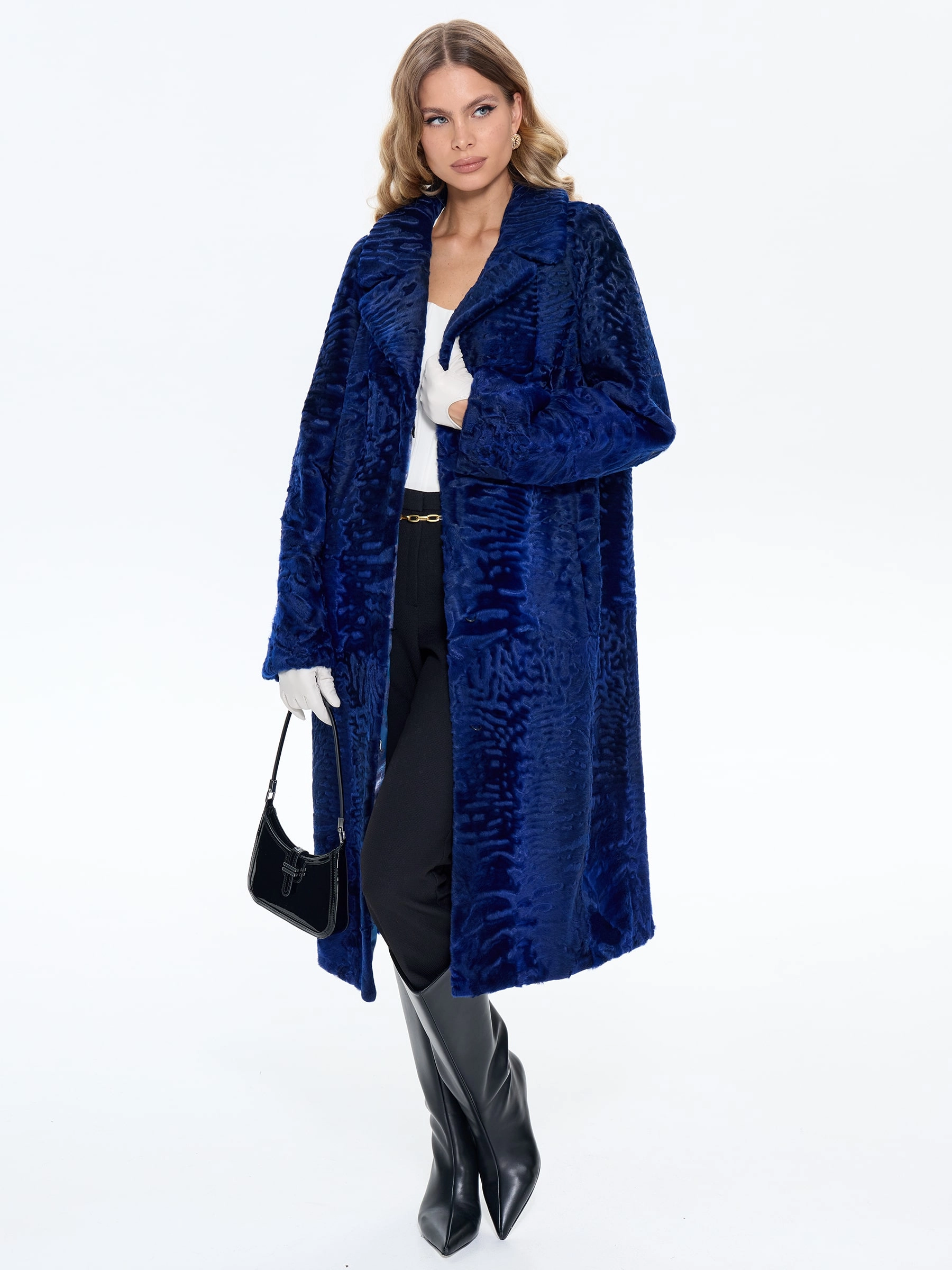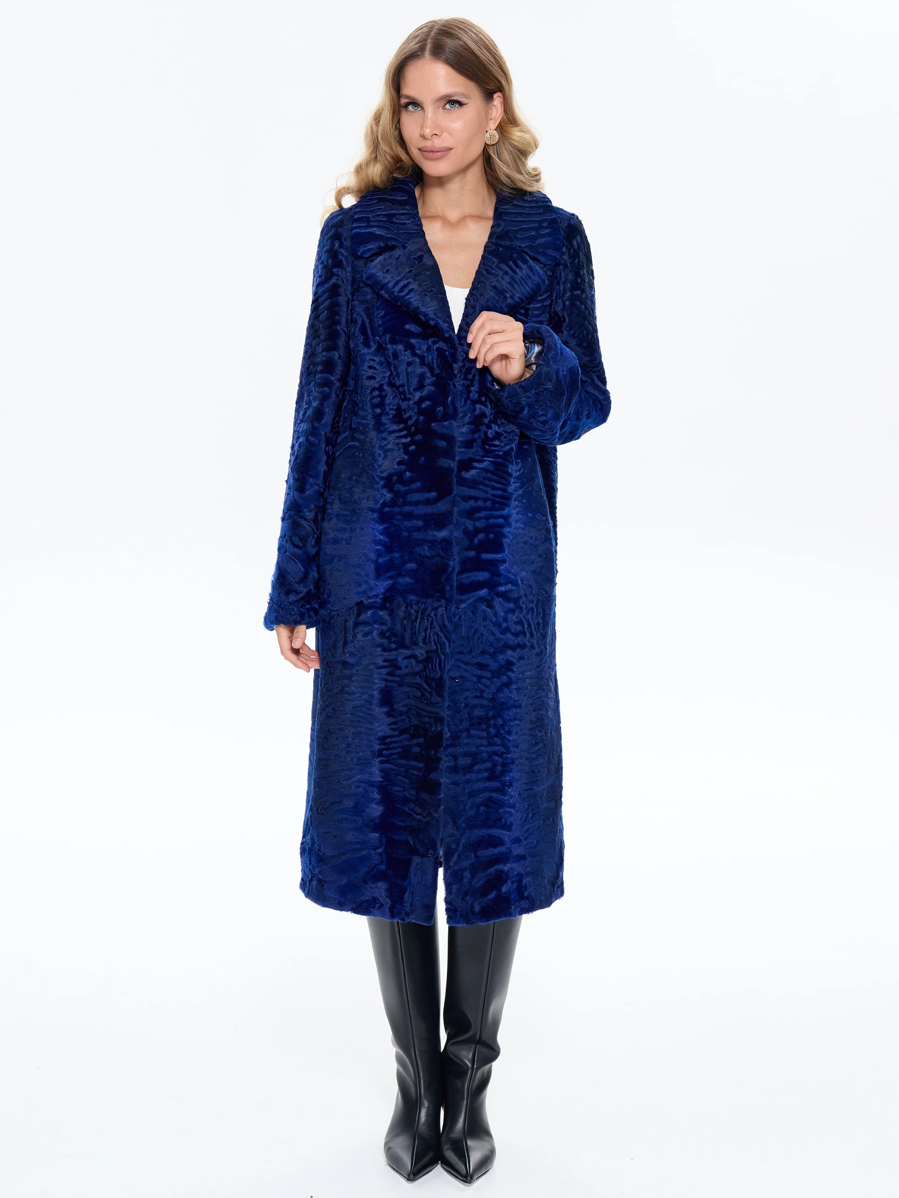Элегантная длинная шуба из шелковистого меха каракульчи с английским воротником модели «Алиса» в насыщенном синем цвете. Прямой силуэт с удлиненной шлицей сзади и уникальный муаровый рисунок меха создают образ утонченной роскоши, обеспечивая одновременно свободу движения и безупречный вид. Рекомендация стилиста: сочетайте эту модель с облегающими брюками-дудочками и туфлями-лодочками для дневного выхода или с платьем-футляром и клатчем для вечернего мероприятия. Идеальный выбор для ценительниц классического шика и благородной элегантности.