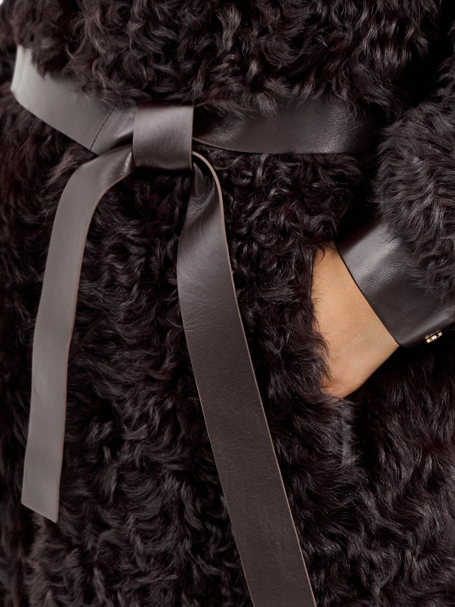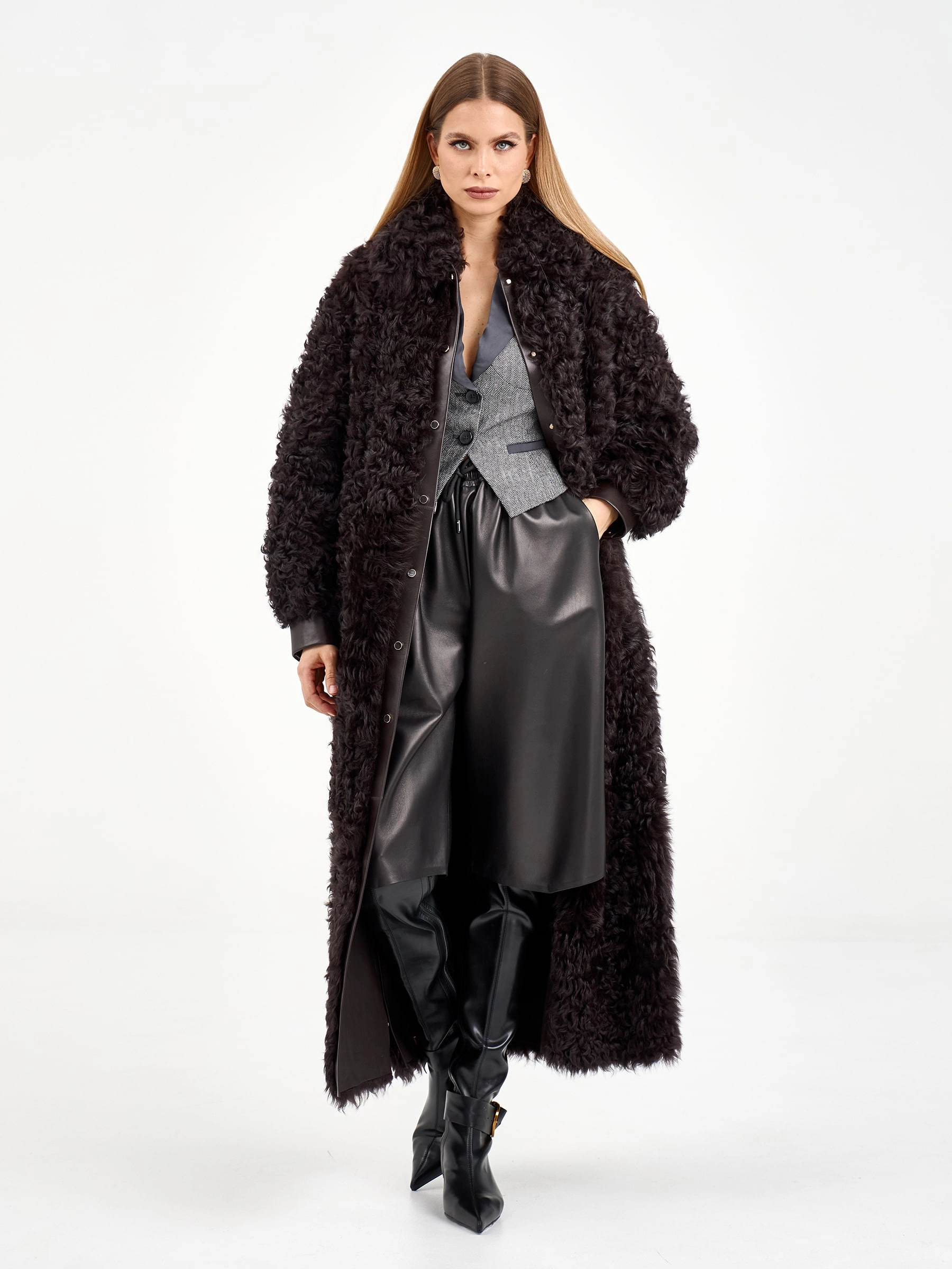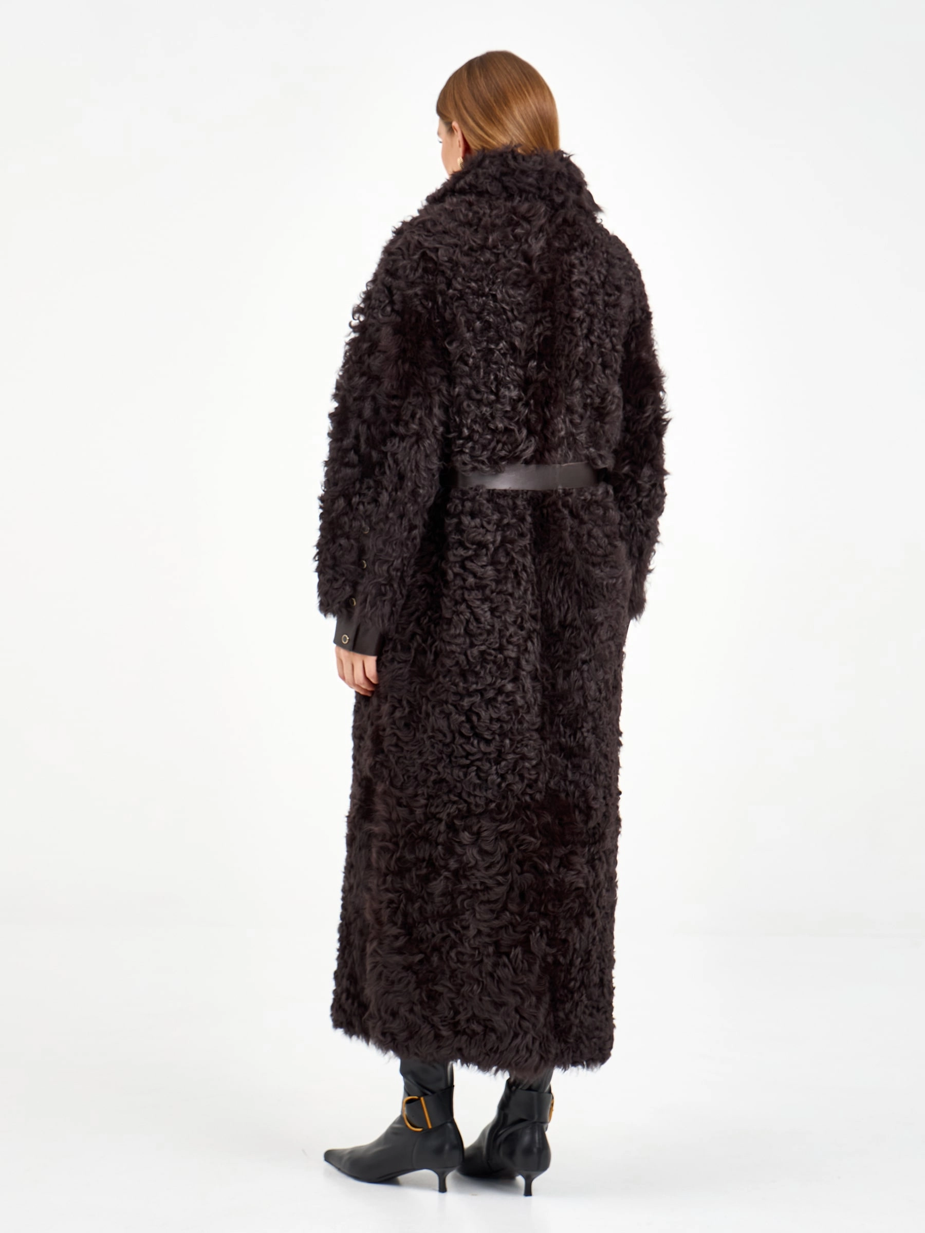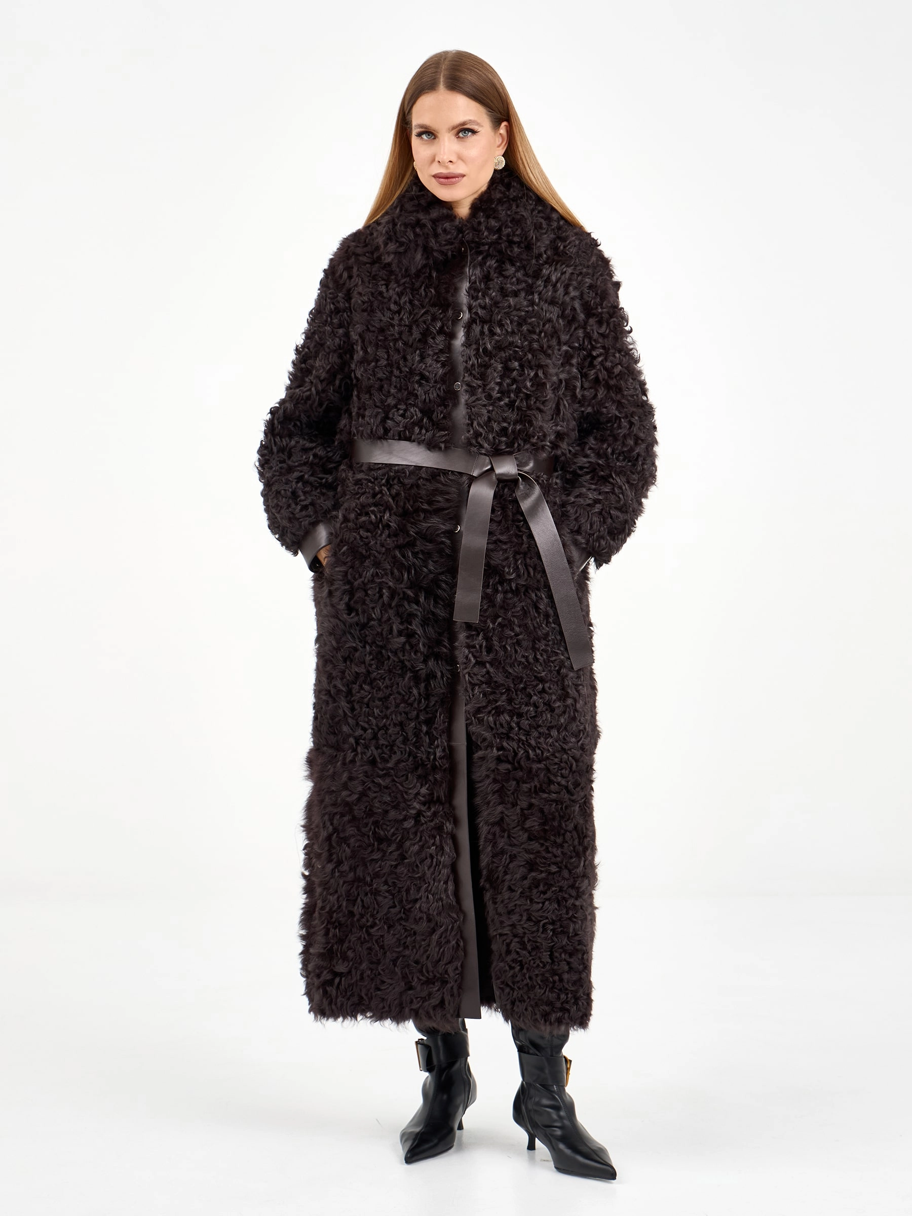 Эта длинная дубленка из натуральной овчины без капюшона, с густым крупным завитком, обеспечивает превосходное тепло и становится главной инвестицией в ваш зимний гардероб. Модель свободного кроя с элегантным отложным воротником и застежкой на кнопки подчеркивает непринужденную роскошь, а широкий пояс позволяет менять силуэт от расслабленного до собранного. Стилисты рекомендуют носить ее с объемным свитером, кожаными легинсами и грубыми ботинками для создания модного контраста или с платьем-чехлом и сапогами-ботфортами для элегантного образа — это идеальное сочетание стиля, уюта и практичности.