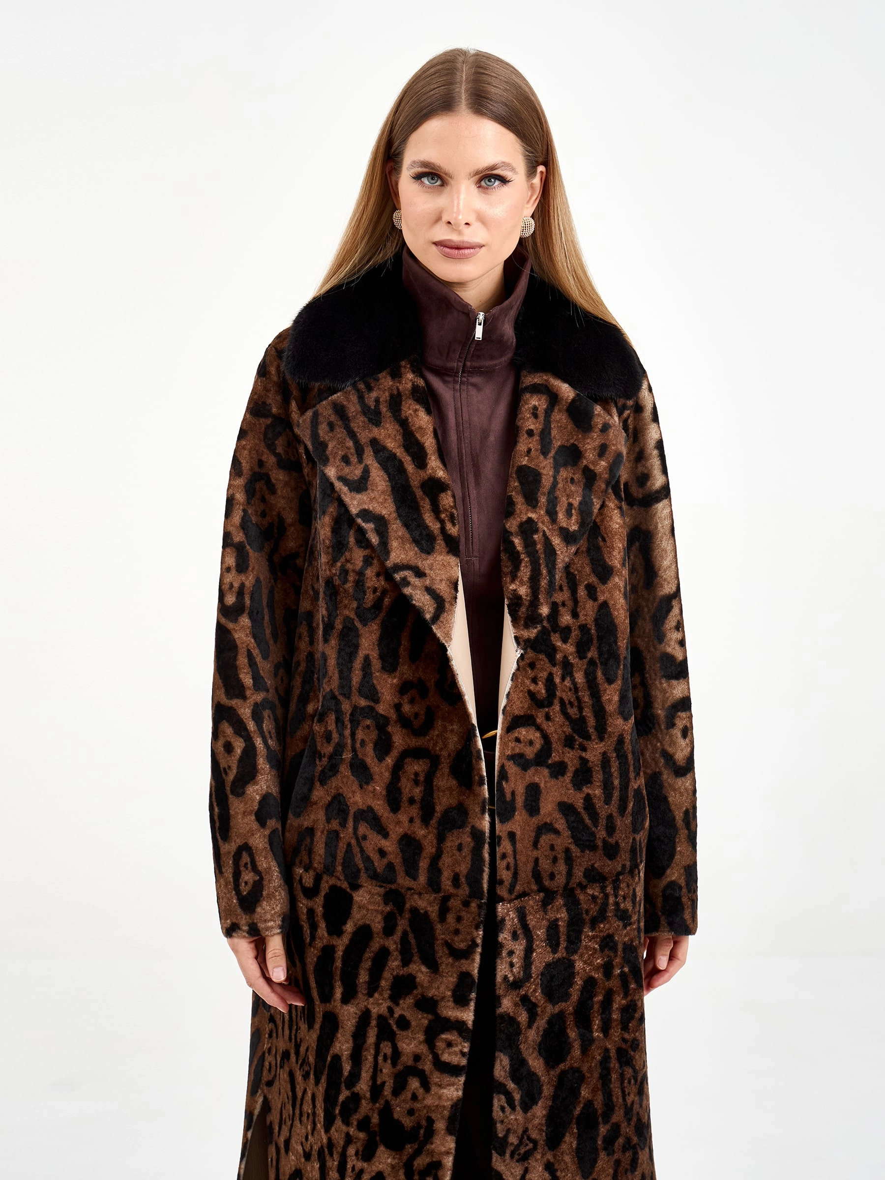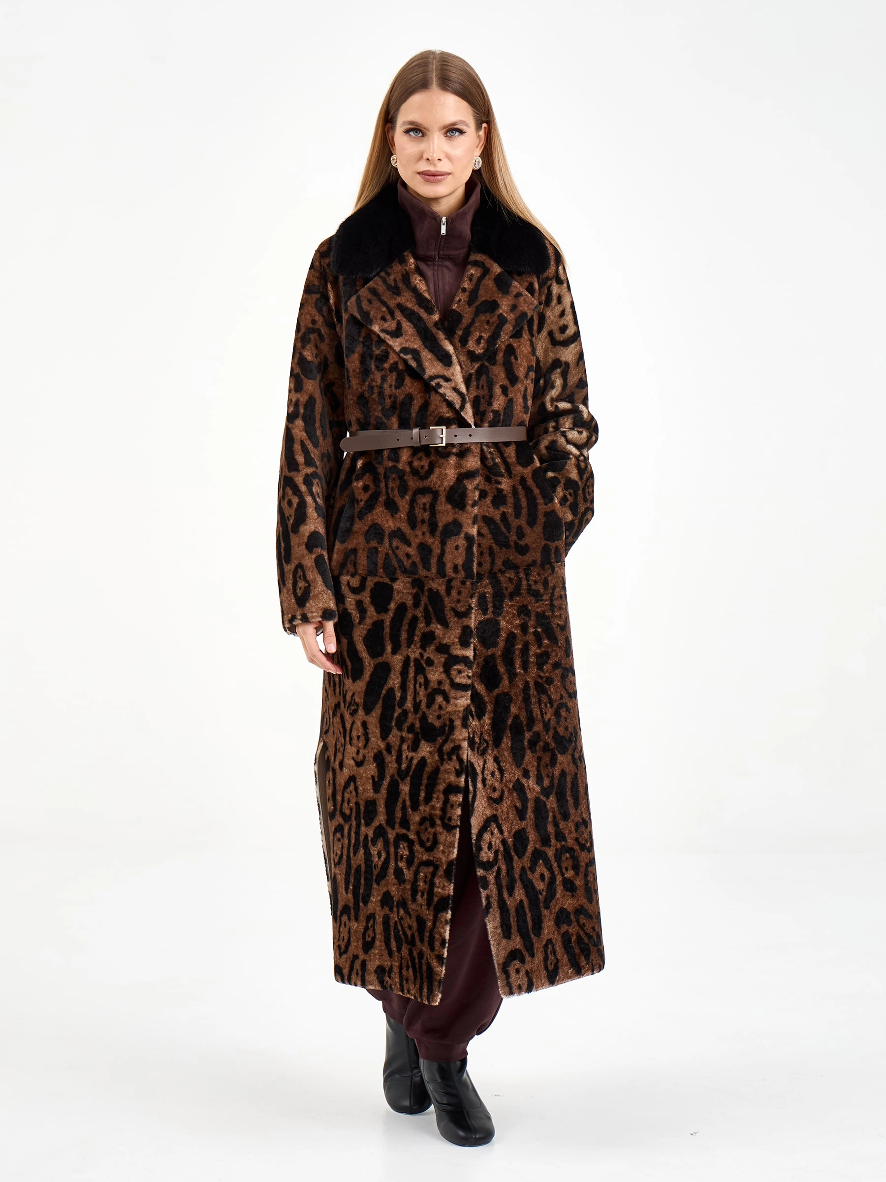 Длинная дубленка из натуральной овчины с леопардовым принтом и роскошным воротником из норки — это воплощение элегантности и комфорта. Свободный силуэт и спущенный рукав создают непринужденный образ, который легко дополнить поясом для акцента на талии. Стилисты рекомендуют носить эту модель с однотонными базовыми вещами — например, с черными брюками-клеш и водолазкой, чтобы позволить принту и текстуре норки стать главным акцентом образа.