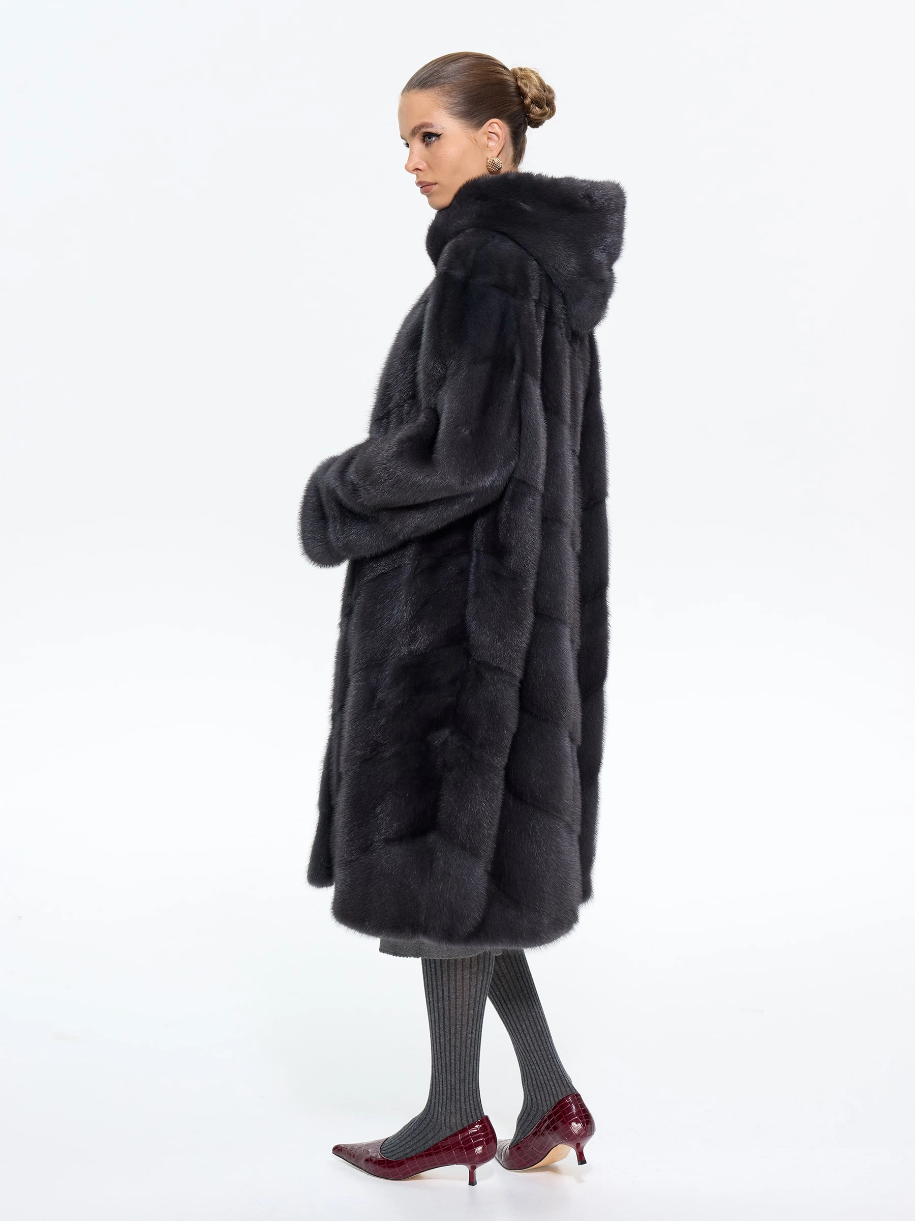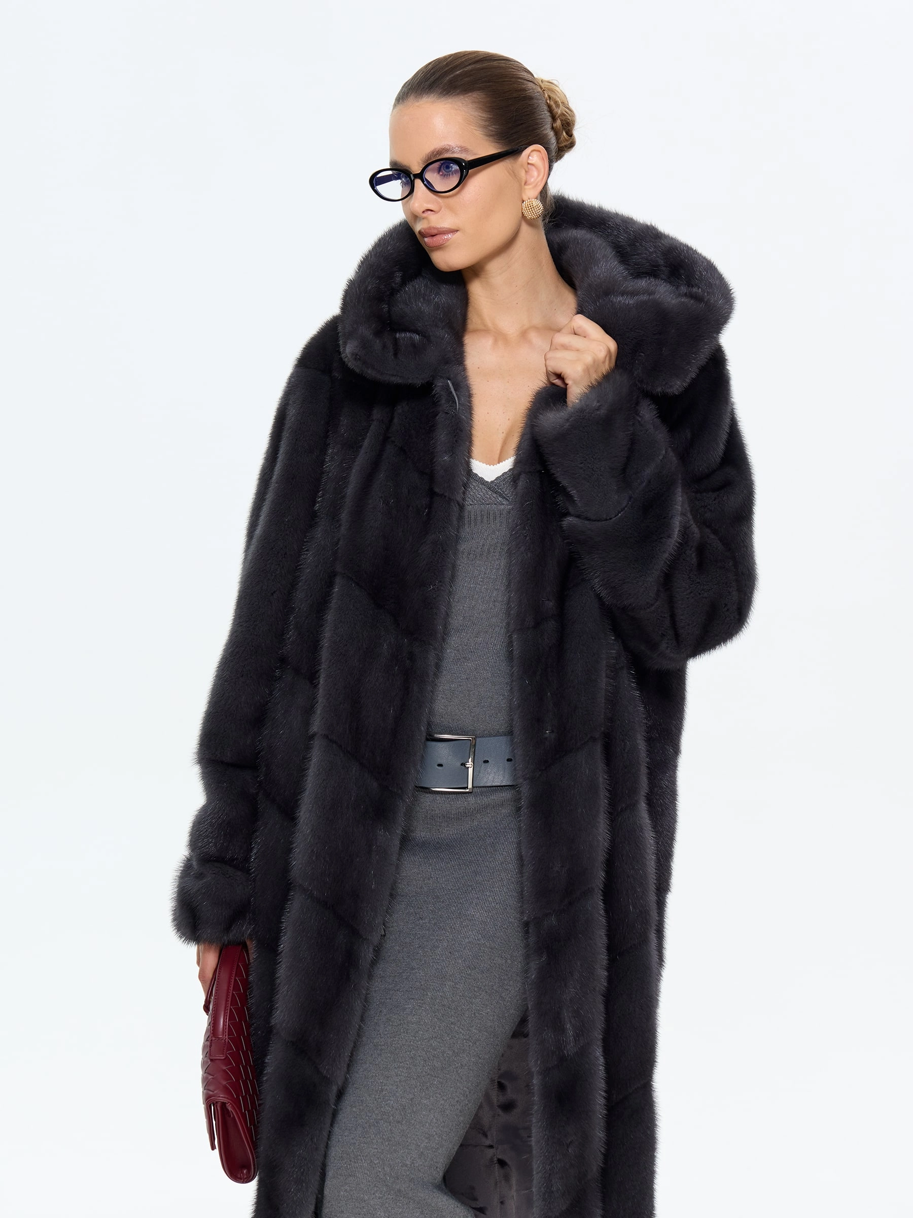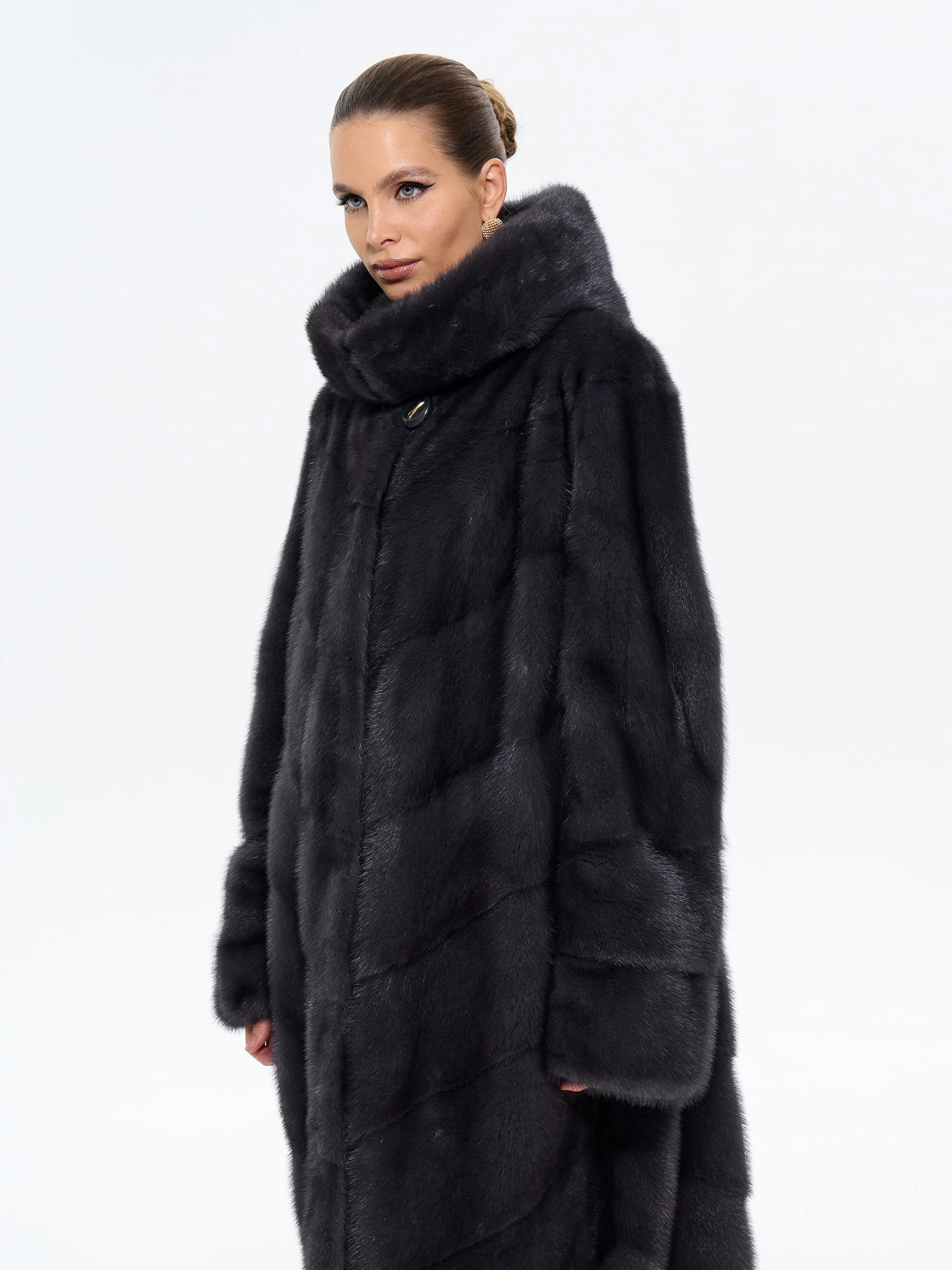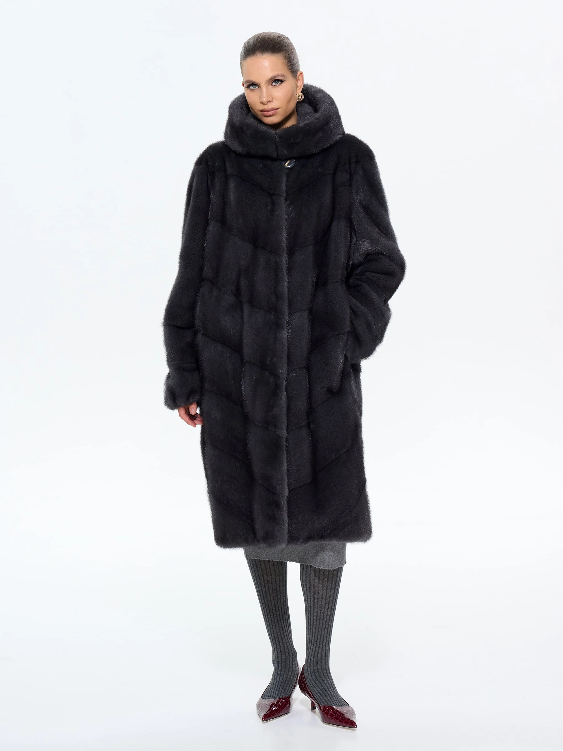 Классическая шуба из меха норки с капюшоном в насыщенном цвете «графит» — это воплощение современной роскоши. Модель длиной 100 см выполнена в прямом крое с эффектной диагональной раскладкой меха, что создает изящную игру света на поверхности. Практичный глубокий капюшон, регулируемые по длине рукава и удобные карманы делают ее не только стильной, но и функциональной. Совет от стилистов: эта шуба станет главной героиней вашего гардероба. Для повседневного образа сочетайте ее с объемным свитером, узкими джинсами и ботильонами на каблуке, а для вечернего выхода — набросьте на элегантное платье-футляр и дополните лакированными аксессуарами. Эта вещь дарит не только тепло, но и неповторимое ощущение уверенности, подчеркивая ваш безупречный вкус в любой ситуации.
