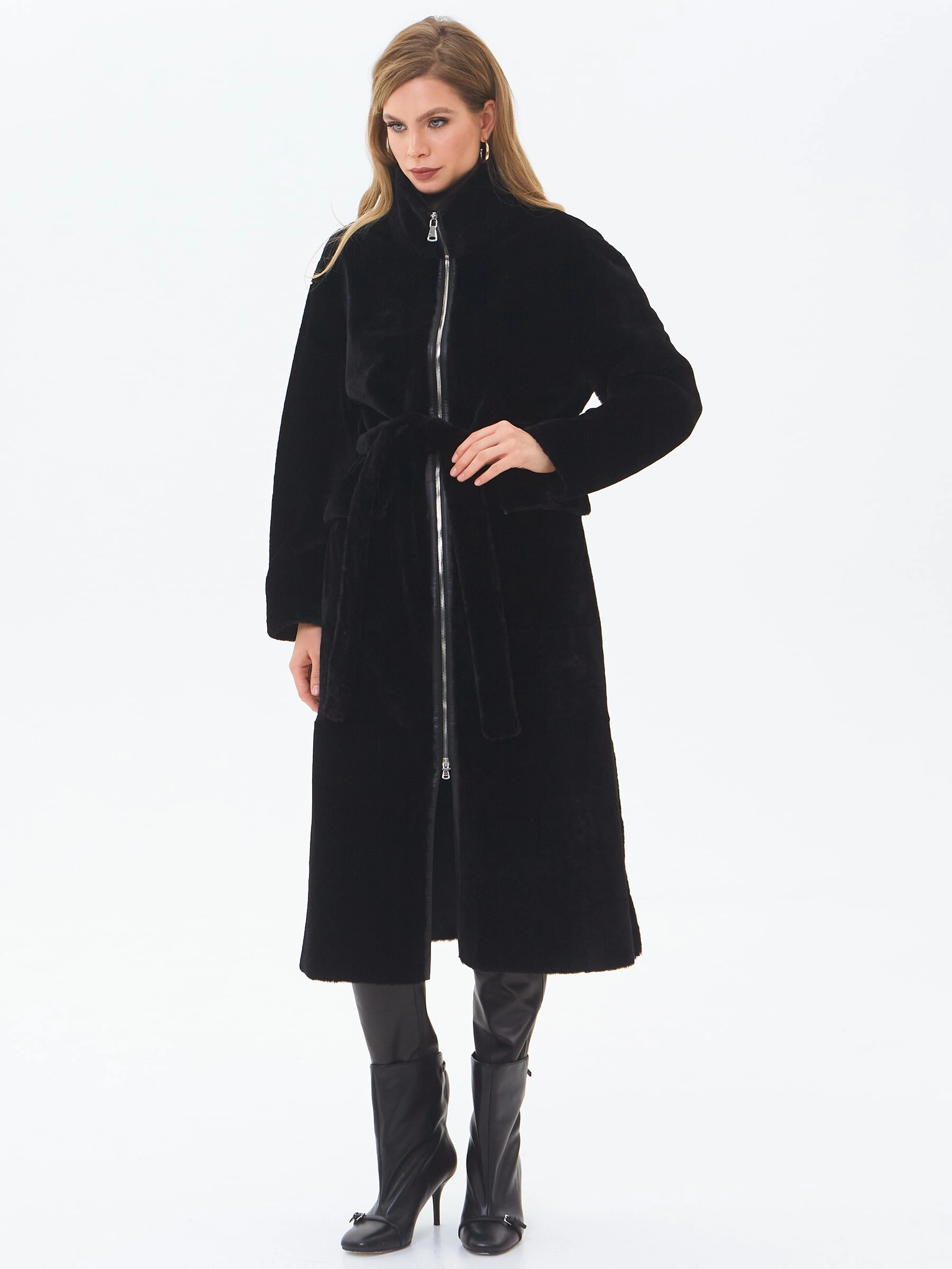 Длинную шубу с воротником стойка и накладными карманами закрывающиеся клапанами сшили из меха астраган. Лицевую сторону оставили с густым ворсом, а изнаночную сделали гладкой матовой. Модель свободного кроя застегивается двухзамковой молнией.