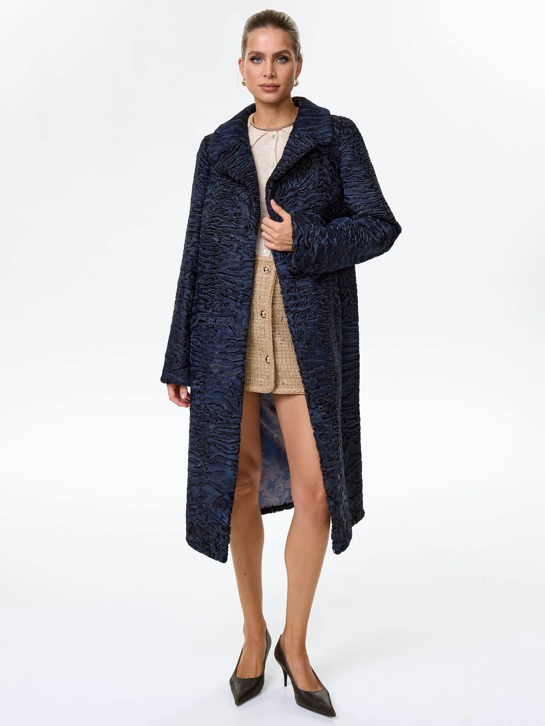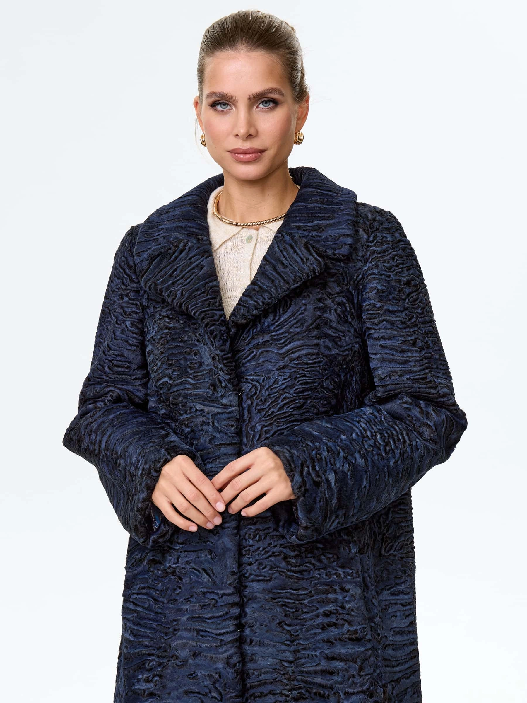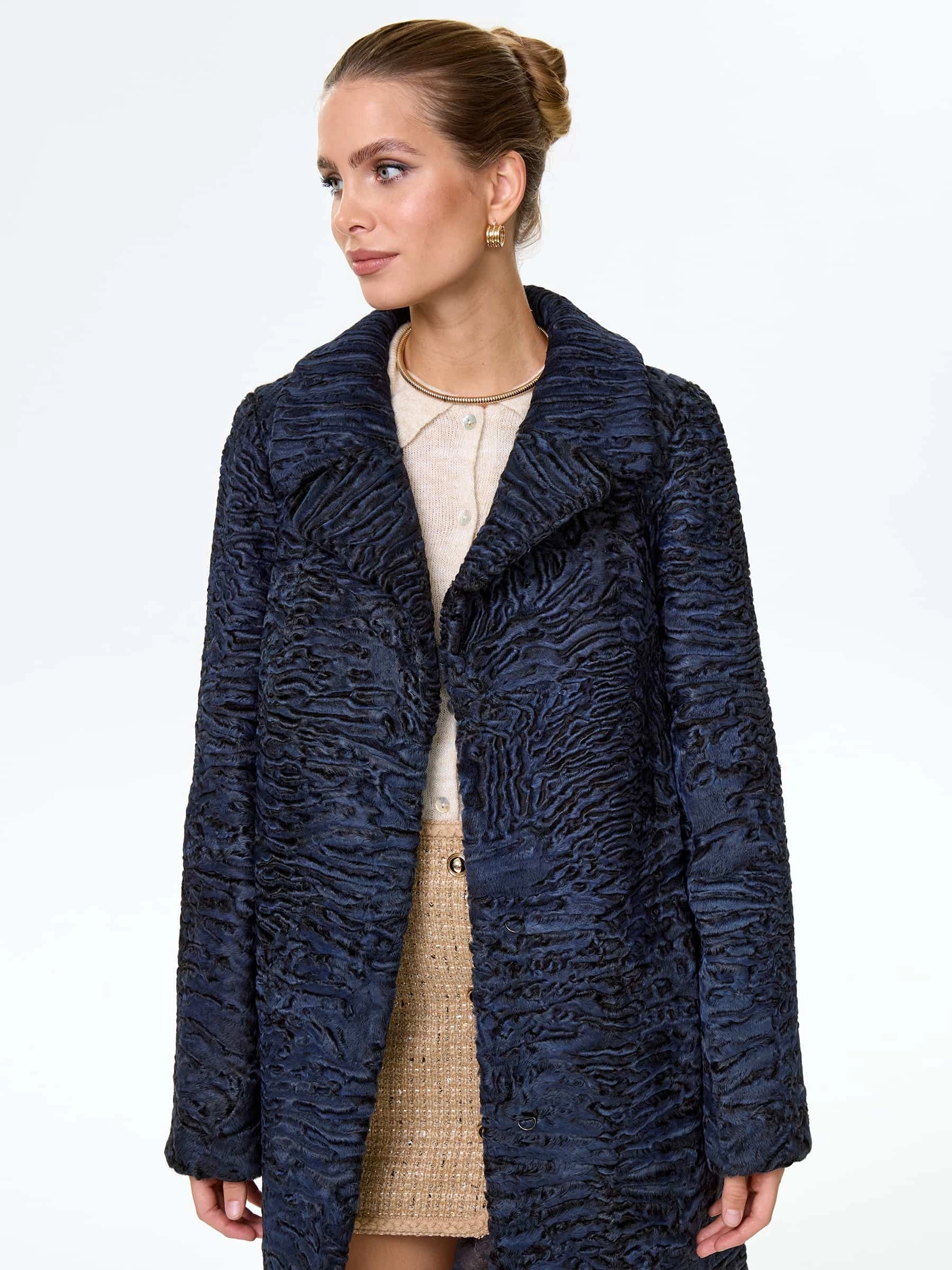 Товар длинная женская шуба из меха каракульчи премиум класса лола(ав), синяя, размер 48, артикул 34010 выполнен из каракульча с застежкой клипсы. Рассчитан на сезон: весна-осень. Длина изделия 118 см, силуэт прямой.