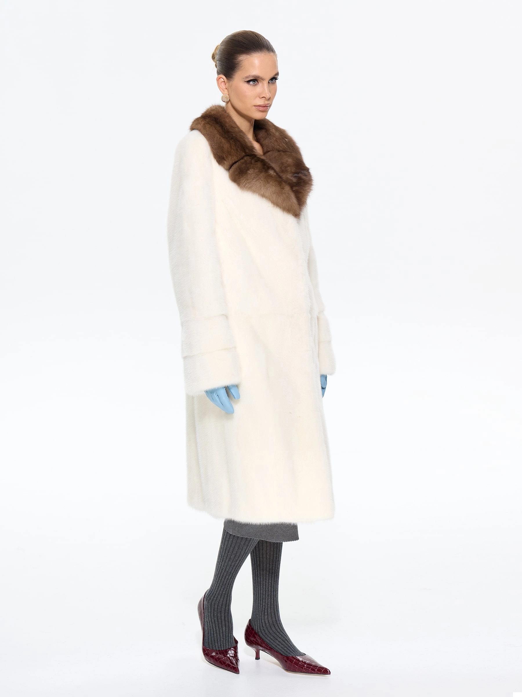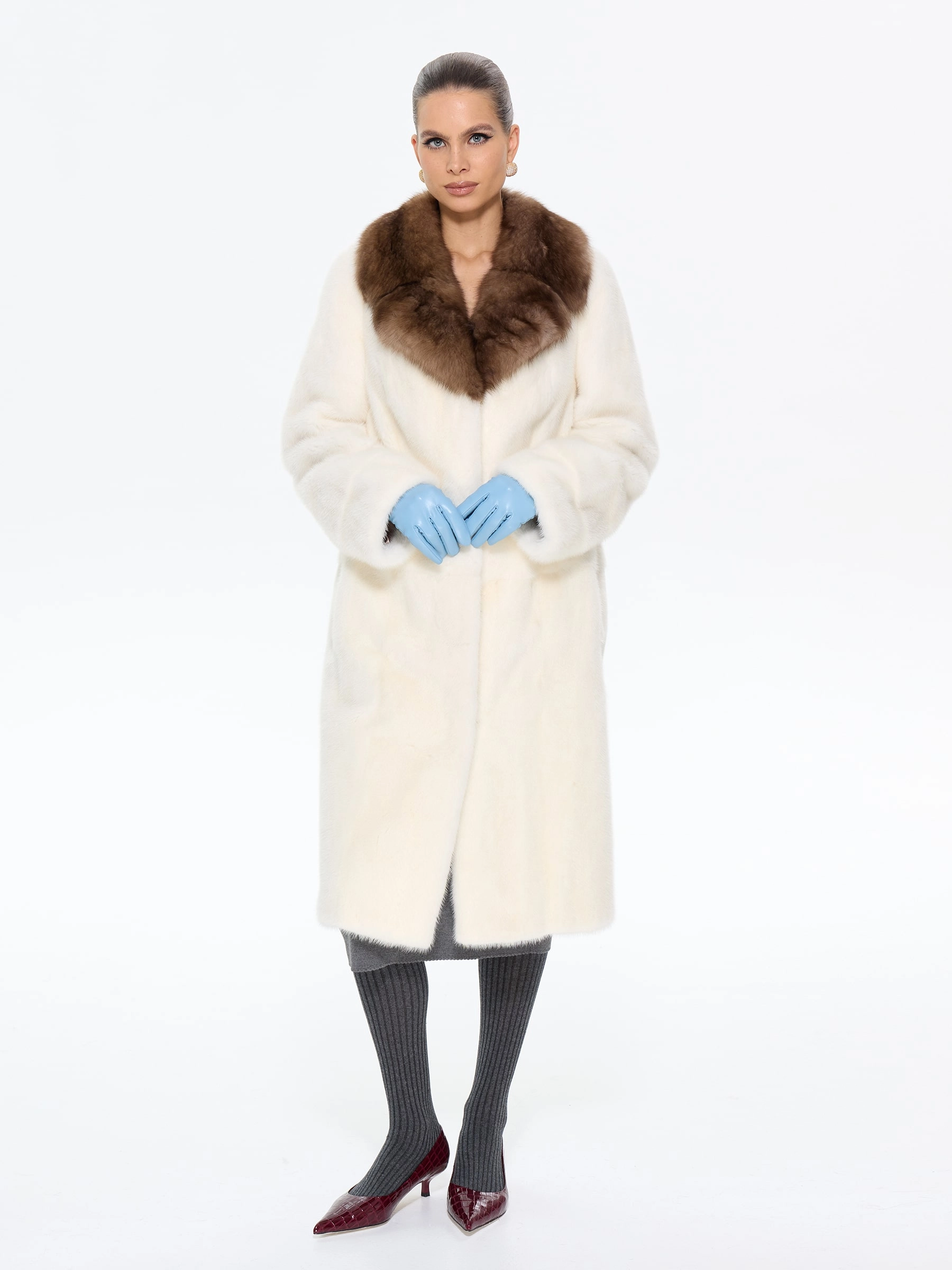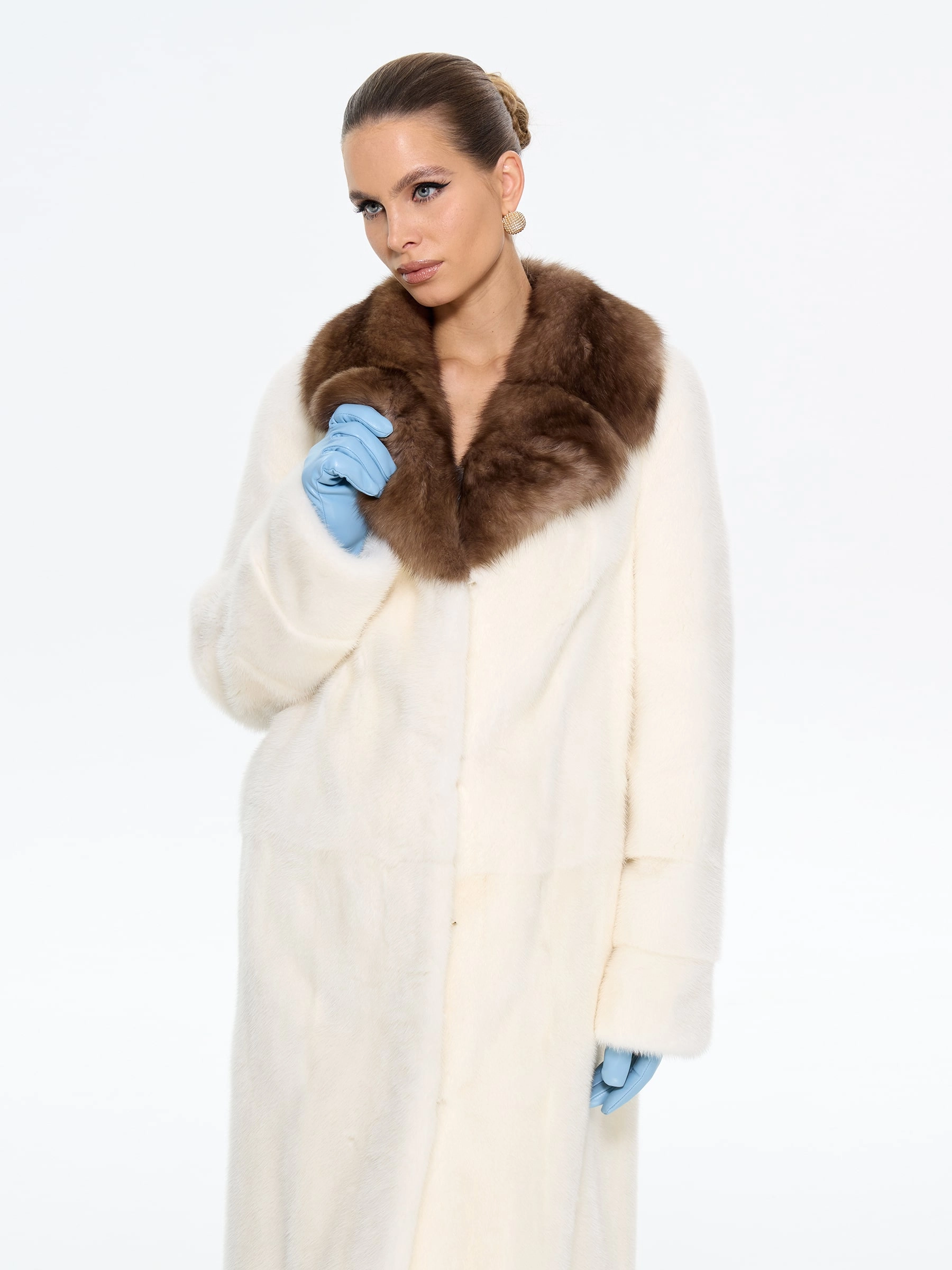 Изысканная длинная шуба из меха норки премиум-класса в белоснежном оттенке с элегантным английским воротником, отделанным ценным мехом соболя. Прямой силуэт длиной 108 см создает стройный вертикальный силуэт, подчеркивая аристократическую элегантность и зимний шарм. Стилисты рекомендуют носить эту модель с кожаными перчатками и сапогами до колена, дополнив сумочкой-портфелем, или с вязаной шапкой и утепленными ботильонами для повседневного образа. Белоснежная шуба из качественной норки с соболиной отделкой станет жемчужиной вашего гардероба, подчеркивая безупречный вкус в любой ситуации.