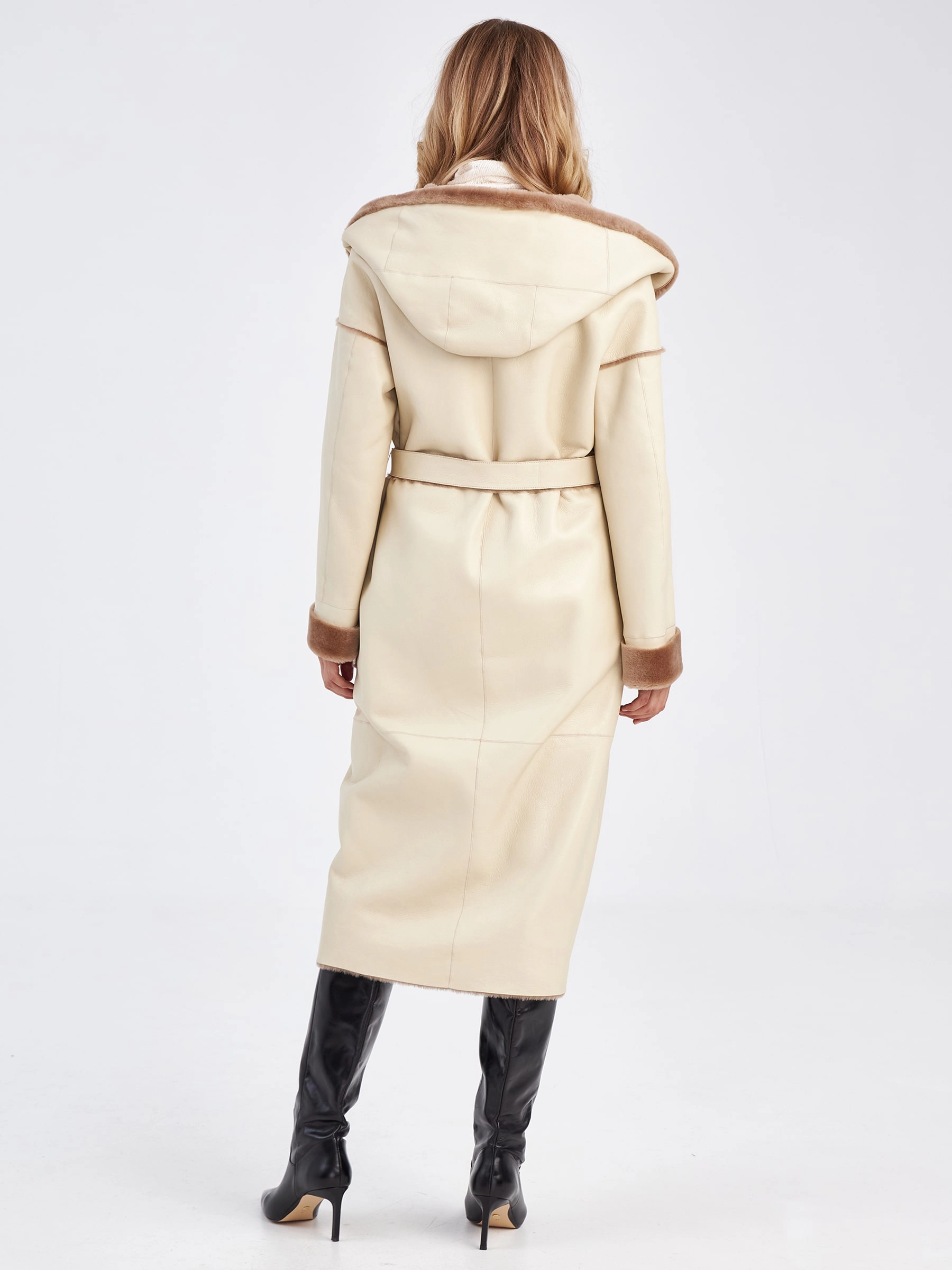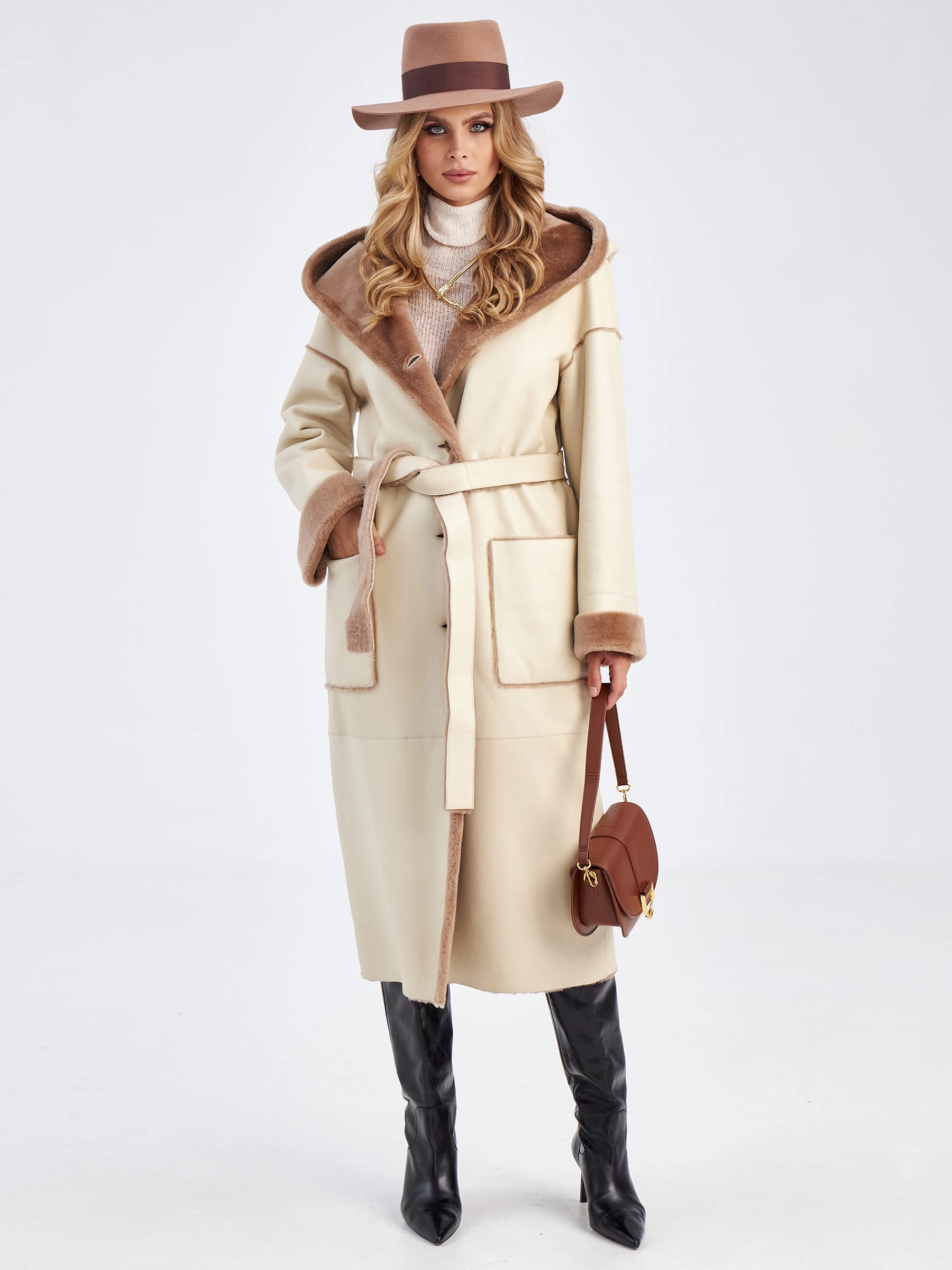 Пальто премиального качества из натуральной овчины в нейтральном бежевом цвете прямого кроя - пример стильной и элегантной одежды в холодную зимнюю погоду. Плотную нежную овчину, из которой сшили модель, обработали так, чтобы с внешней стороны она напоминала гладкую кожу. Максимально теплая, но при этом легкая и мягкая. Контрастный коричневый мех послужил отделкой объемного шалевидного капюшона и манжет. Длинный пояс формирует приталенный силуэт.