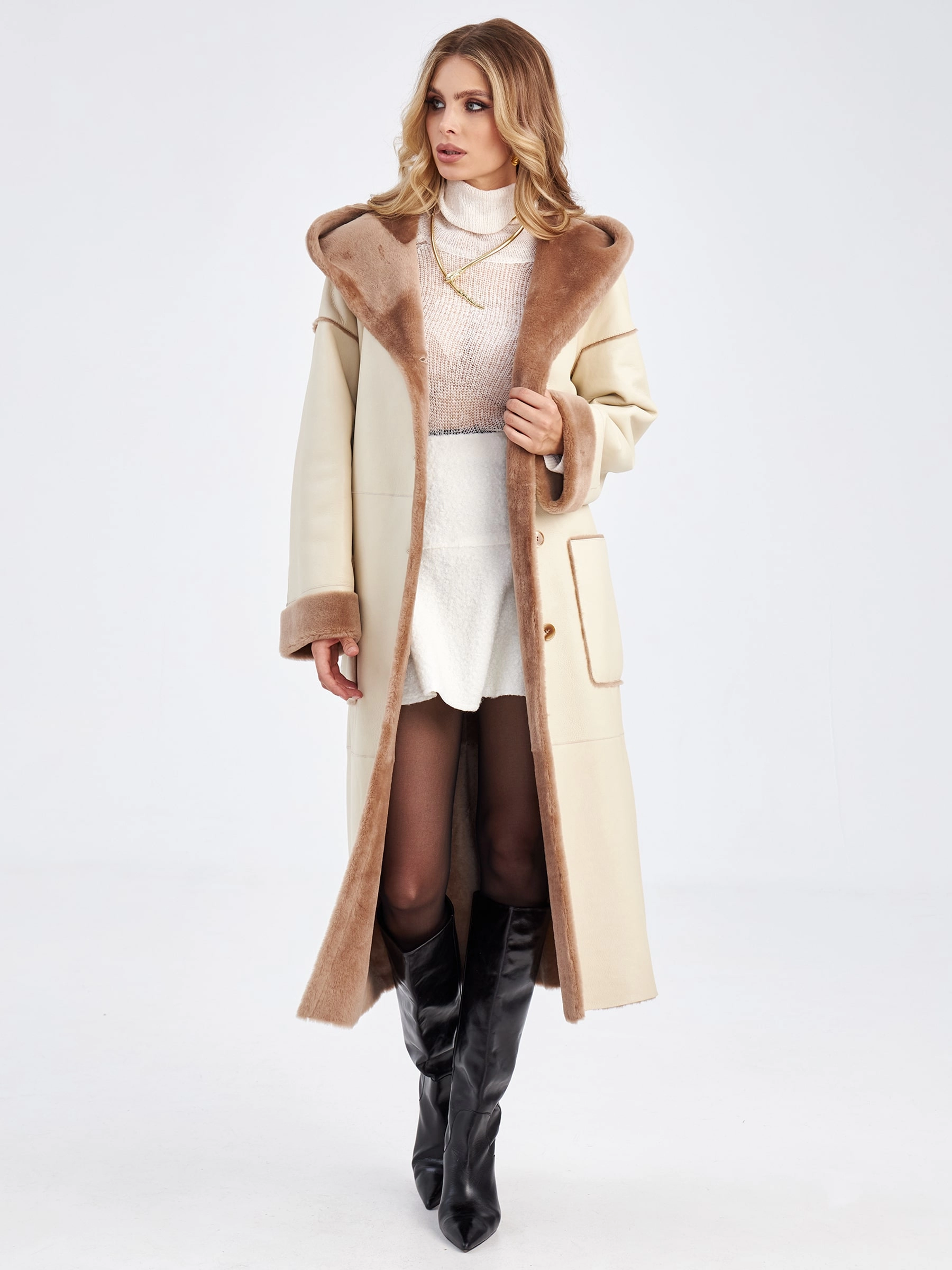 Товар длинное оверсайз пальто из меховой овчины с капюшоном для женщин премиум класса 2008н, бежевое, размер 46, артикул 64010 выполнен из овчина "мерино" с застежкой пуговицы. Рассчитан на сезон: осень-зима. Длина изделия 120 см, силуэт прямой.