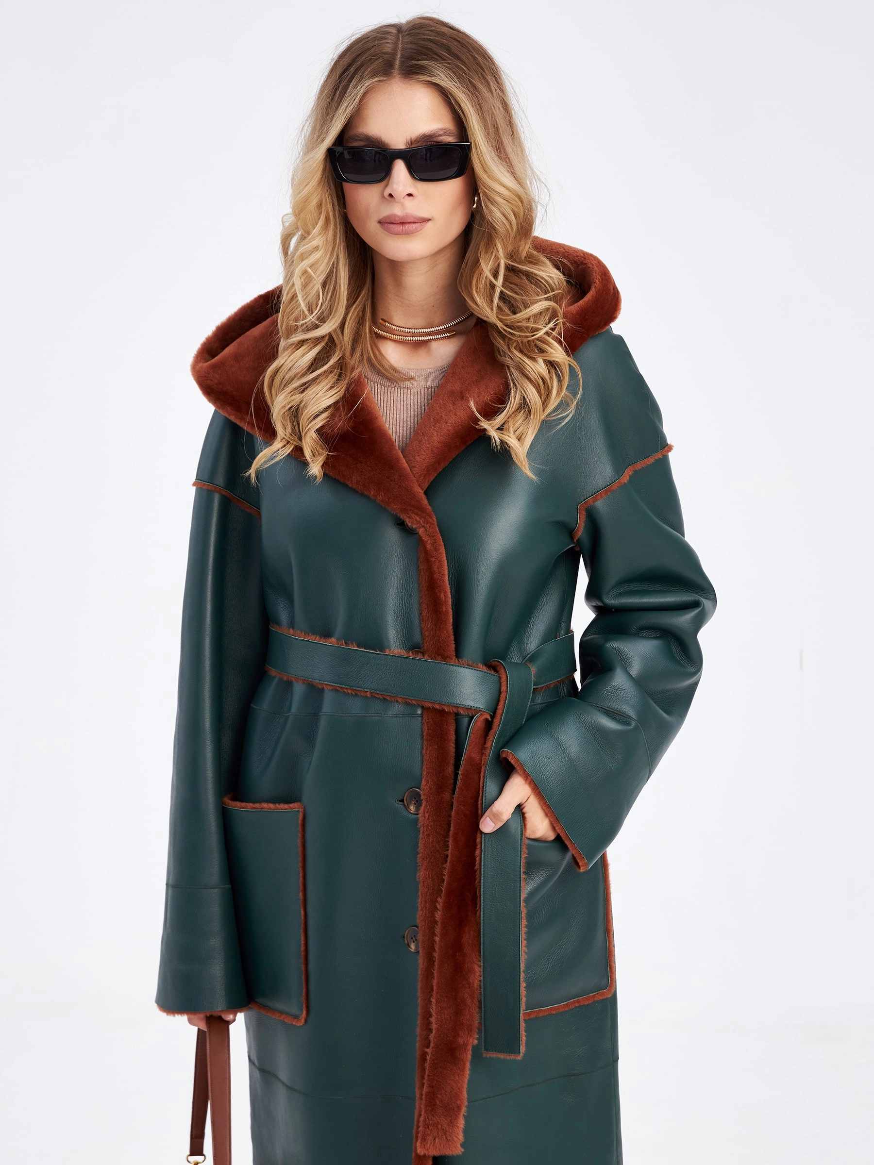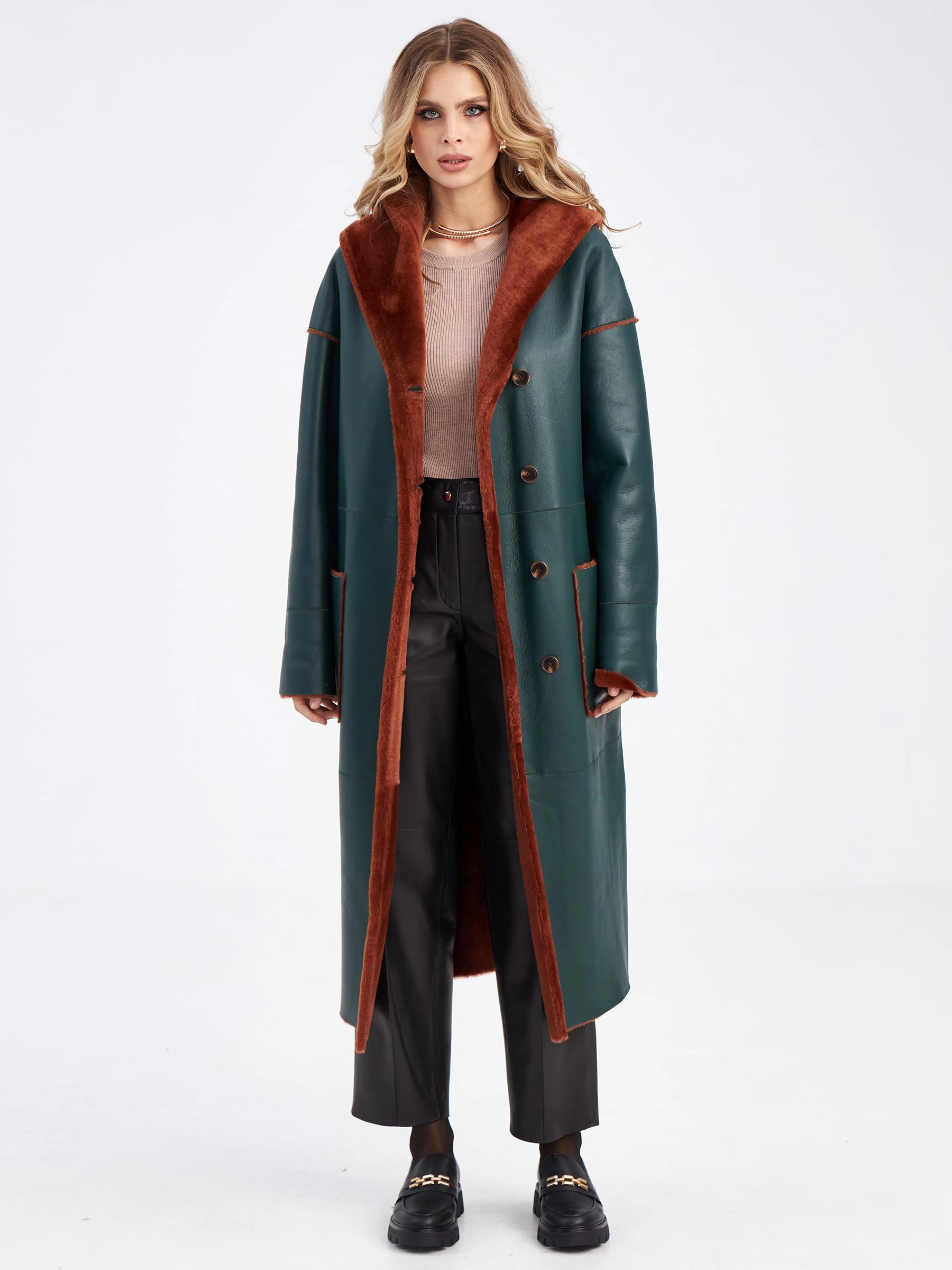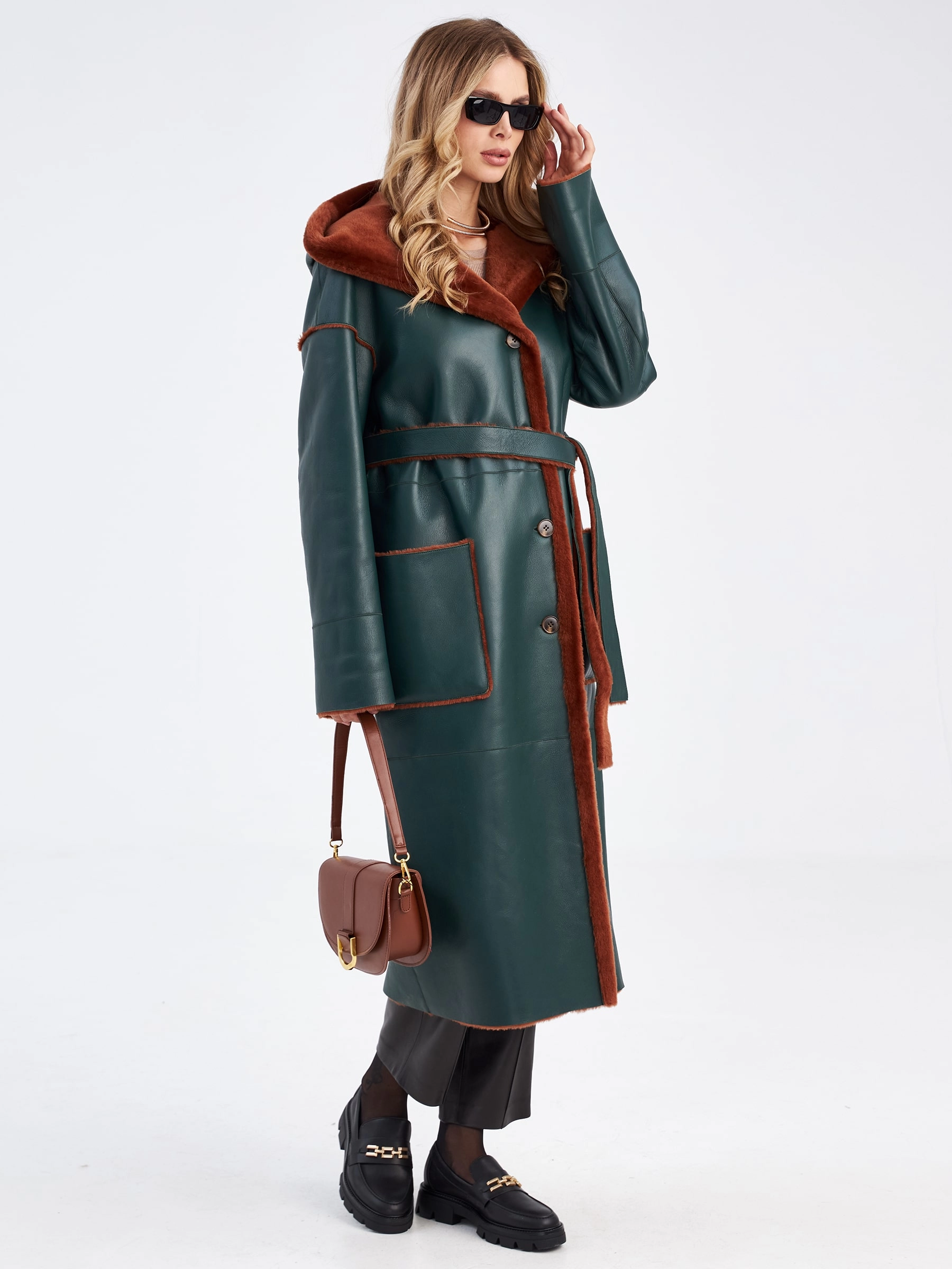 Товар длинное оверсайз пальто из меховой овчины с капюшоном для женщин премиум класса 2008н, зеленое, размер 48, артикул 63890 выполнен из овчина "мерино" с застежкой пуговицы. Рассчитан на сезон: осень-зима. Длина изделия 120 см, силуэт прямой.