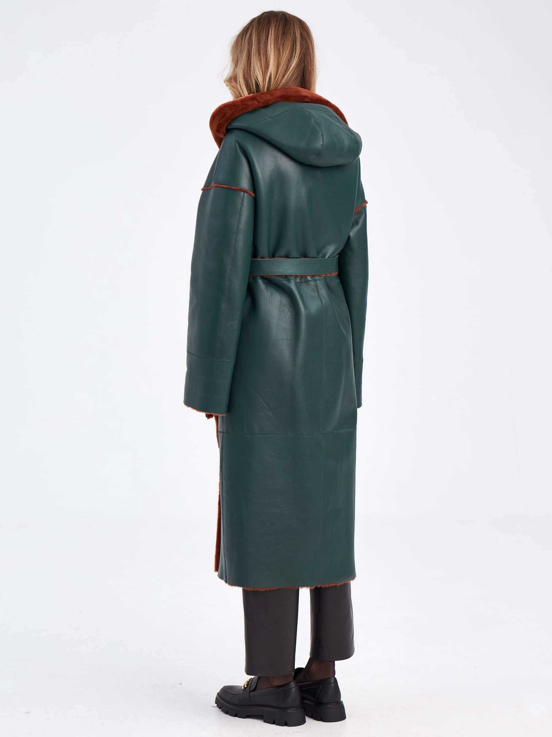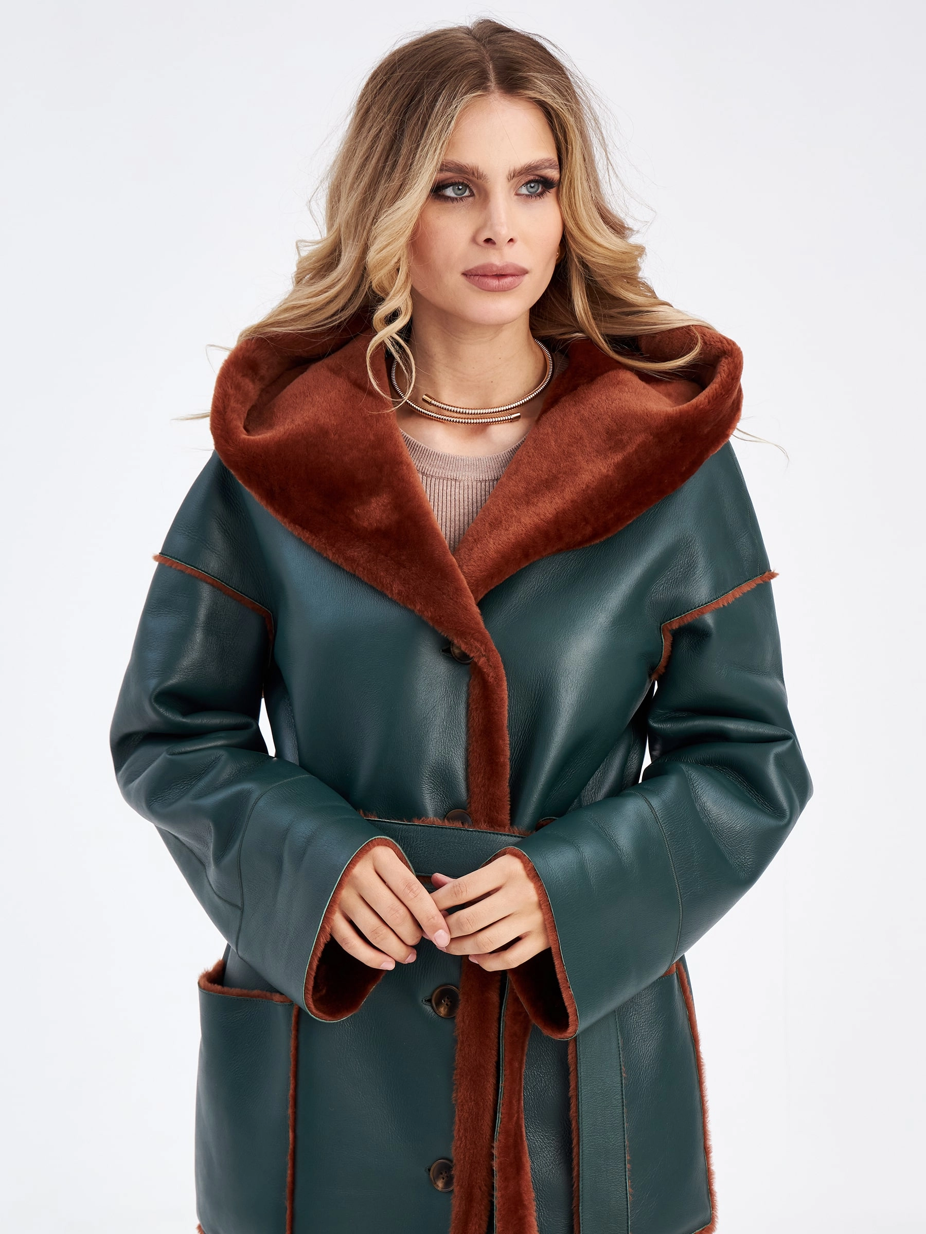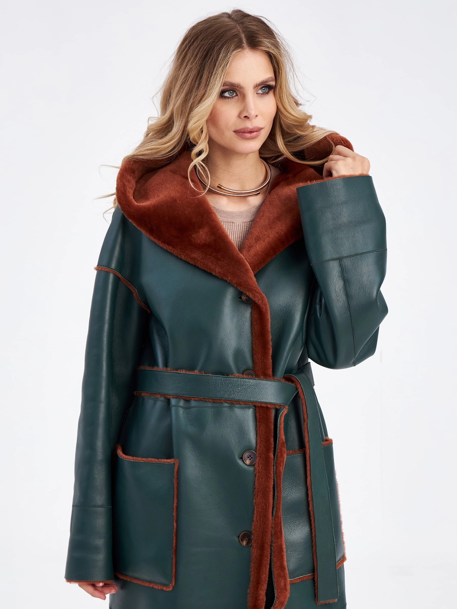 Товар длинное оверсайз пальто из меховой овчины с капюшоном для женщин премиум класса 2008н, зеленое, размер 48, артикул 63890 выполнен из овчина "мерино" с застежкой пуговицы. Рассчитан на сезон: осень-зима. Длина изделия 120 см, силуэт прямой.