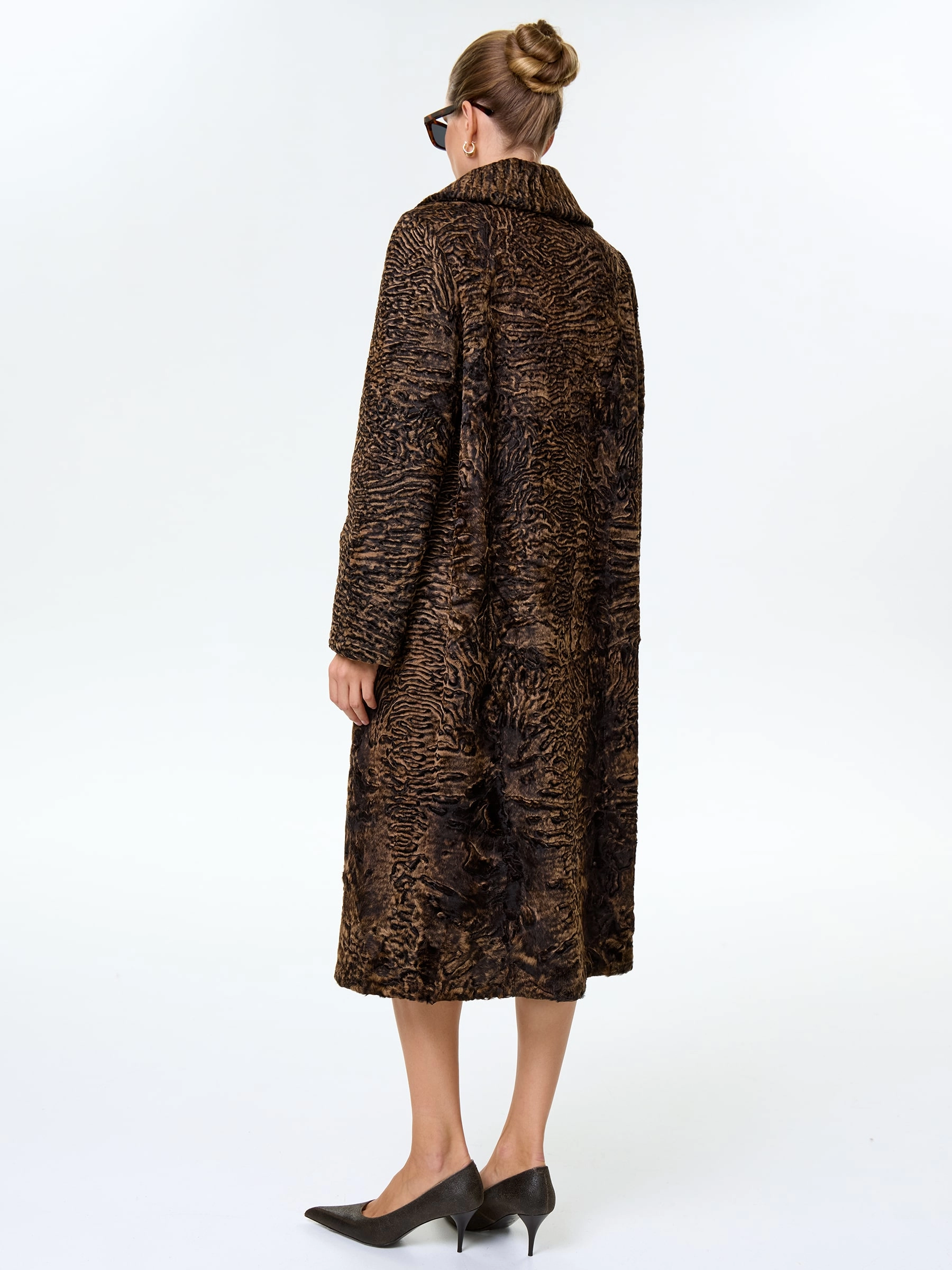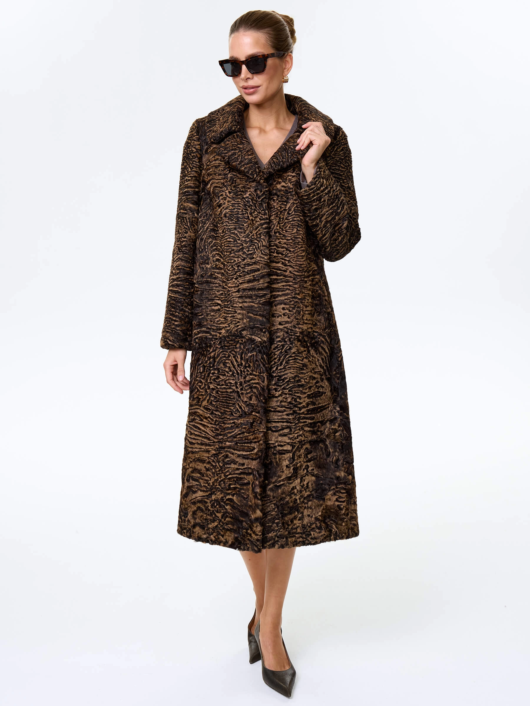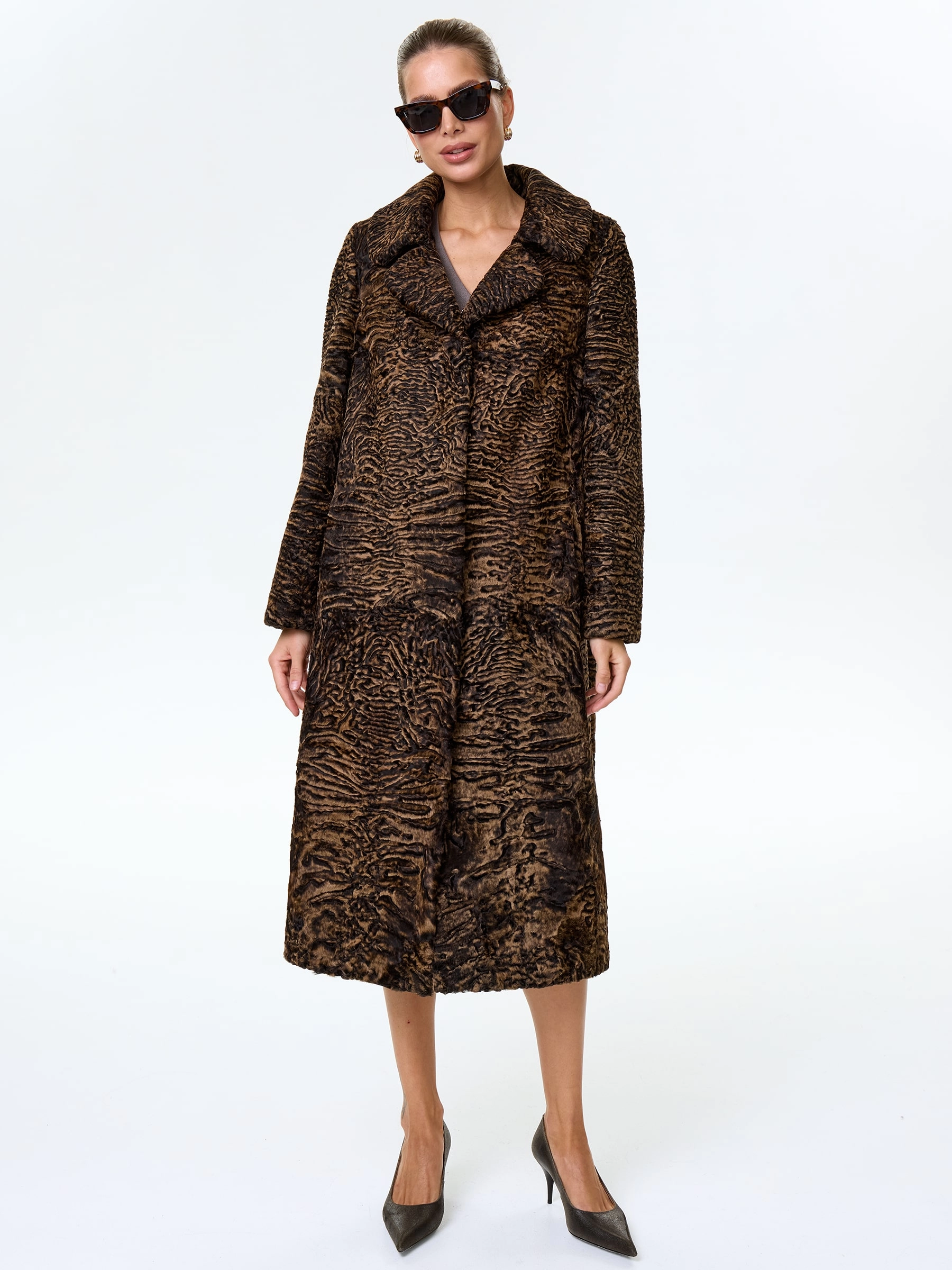 Товар длинное пальто из меха каракульчи для женщин премиум класса лола(ав), темно-коричневое, размер 50, артикул 33980 выполнен из мех каракульчи с застежкой клипсы. Рассчитан на сезон: весна-осень. Длина изделия 117 см, силуэт прямой.
