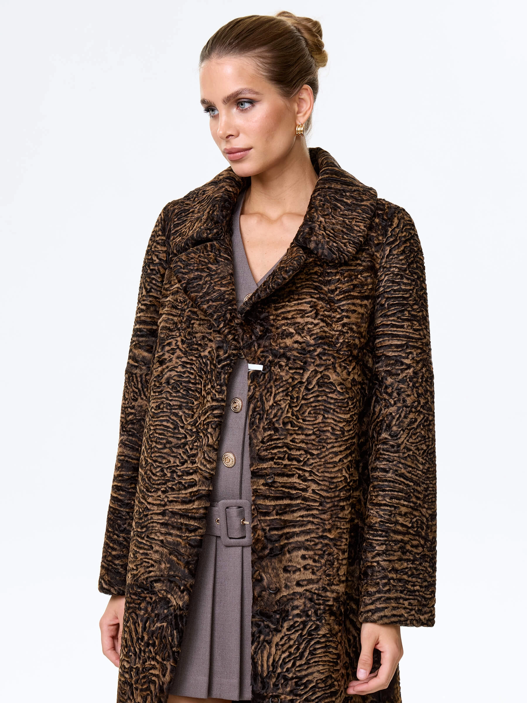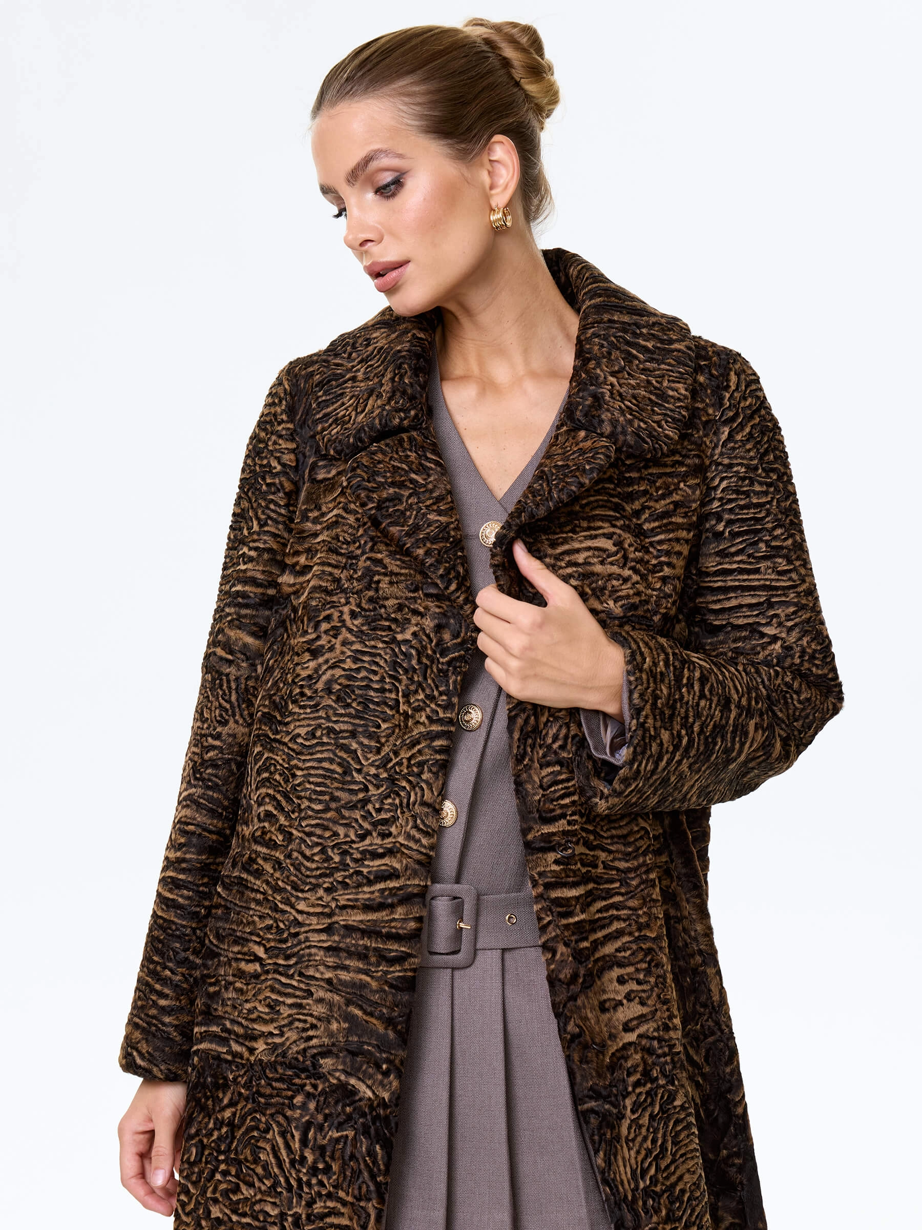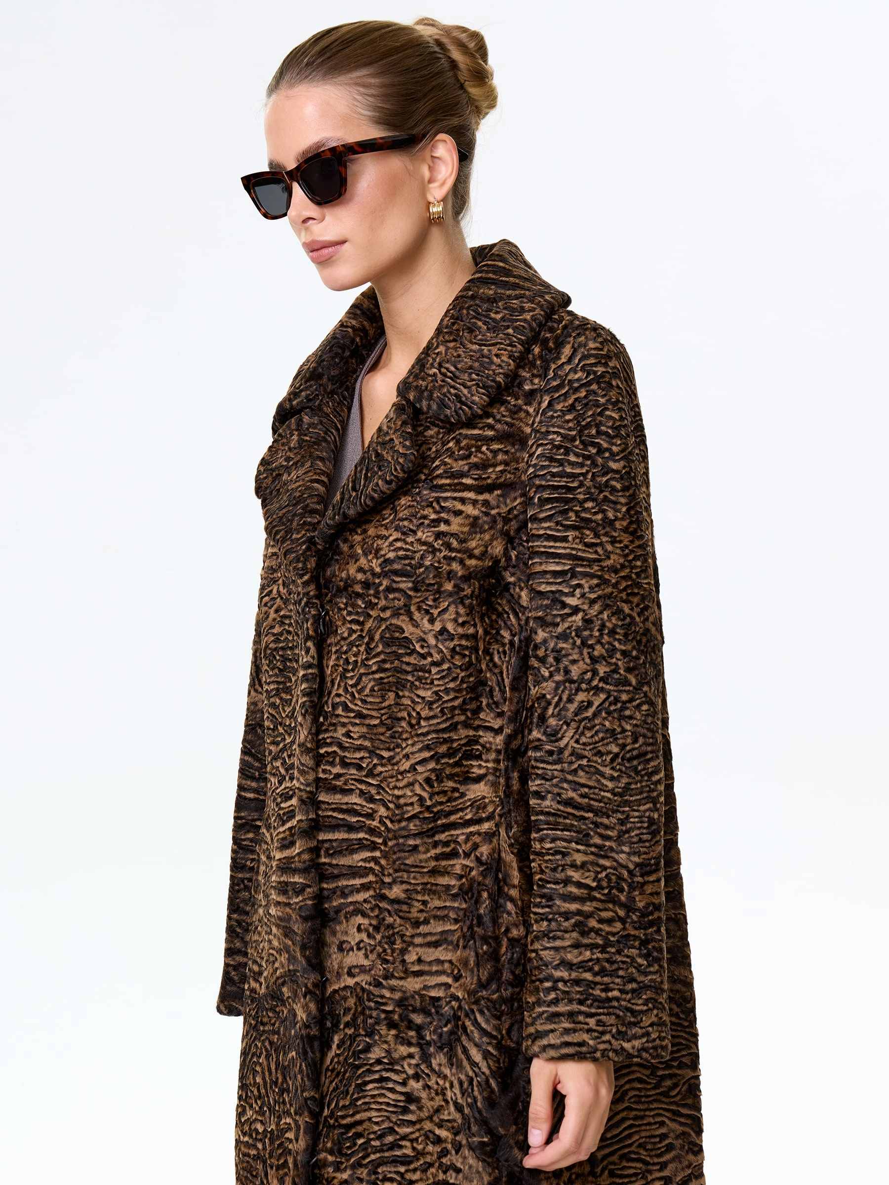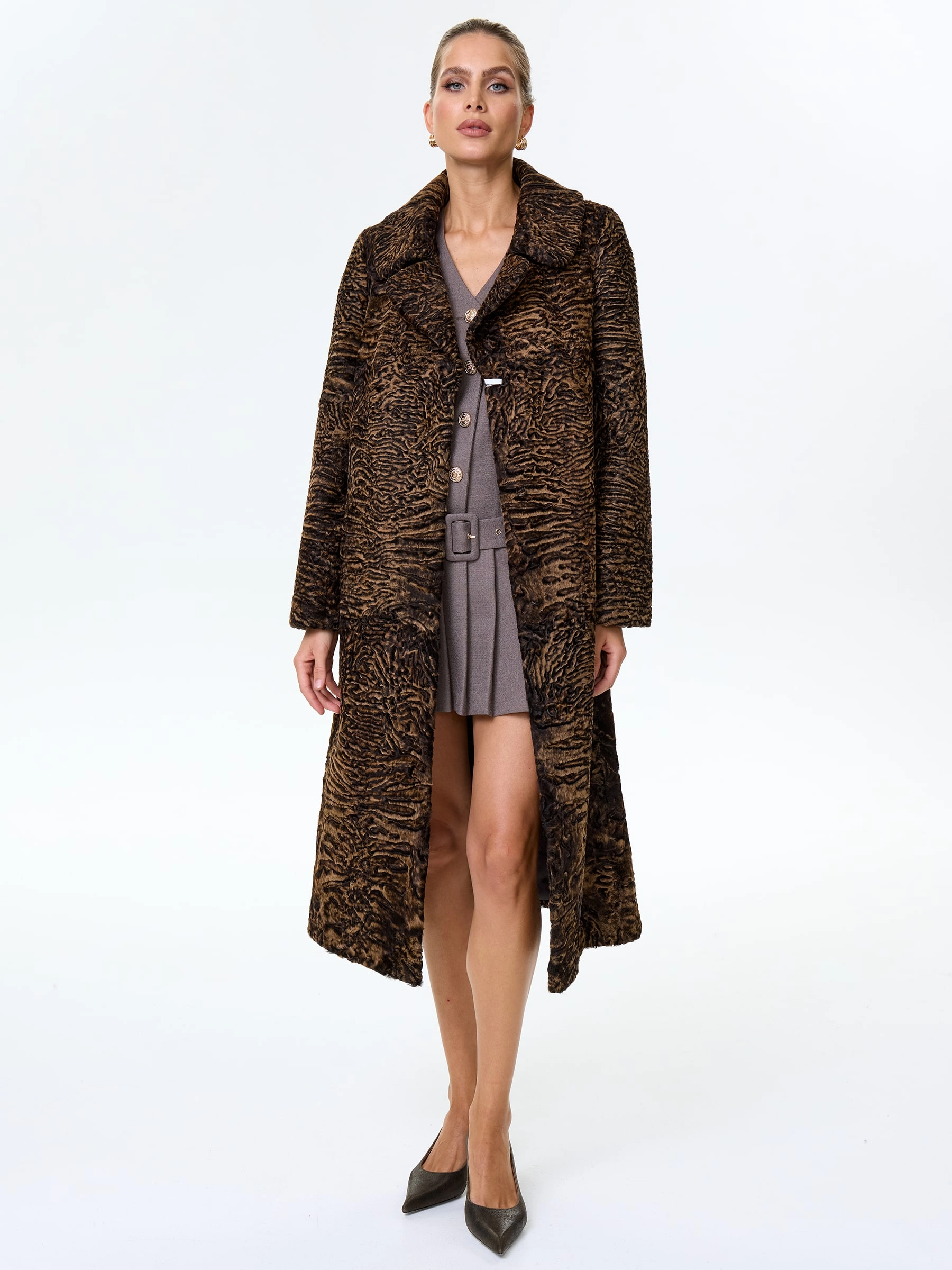 Товар длинное пальто из меха каракульчи для женщин премиум класса лола(ав), темно-коричневое, размер 50, артикул 33980 выполнен из мех каракульчи с застежкой клипсы. Рассчитан на сезон: весна-осень. Длина изделия 117 см, силуэт прямой.