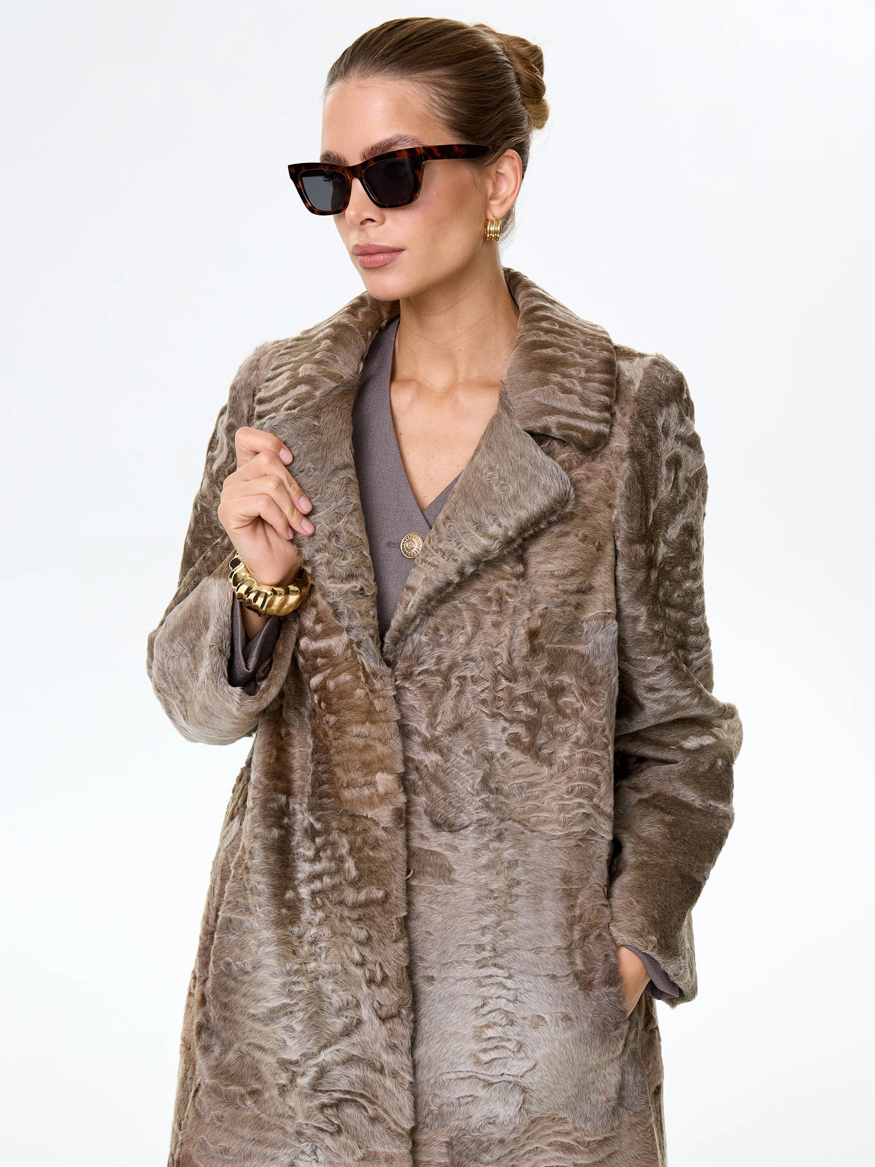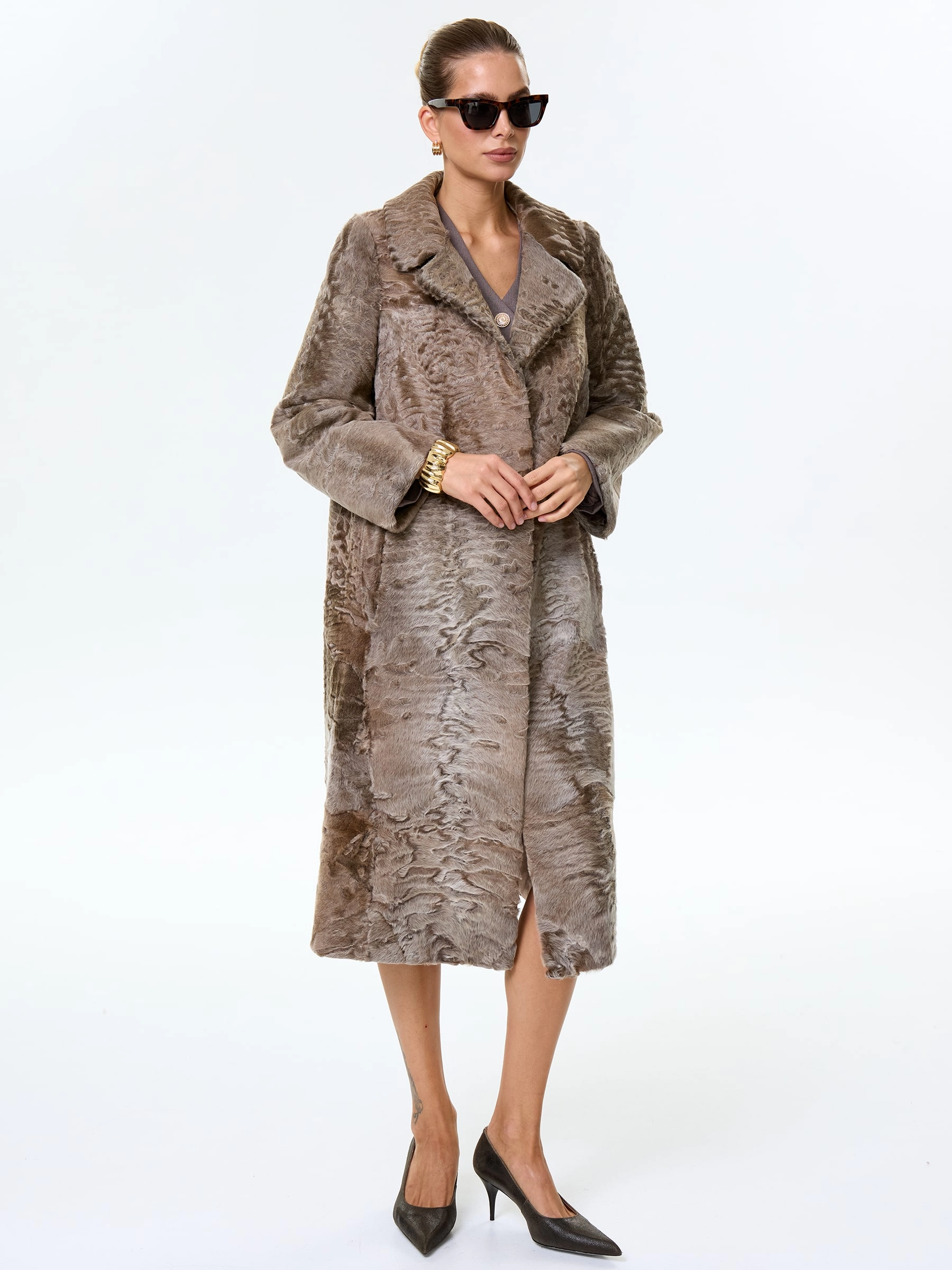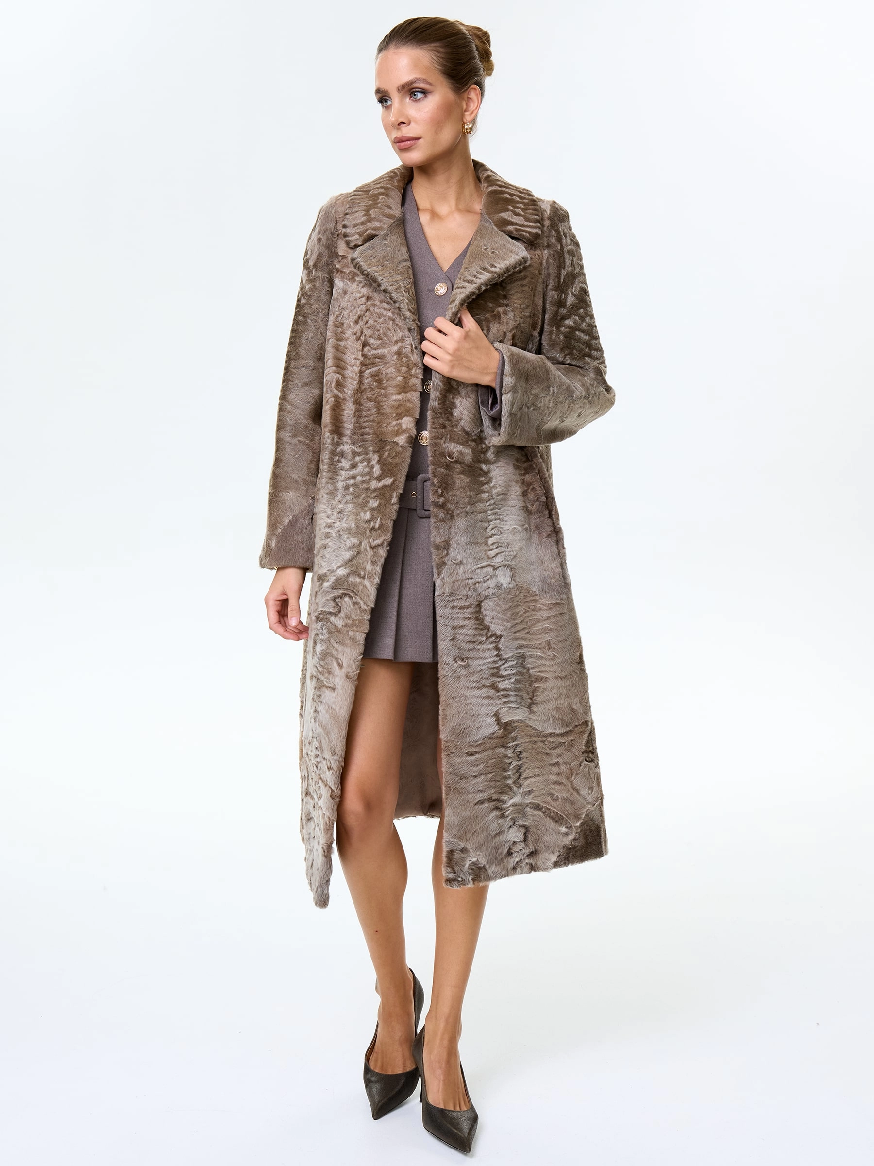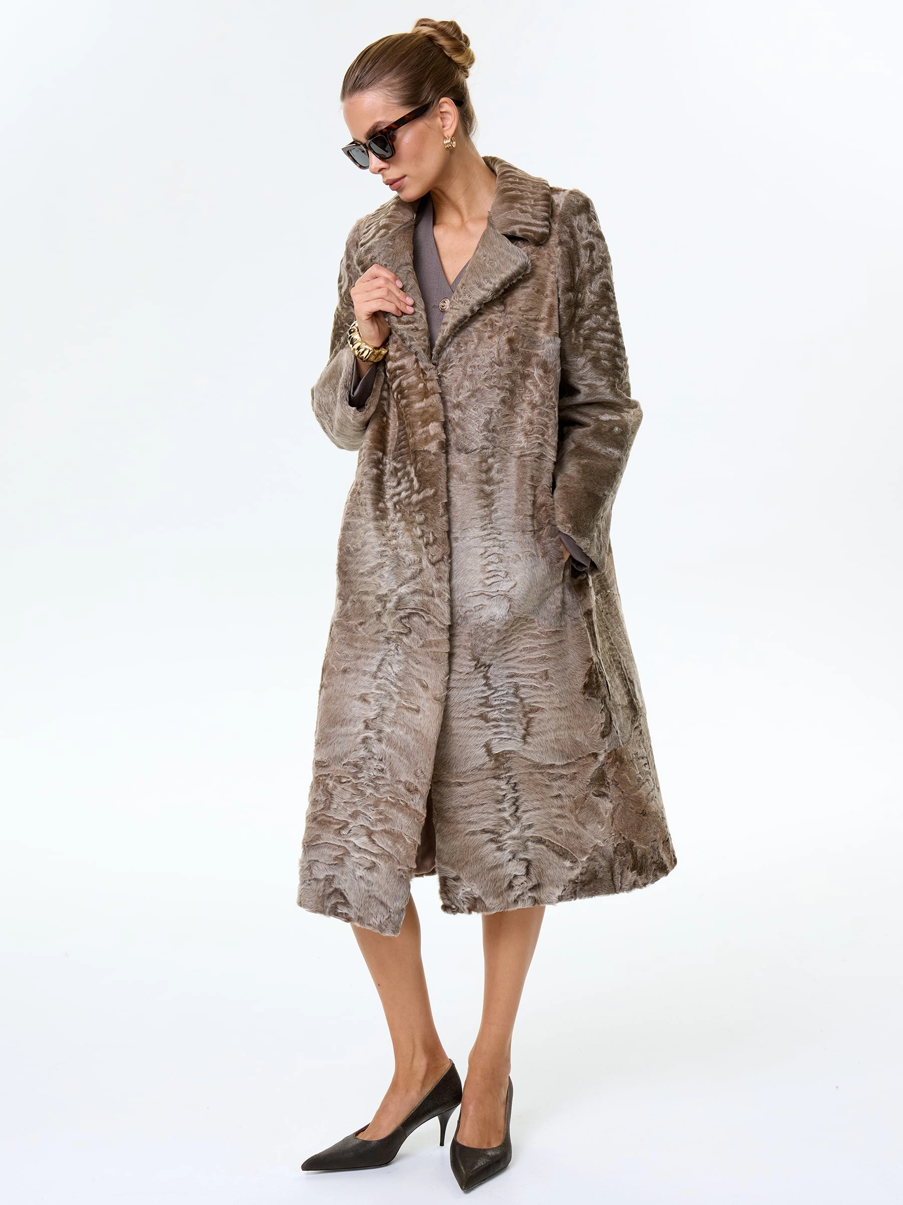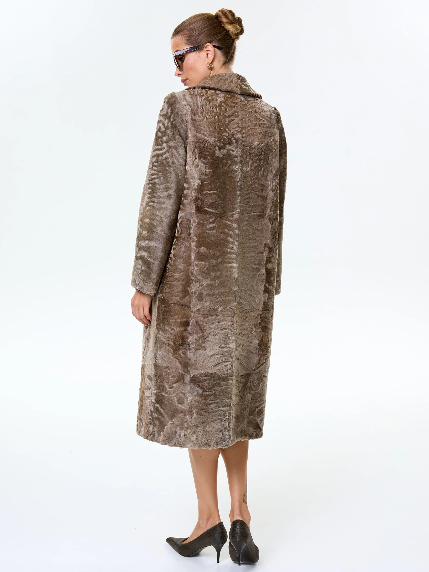 Длинное пальто из афганской каракульчи в благородном натуральном цвете. Английский воротник. Идеальный подбор шкурок по оттенку и структуре. Аккуратная работа портных. Премиальное качество меха и комфортная посадка по фигуре.