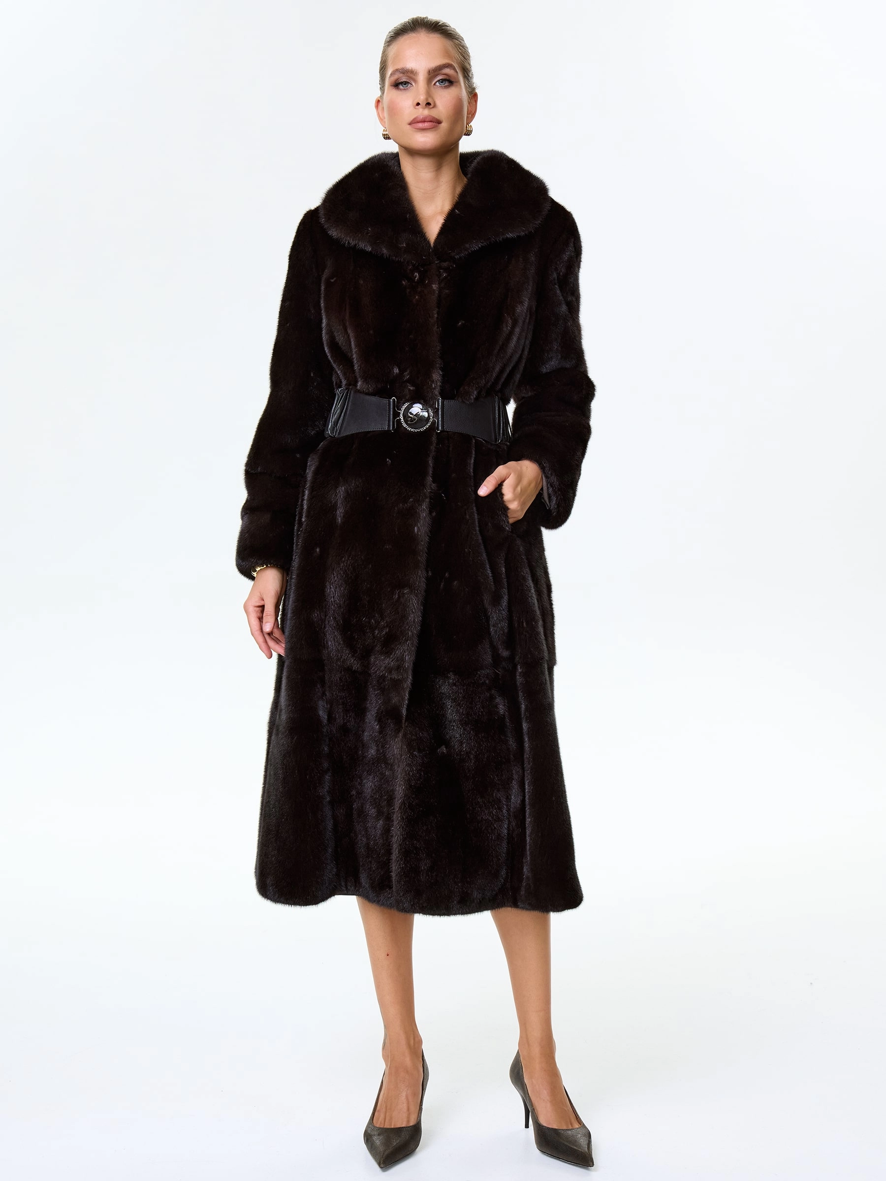 Товар длинное женское пальто из меха норки белла(в), черное, размер 52, артикул 64520 выполнен из норка с застежкой клипсы. Рассчитан на сезон: зима. Длина изделия 120 см, силуэт полуприлегающий.