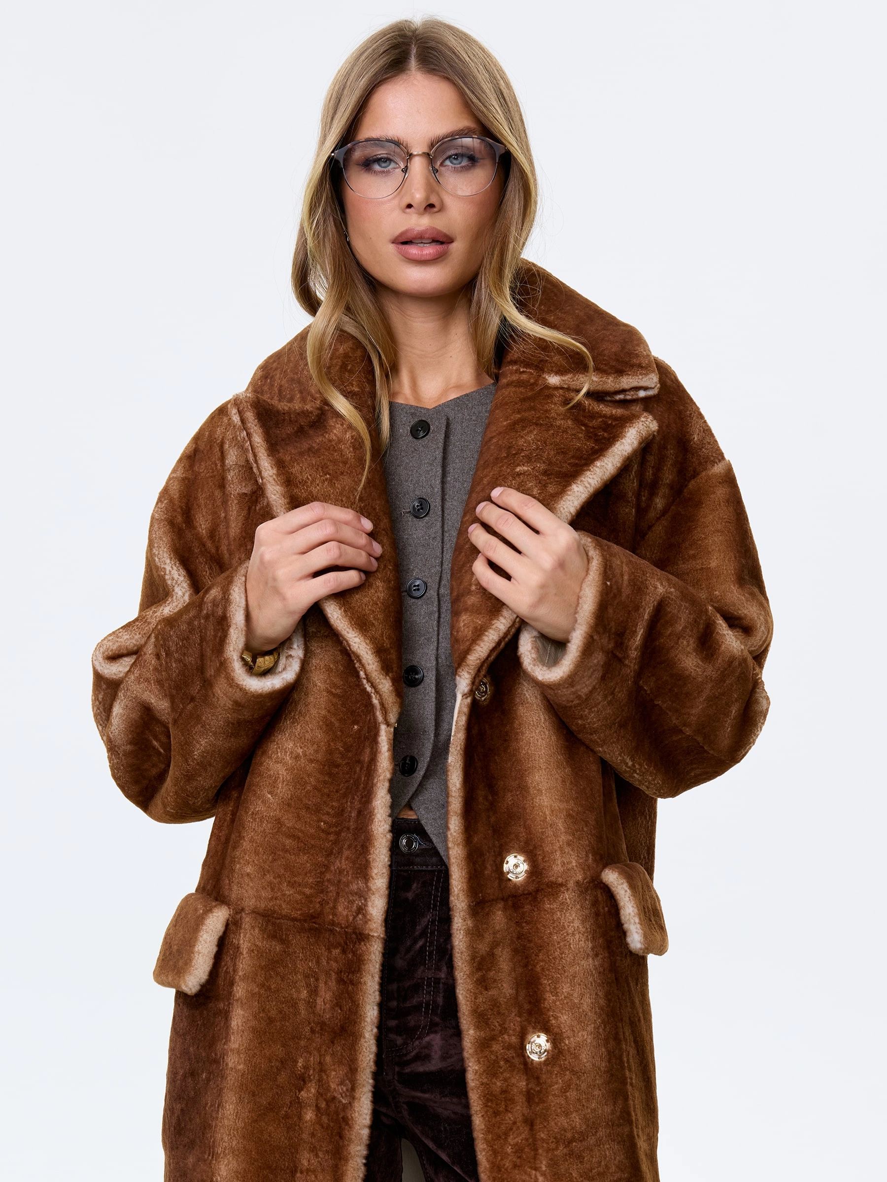 Сдержанное и одновременно стильное пальто с английским воротником и широкими лацканами выполнили из мягкой овчины. Прямой крой изделия обеспечивает комфортную посадку по фигуре и не ограничивает движения. Модель дополнили большими накладными карманами закрывающиеся клапанами. Застежка - кнопки.