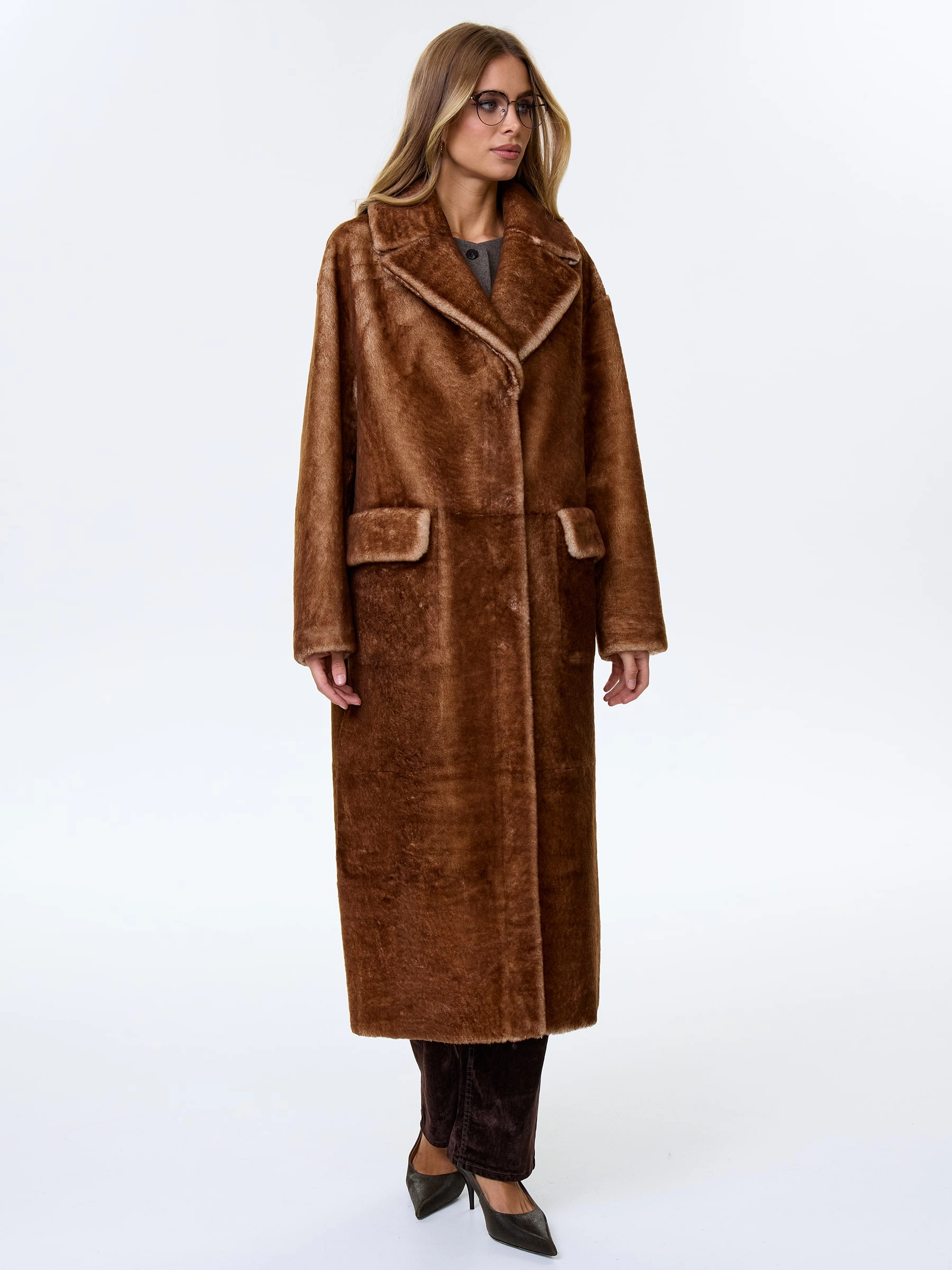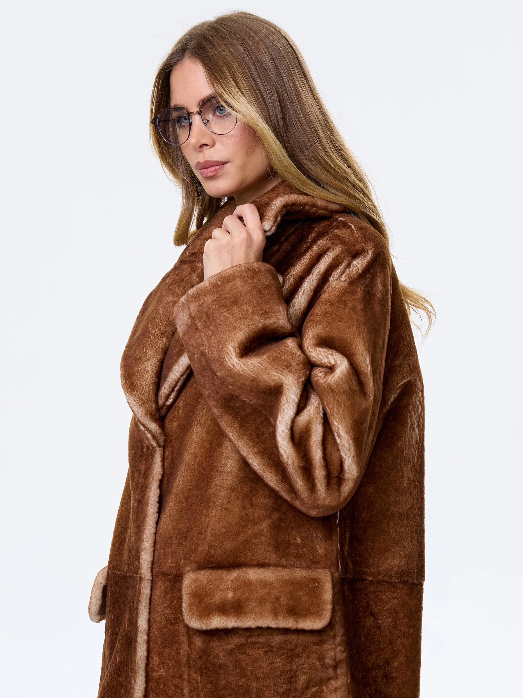 Товар длинное женское пальто из натуральной овчины астрагана премиум класса 2053, коричневое, размер 48, артикул 64370 выполнен из овчина "мерино" с застежкой кнопки. Рассчитан на сезон: осень-зима. Длина изделия 126 см, силуэт прямой.