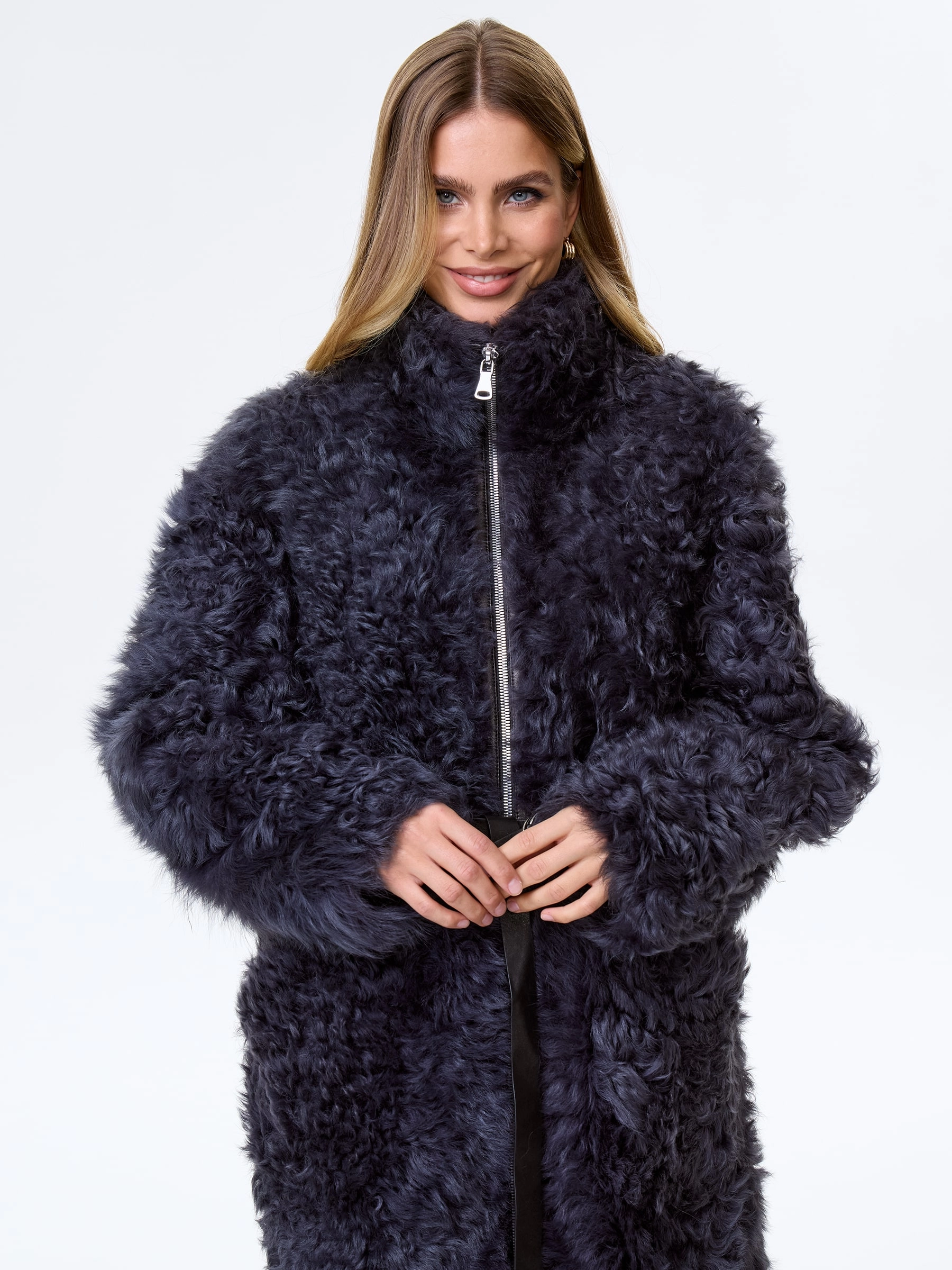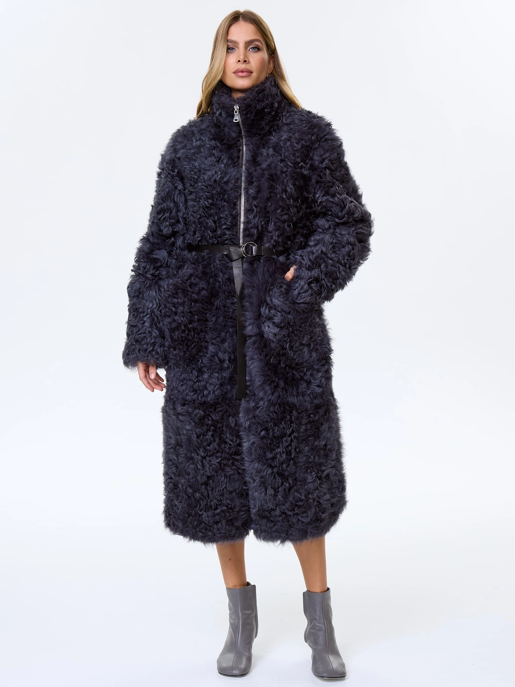Длинное женское пальто из натуральной овчины тиградо премиум-класса глубокого темно-серого цвета — воплощение молодежного стиля и природной роскоши: модель выполнили из натуральной овчины калган (тиградо) с характерным мелкозавитковым фактурным ворсом снаружи и гладкой кожаной поверхностью внутри, создавая выразительный объем и благородную текстуру, а свободный молодежный крой длиной 117 см со спущенным плечом обеспечивает полный комфорт и не сковывает движений. Лаконичный воротник-стойка добавляет модели современного звучания, боковые карманы усиливают практичность, а пояс позволяет при желании изменить силуэт, подчеркнув линию талии; удобная застежка-молния и отсутствие подкладки сохраняют естественную структуру натурального меха, делая пальто теплым, но при этом легким. Совет стилиста: фактурная овчина тиградо и темно-серый оттенок задают образу благородную сдержанность — носите это пальто с монохромной базой в серой, черной или белой гамме, позволяя объемному ворсу быть главным акцентом, а пояс поможет до