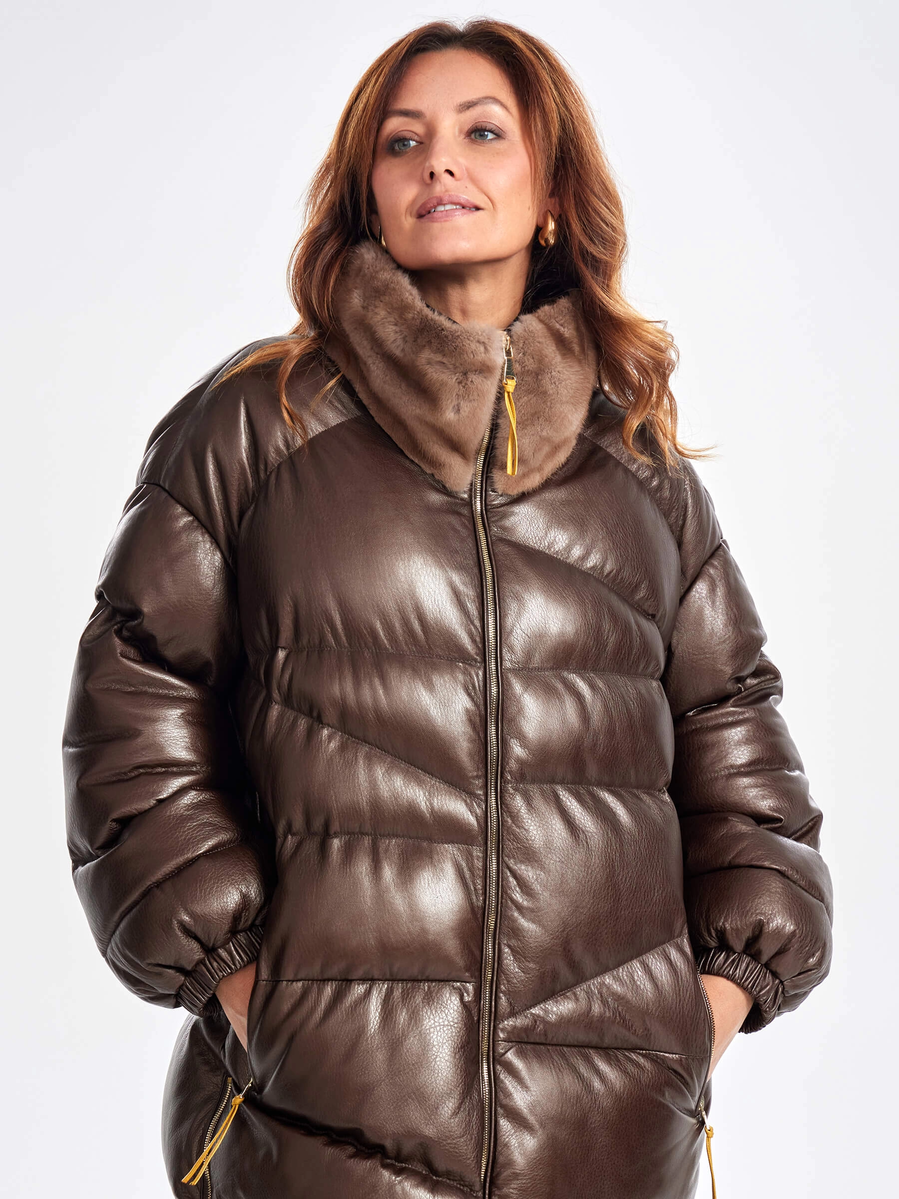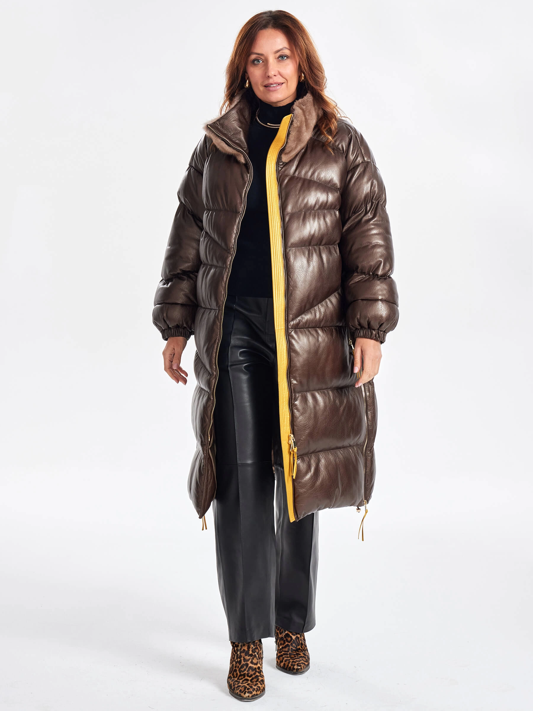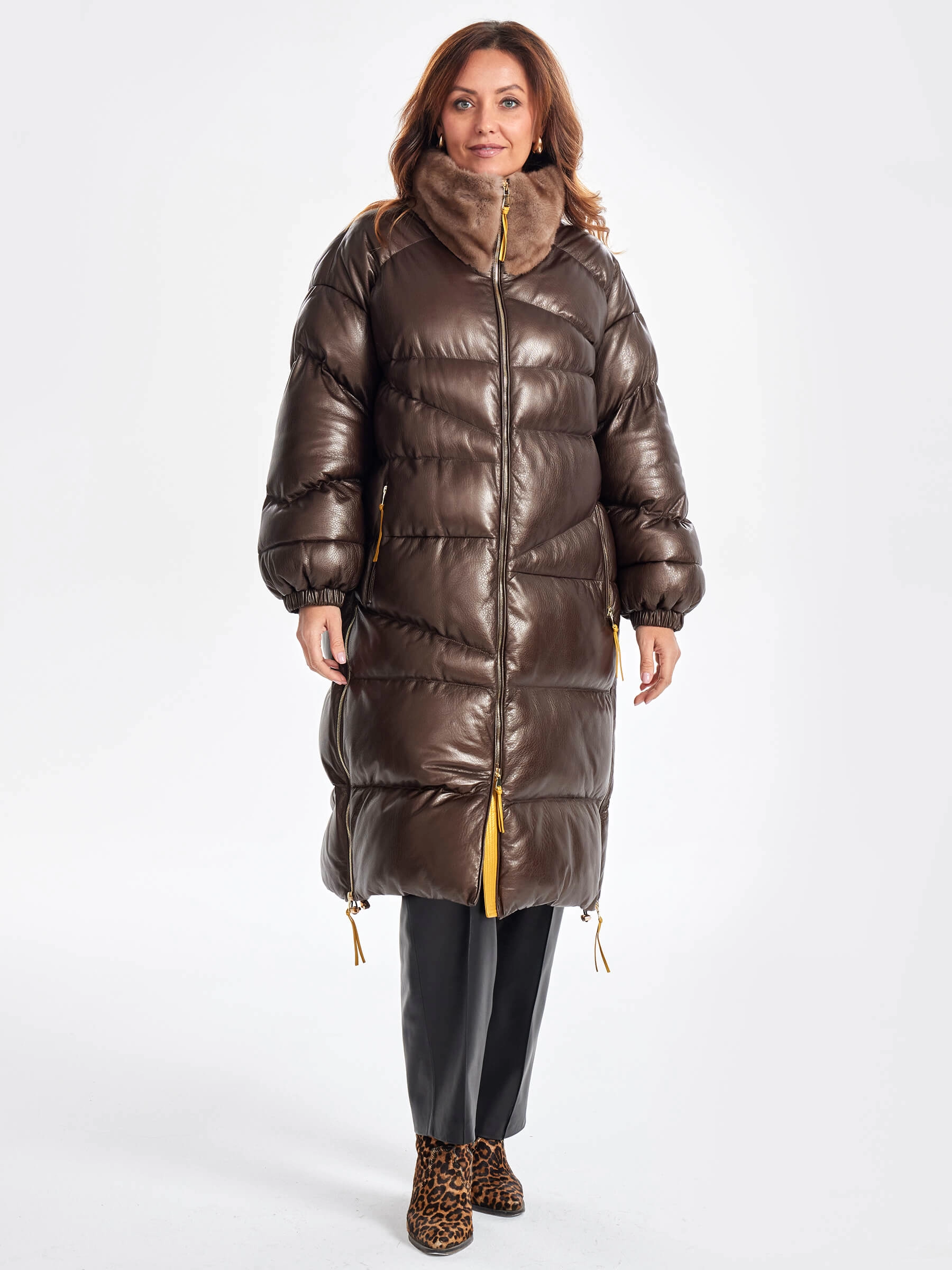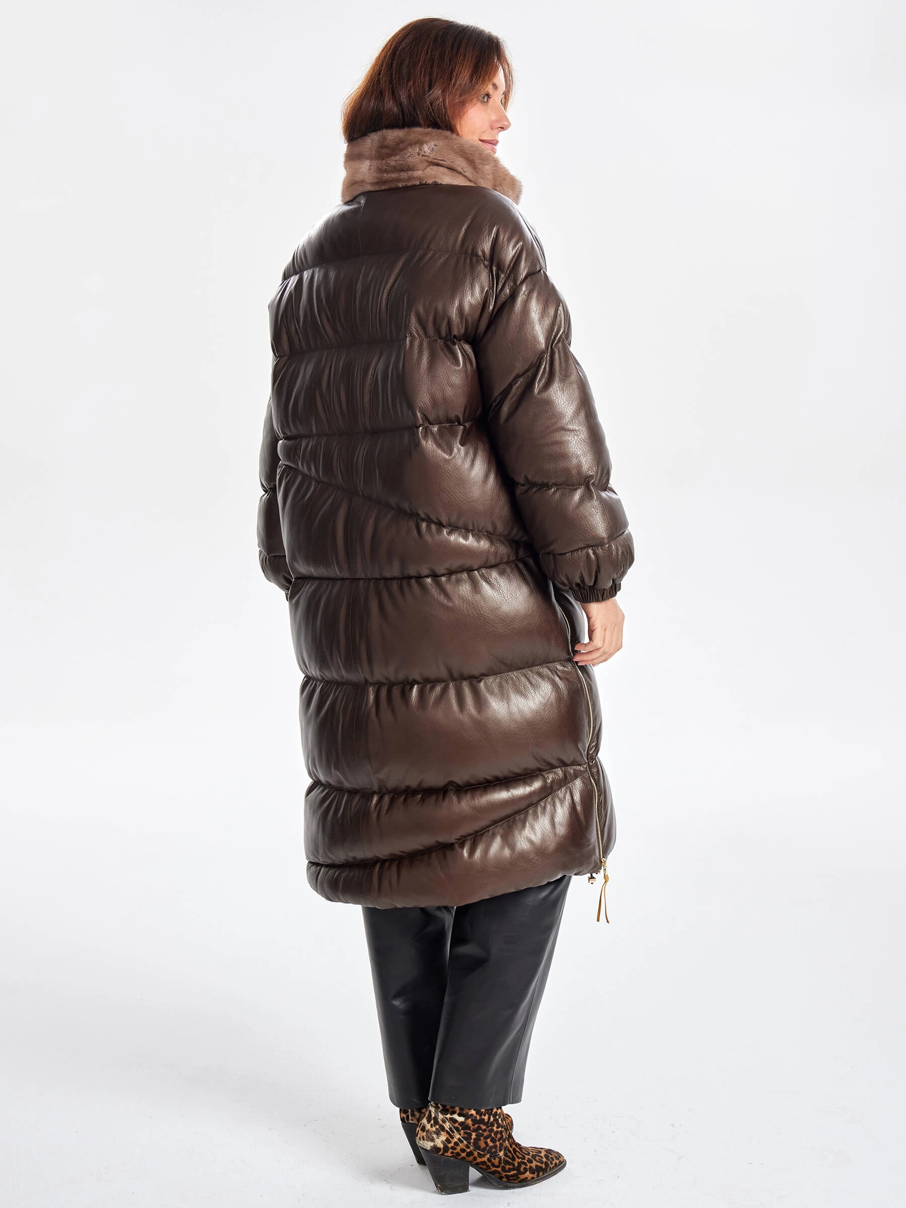 Товар длинный стеганый кожаный пуховик с норковым воротником премиум класса для женщин 3073, коричневый, размер 44, артикул 25540 выполнен из натуральной кожи с застежкой молния. Рассчитан на сезон: осень-зима. Длина изделия 110 см, силуэт свободный.