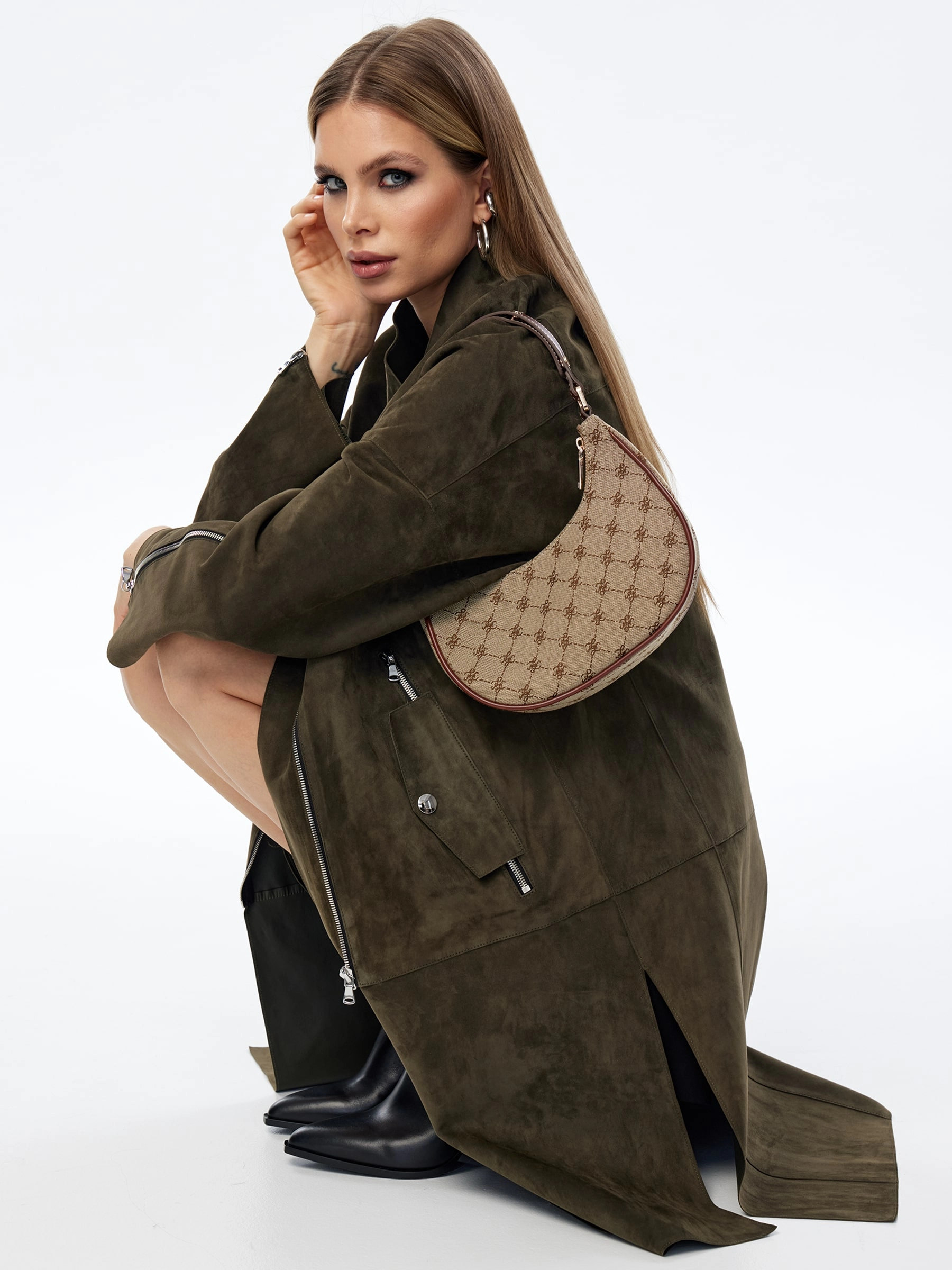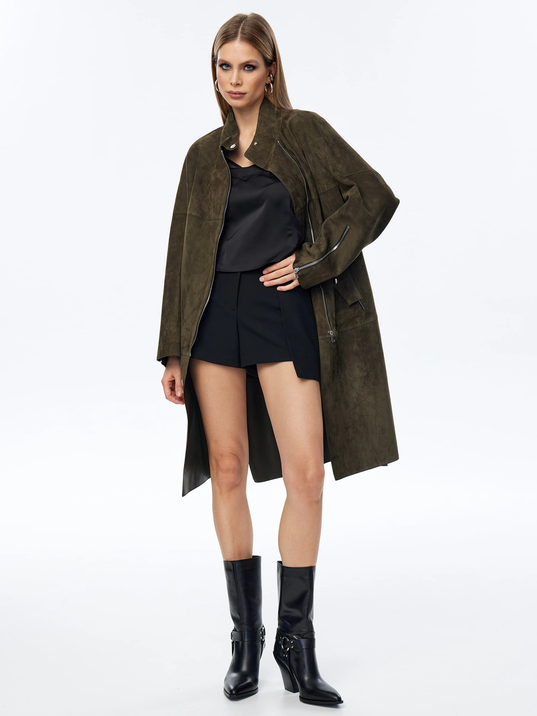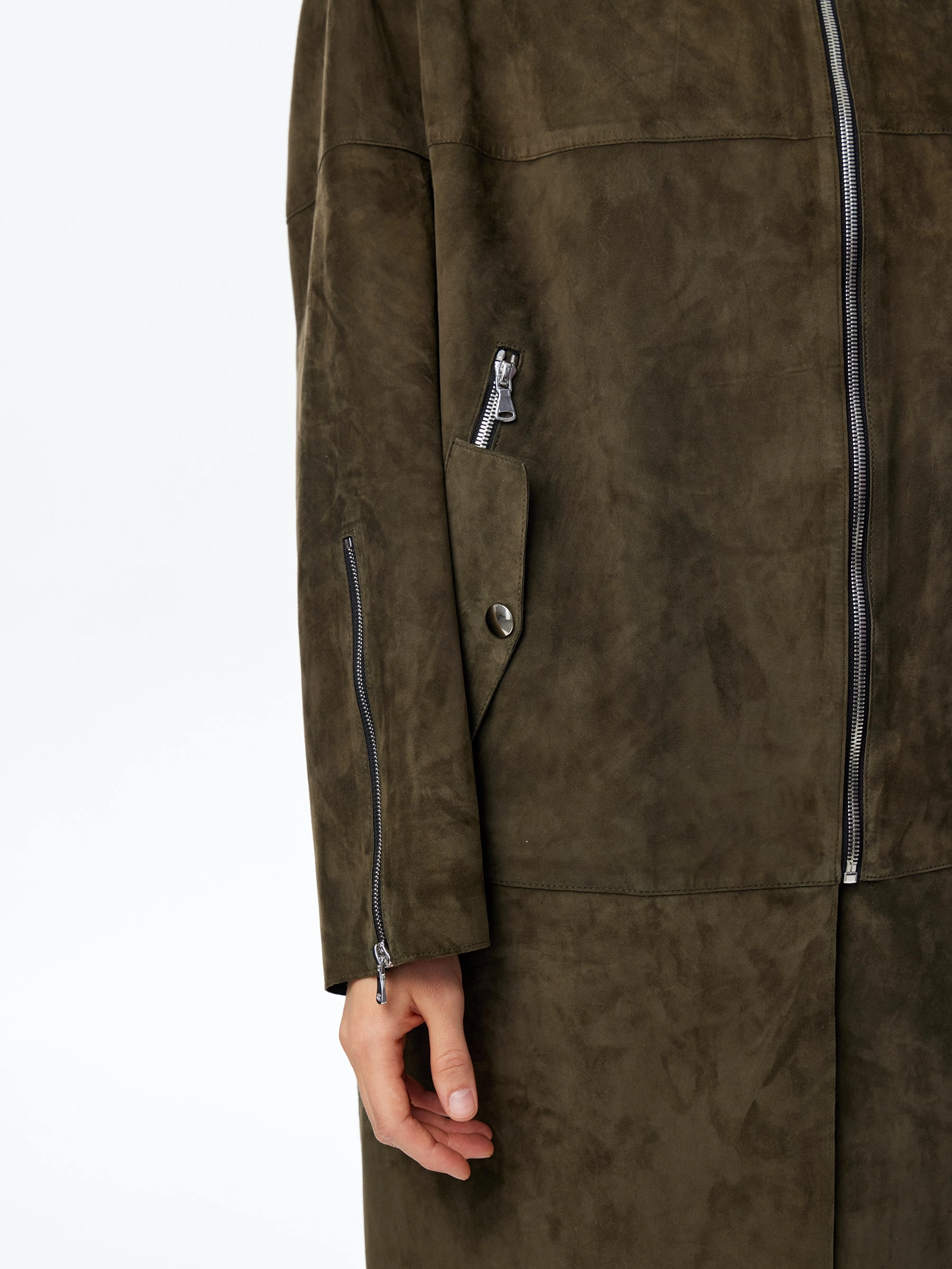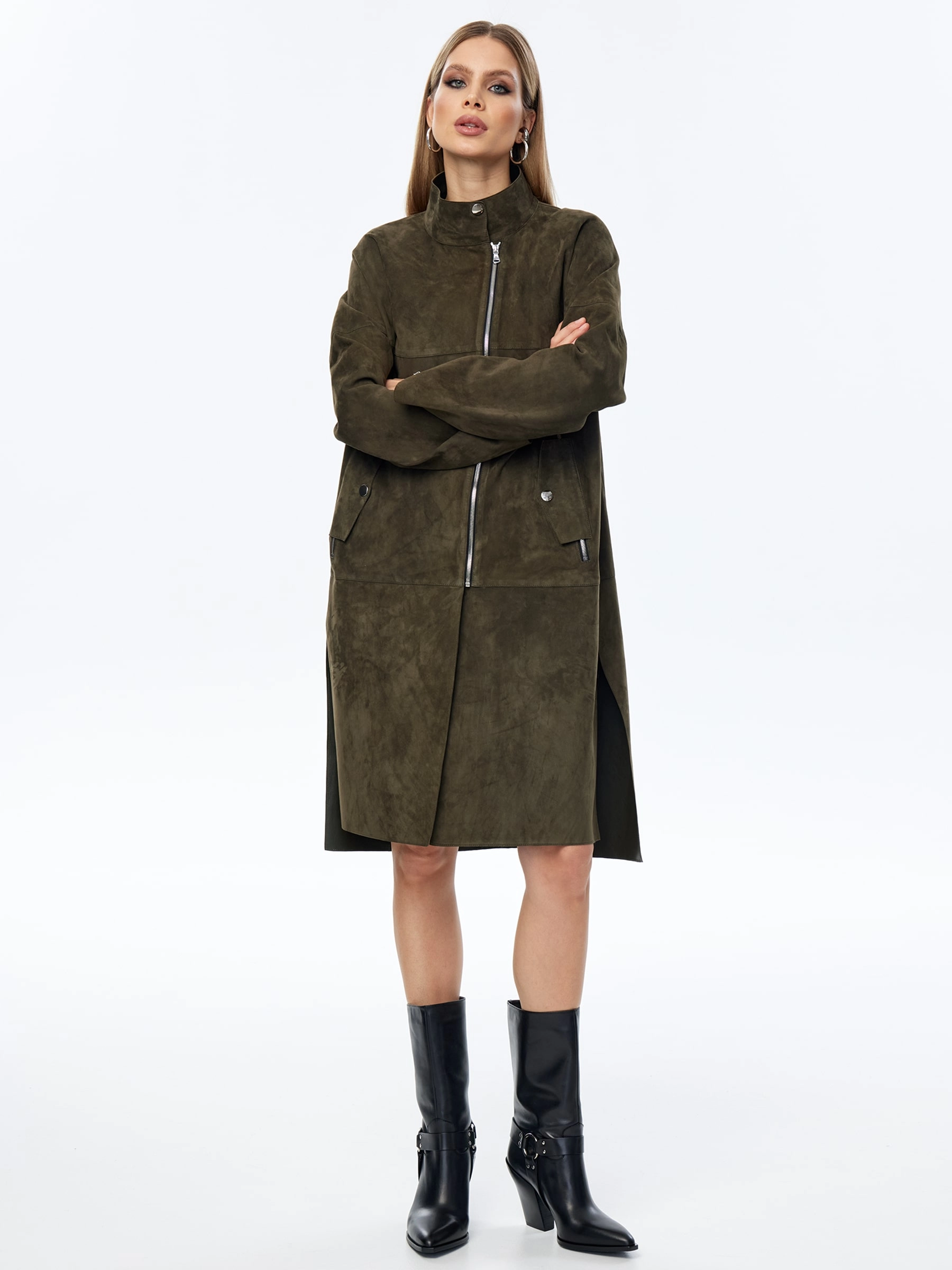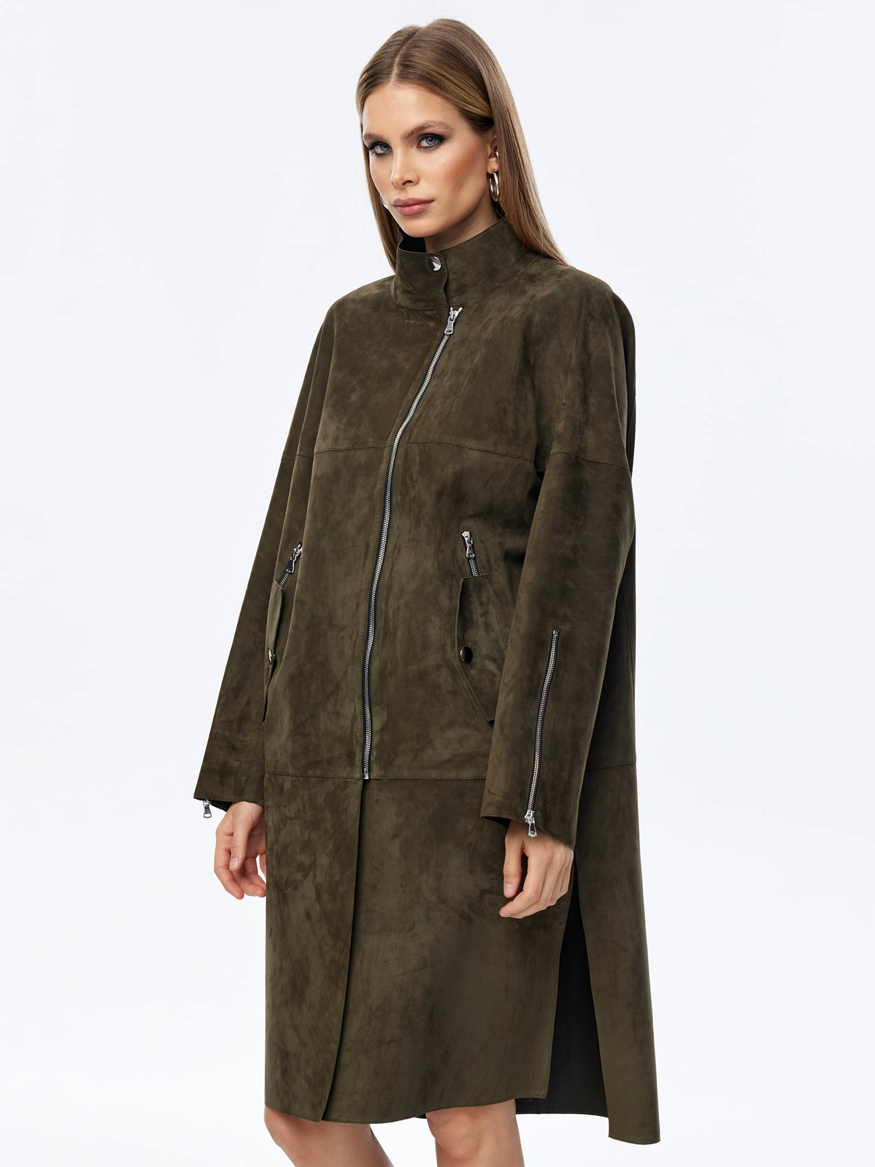 Товар длинный замшевый плащ оверсайз для женщин премиум класса 3041з, оливковый, размер 54, артикул 23580 выполнен из натуральной замши с застежкой молния. Рассчитан на сезон: весна-лето. Длина изделия 105 см, силуэт оверсайз.