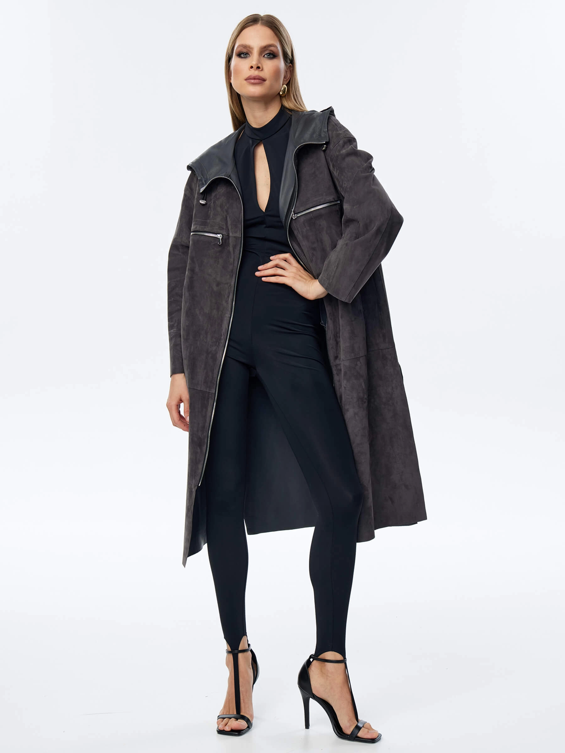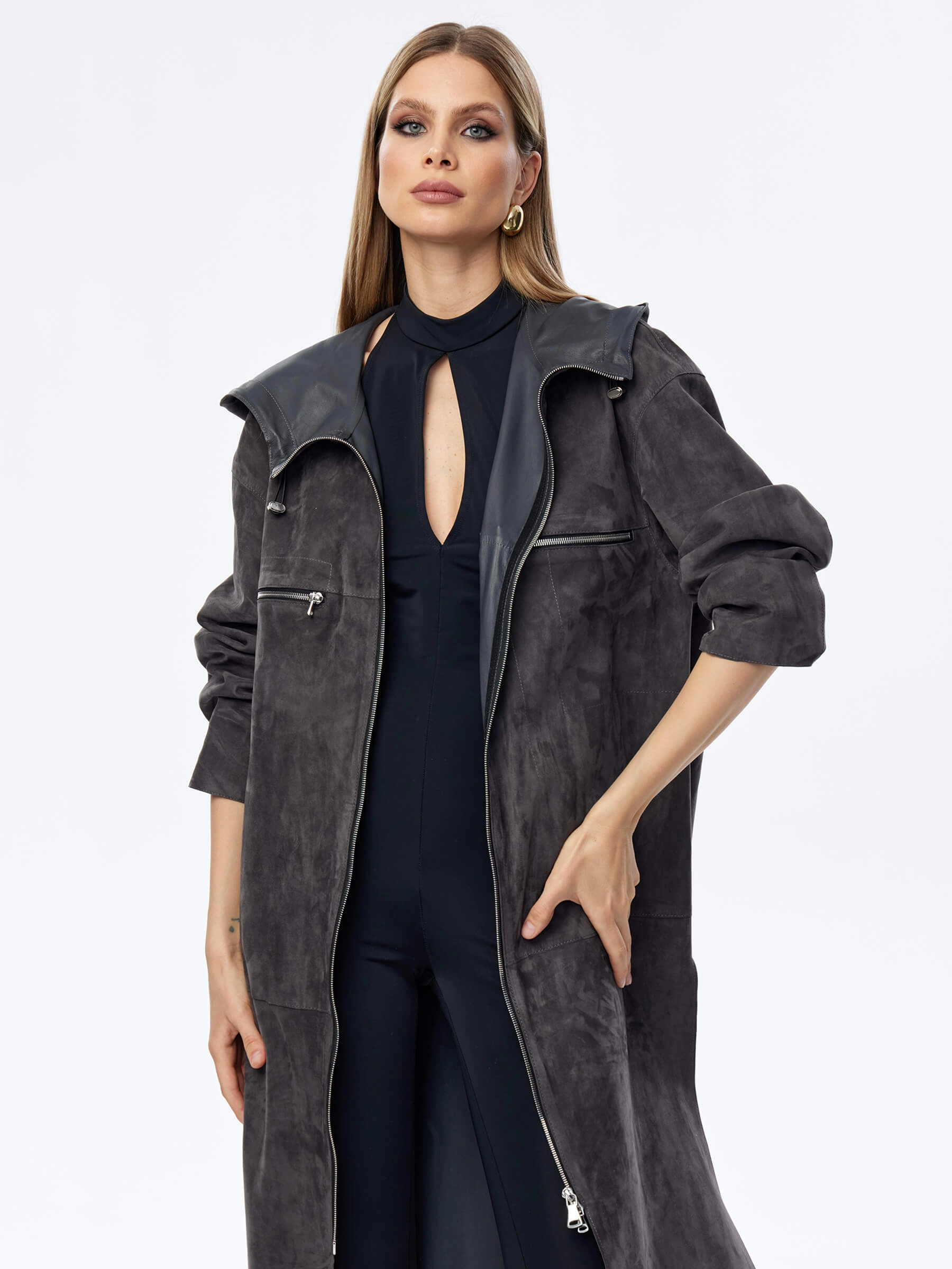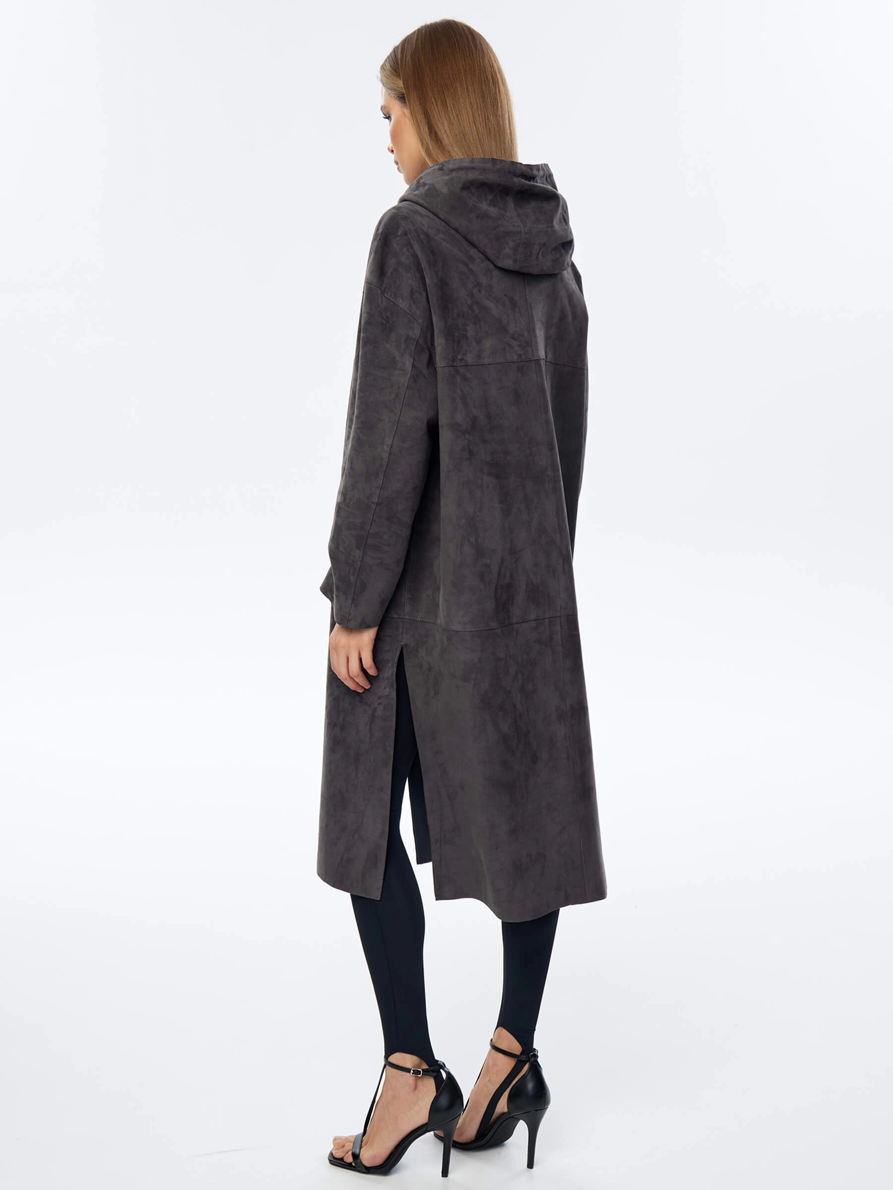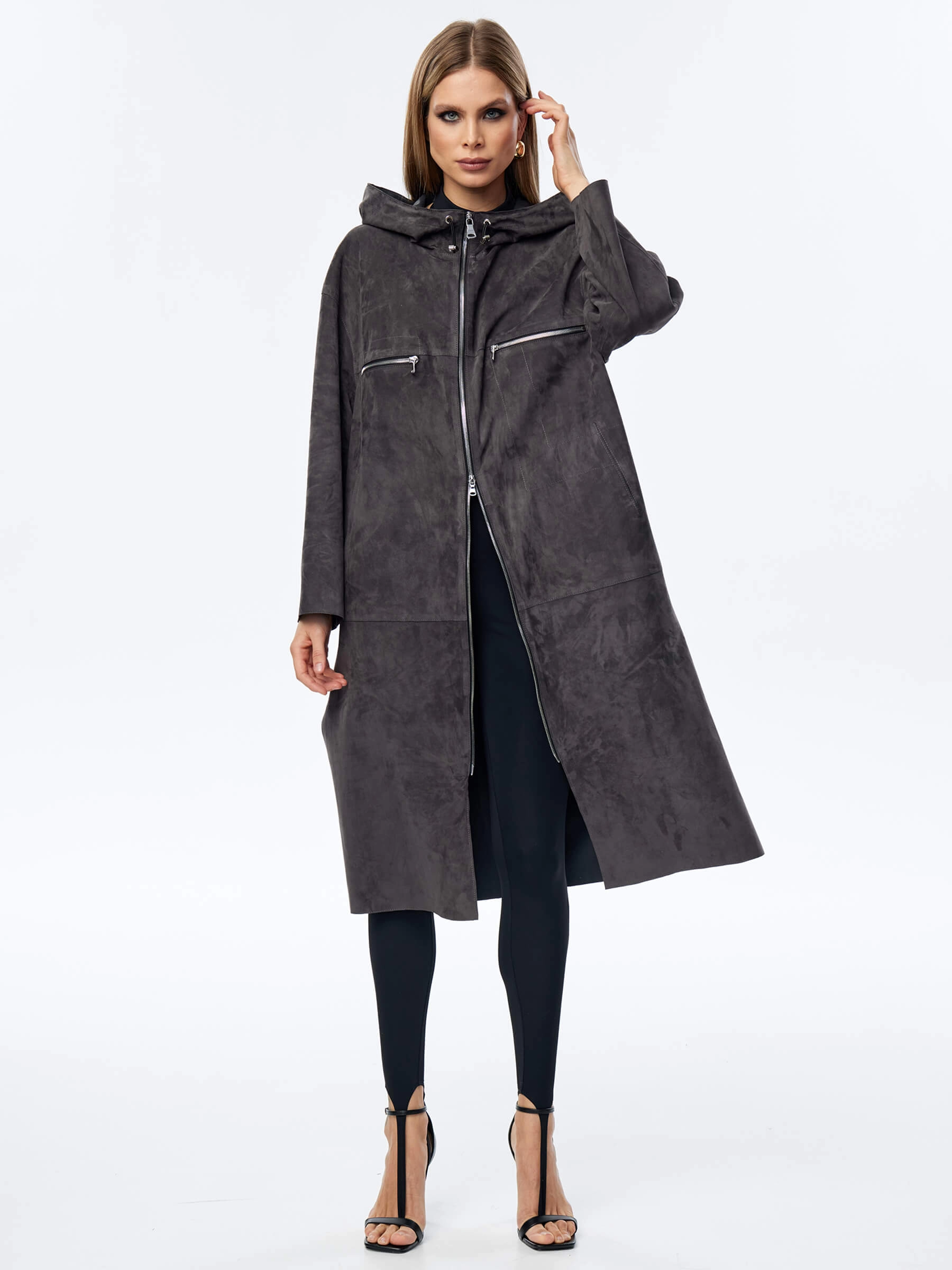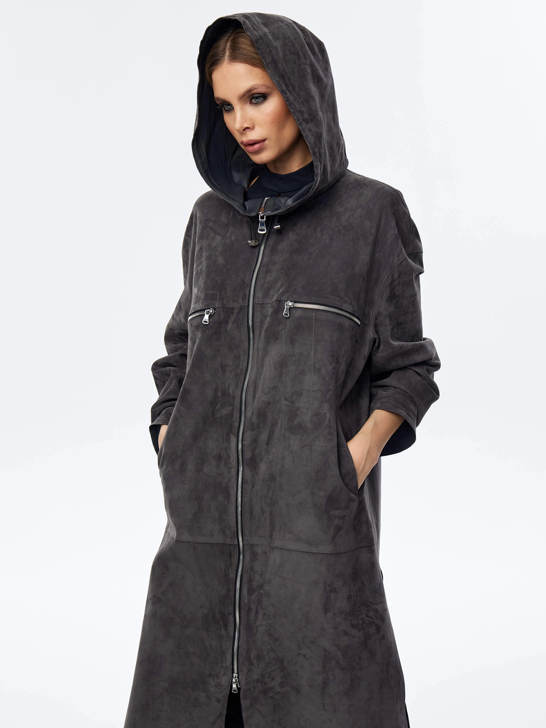 Товар длинный замшевый женский плащ оверсайз с капюшоном на молнии премиум класса 3058з, темно-серый, размер 50, артикул 23550 выполнен из натуральной замши с застежкой молния. Рассчитан на сезон: весна-лето. Длина изделия 110 см, силуэт оверсайз.