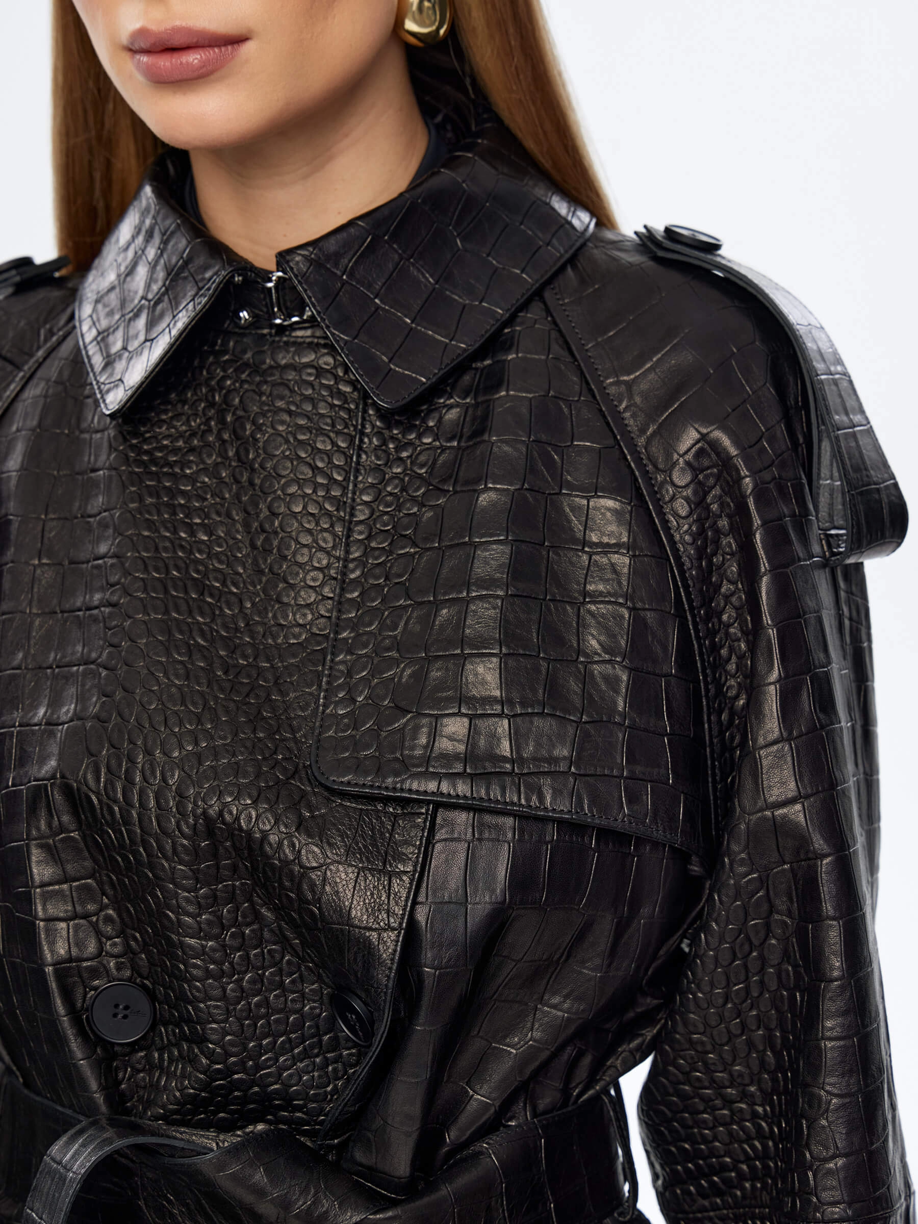 Товар длинный женский кожаный плащ с принтом под крокодила премиум класса 3071, черный, размер 54, артикул 23870 выполнен из натуральной кожи с застежкой пуговицы. Рассчитан на сезон: весна-осень. Длина изделия 120 см, силуэт свободный.