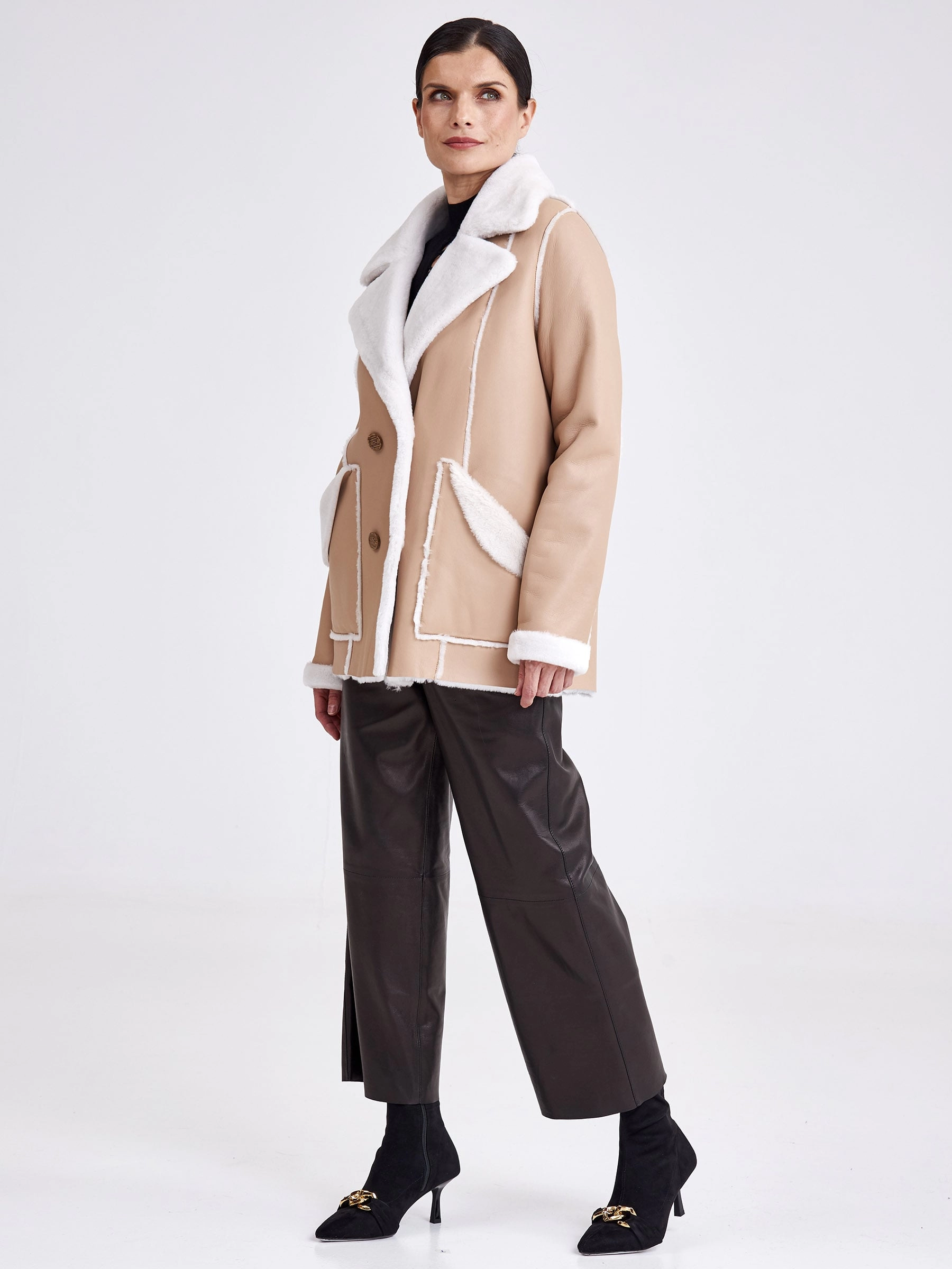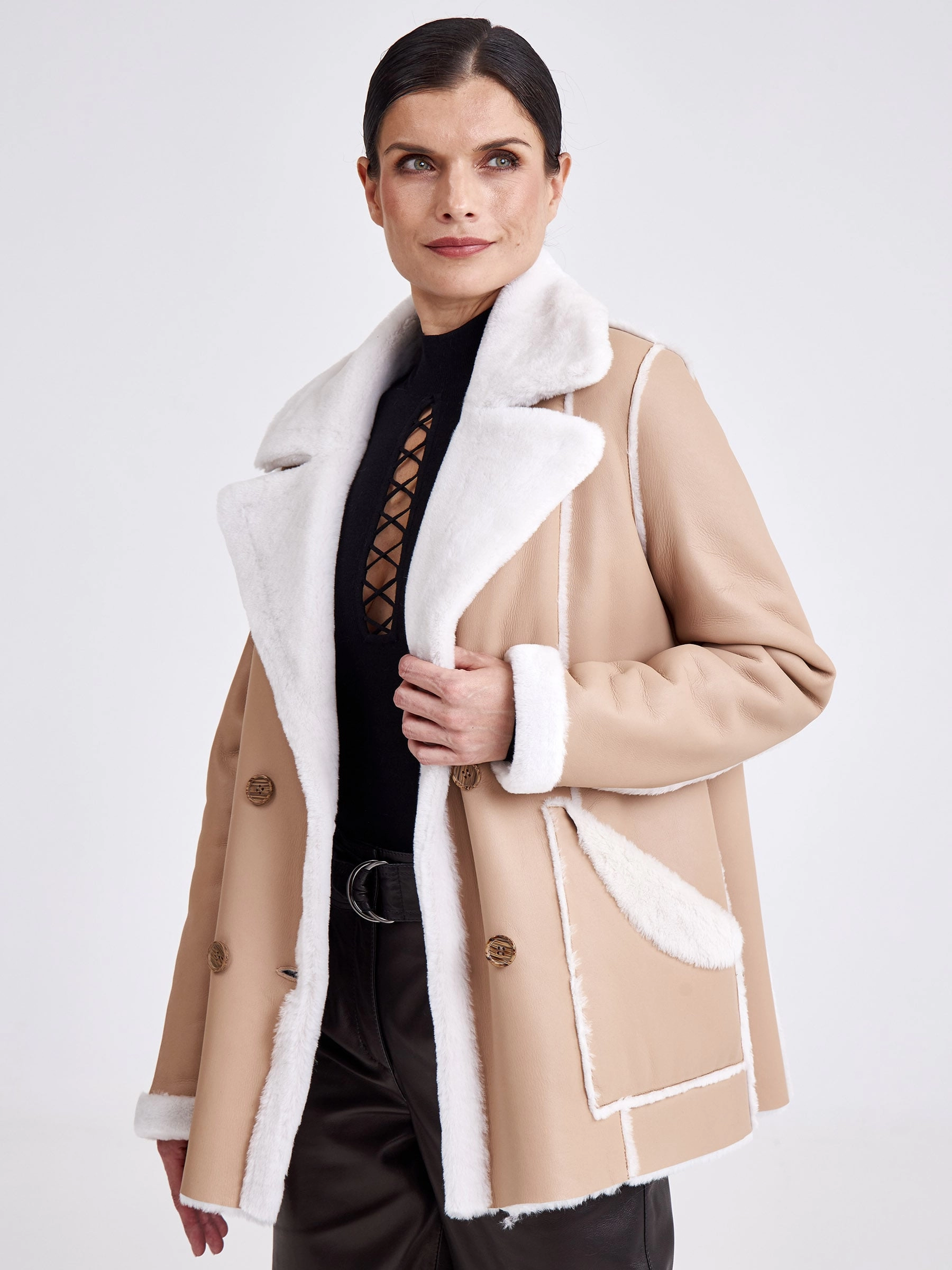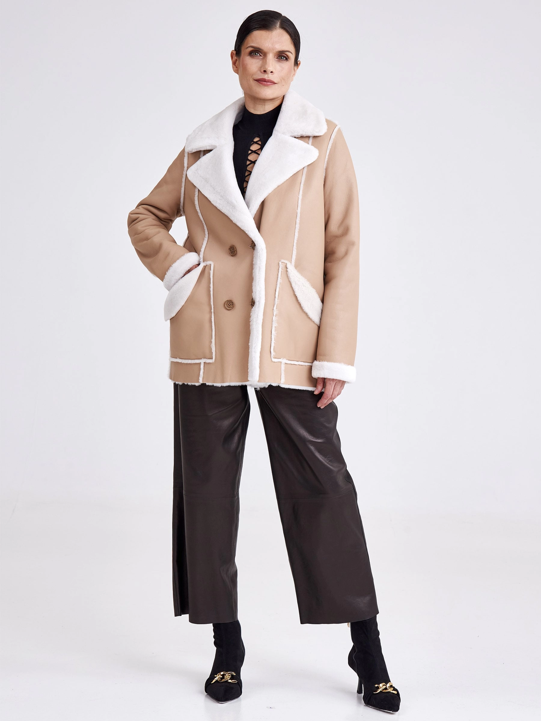 Для создания этой двубортной дублёнки использовали мягкую тонкую овчину, благодаря чему вещь получилась лёгкой и пластичной, а её внутренняя сторона отлично сохраняет тепло. Короткая длина (51-74 см) и прямой силуэт в сочетании с английским воротником создают лаконичный образ, который завершают два больших кармана с меховым отворотом и длинный пояс, подчёркивая безупречное качество и комфортную посадку. Совет стилиста: эта модель, балансирующая между классикой и утилитарным шиком, идеальна для динамичной городской жизни. Сочетайте её с джинсами скинни или прямыми брюками и высокими ботинками, чтобы подчеркнуть бунтарский дух, или наденьте поверх платья с юбкой-карандаш — меховые отвороты на карманах добавят образу игривости. Длинный пояс можно завязать свободным узлом на талии или бедрах, создавая расслабленный силуэт, не перегружая образ.