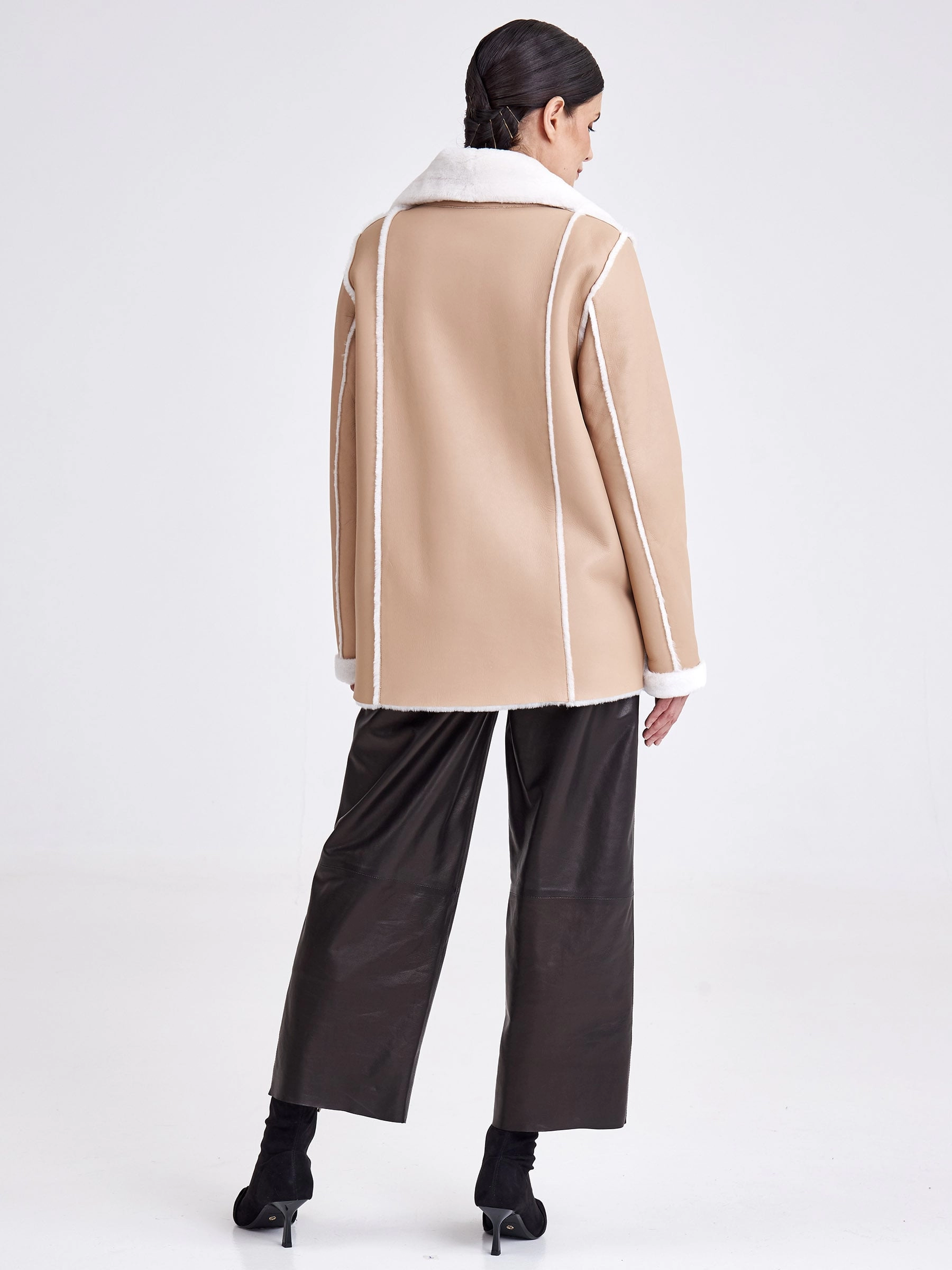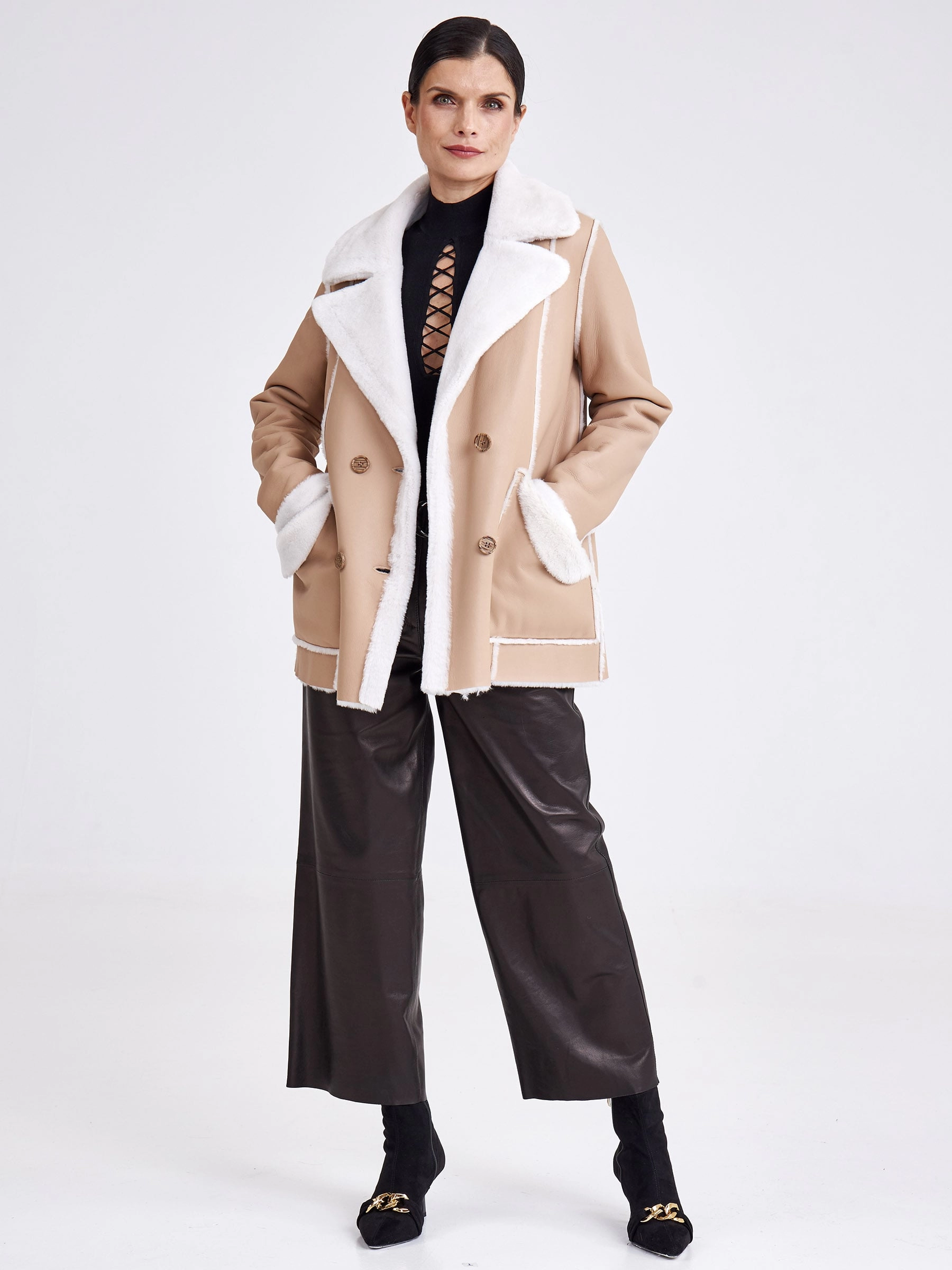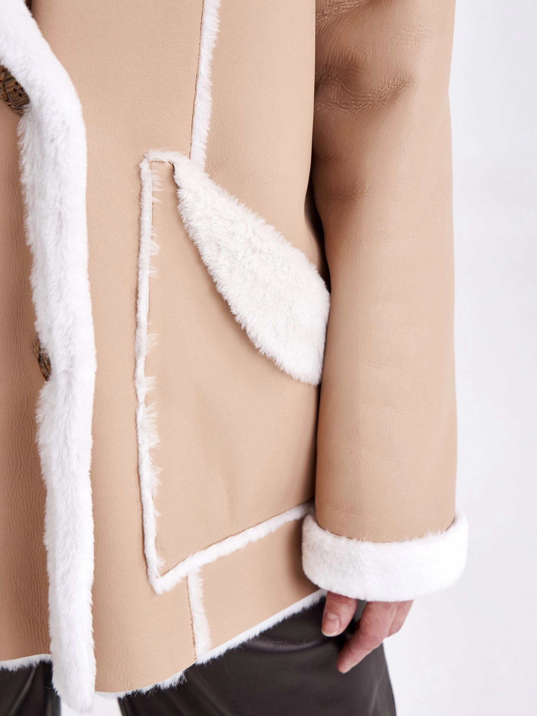 Для создания этой двубортной дублёнки использовали мягкую тонкую овчину, благодаря чему вещь получилась лёгкой и пластичной, а её внутренняя сторона отлично сохраняет тепло. Короткая длина (51-74 см) и прямой силуэт в сочетании с английским воротником создают лаконичный образ, который завершают два больших кармана с меховым отворотом и длинный пояс, подчёркивая безупречное качество и комфортную посадку. Совет стилиста: эта модель, балансирующая между классикой и утилитарным шиком, идеальна для динамичной городской жизни. Сочетайте её с джинсами скинни или прямыми брюками и высокими ботинками, чтобы подчеркнуть бунтарский дух, или наденьте поверх платья с юбкой-карандаш — меховые отвороты на карманах добавят образу игривости. Длинный пояс можно завязать свободным узлом на талии или бедрах, создавая расслабленный силуэт, не перегружая образ.