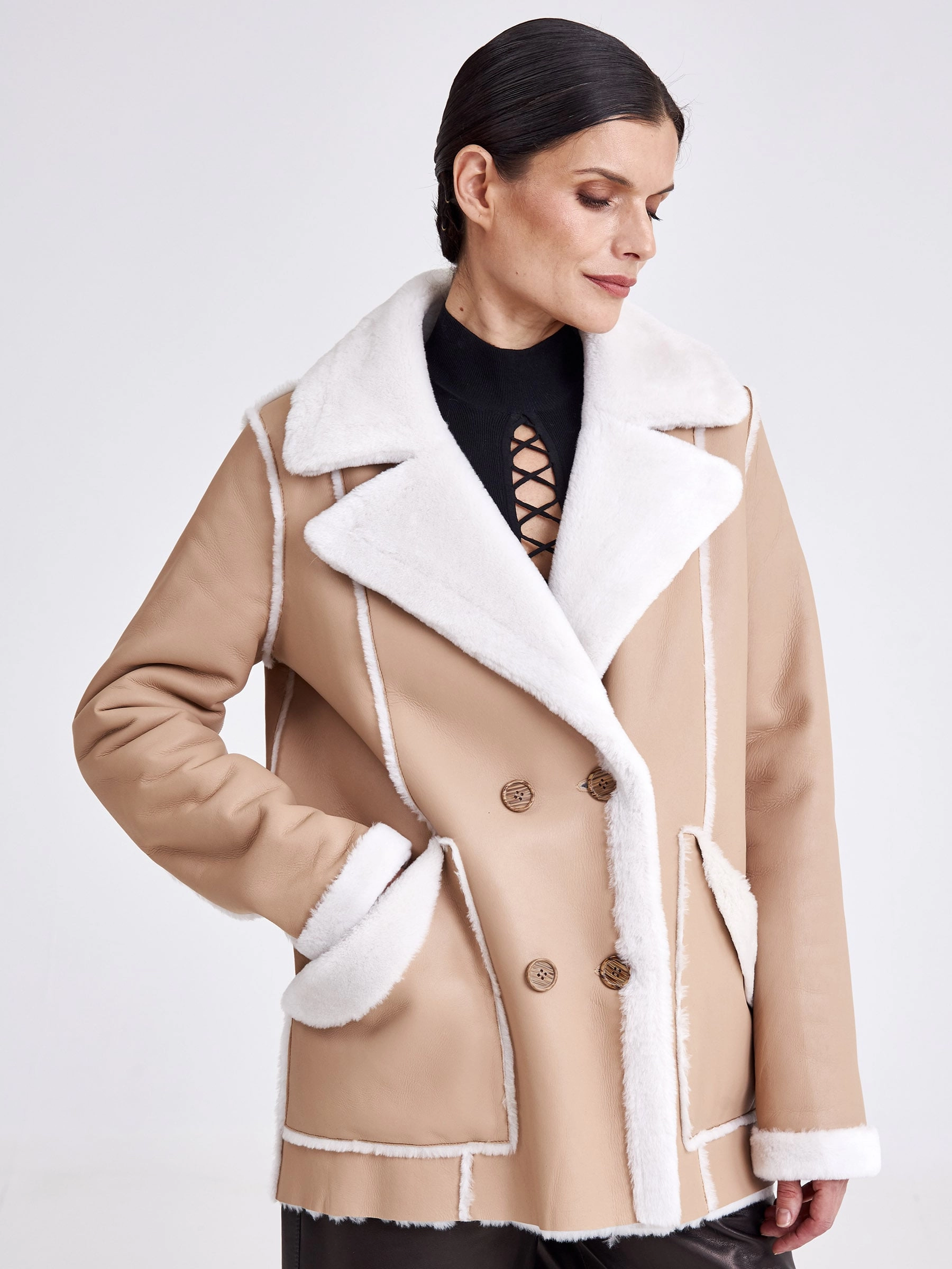 Двубортная короткая женская дубленка премиум класса 2010, бежевая, размер 46, артикул 62650