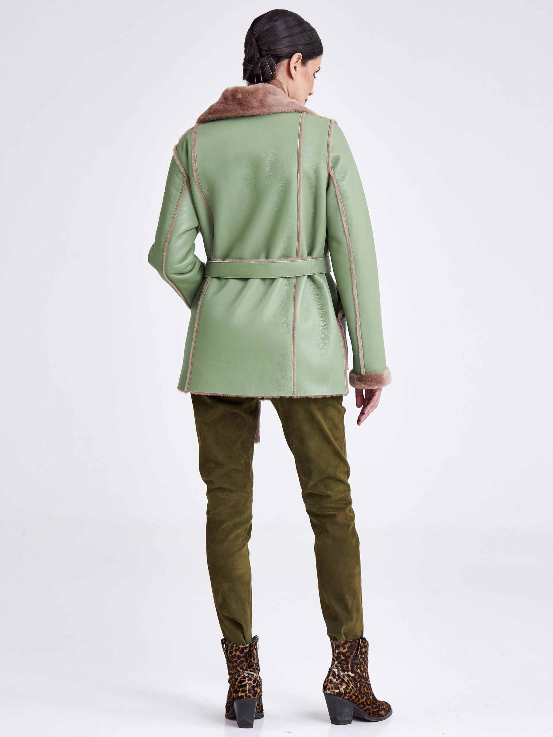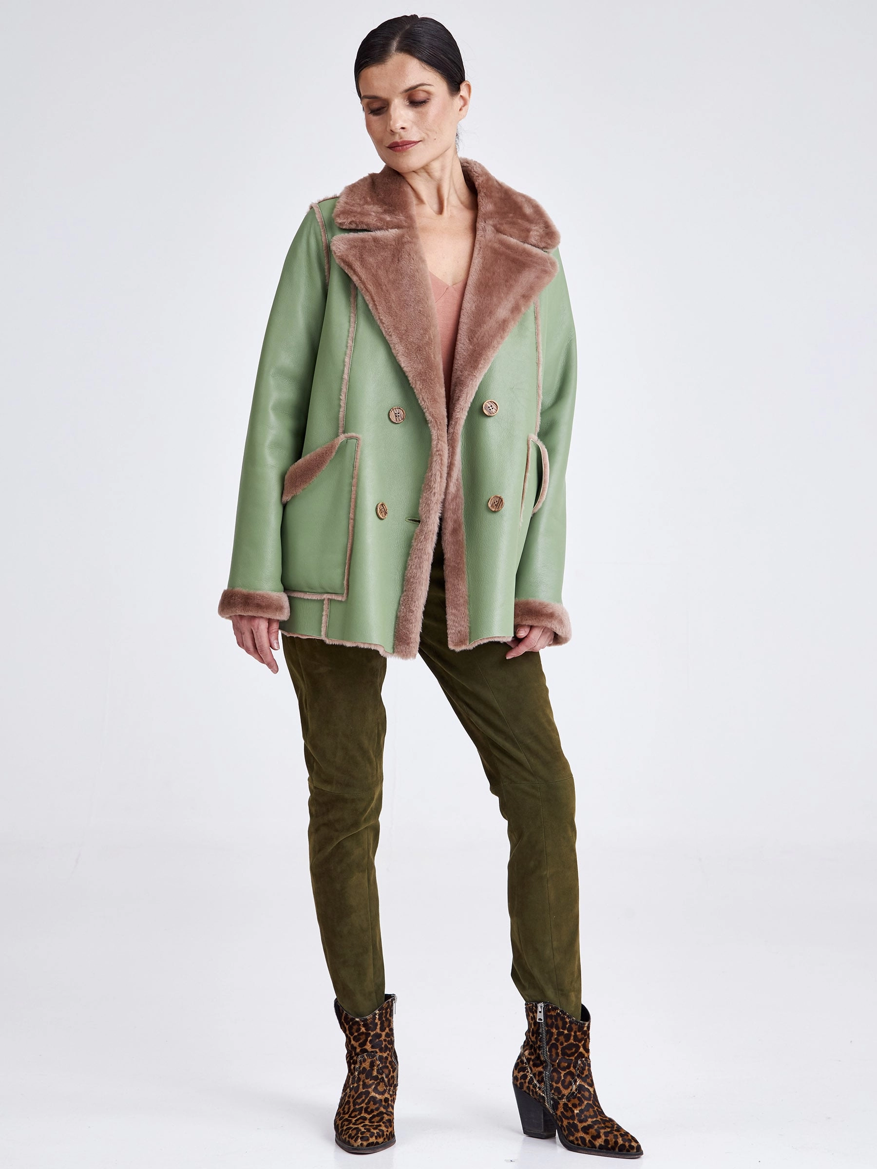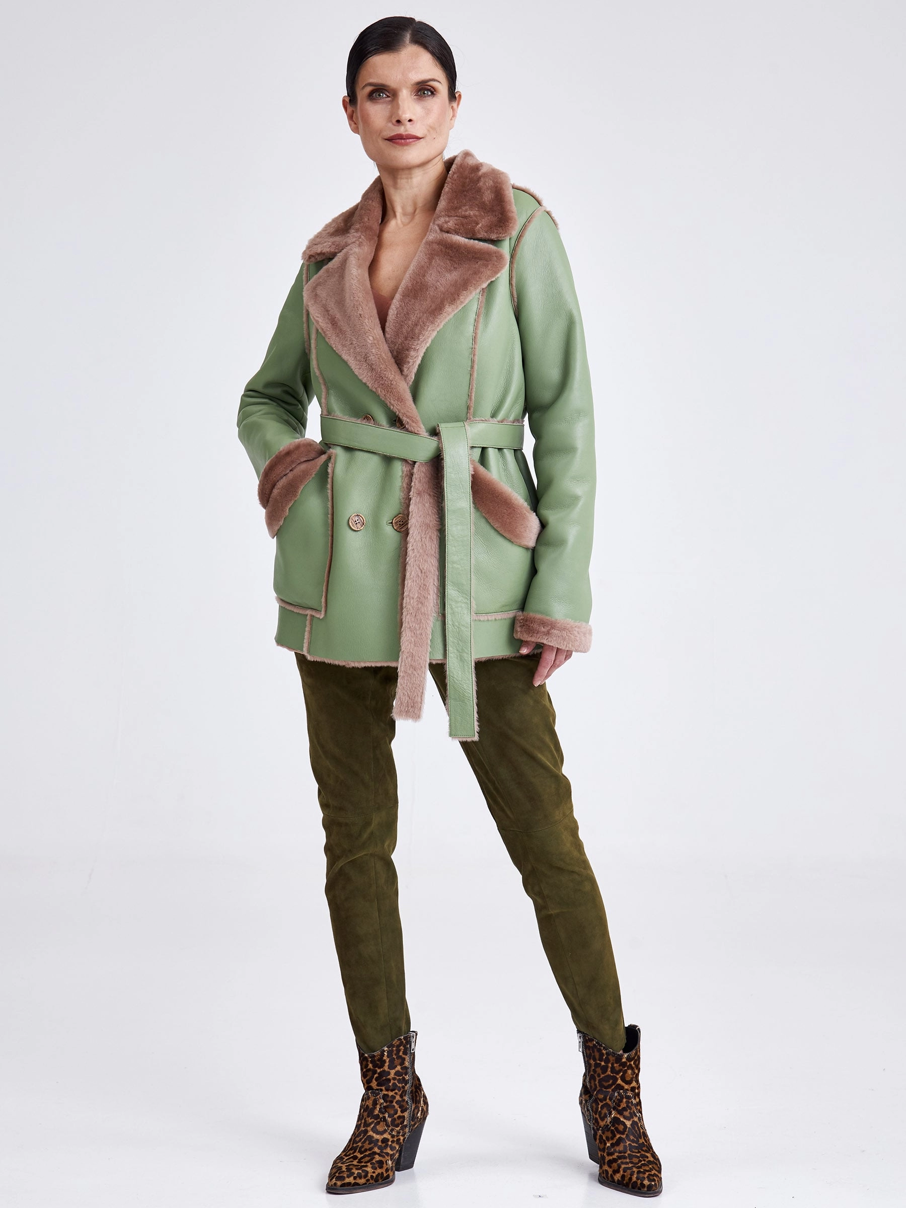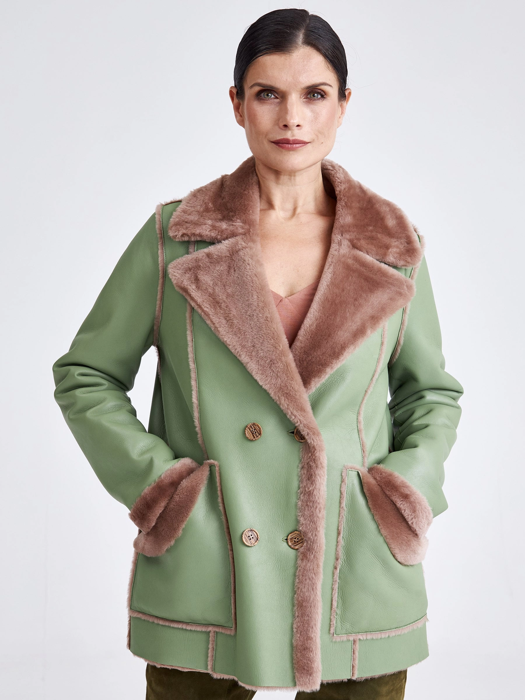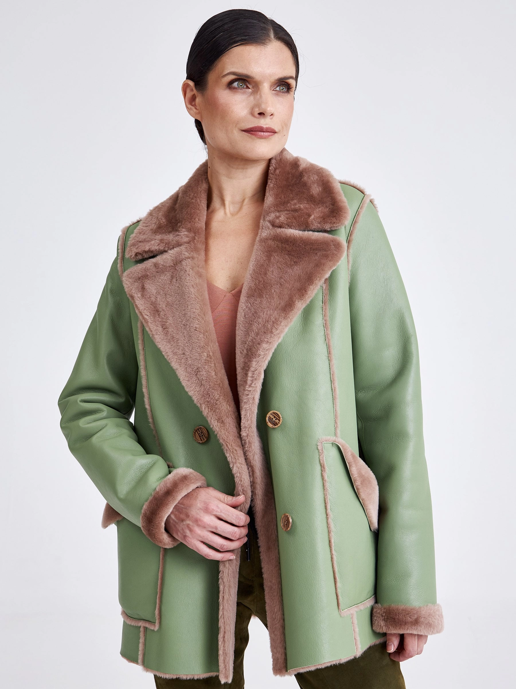 Для создания этой двубортной дублёнки использовали мягкую тонкую овчину, благодаря чему вещь получилась лёгкой и пластичной, а её внутренняя сторона отлично сохраняет тепло. Короткая длина (51-74 см) и прямой силуэт в сочетании с английским воротником создают лаконичный образ, который завершают два больших кармана с меховым отворотом и длинный пояс, подчёркивая безупречное качество и комфортную посадку. Совет стилиста: эта модель, балансирующая между классикой и утилитарным шиком, идеальна для динамичной городской жизни. Сочетайте её с джинсами скинни или прямыми брюками и высокими ботинками, чтобы подчеркнуть бунтарский дух, или наденьте поверх платья с юбкой-карандаш — меховые отвороты на карманах добавят образу игривости. Длинный пояс можно завязать свободным узлом на талии или бедрах, создавая расслабленный силуэт, не перегружая образ.