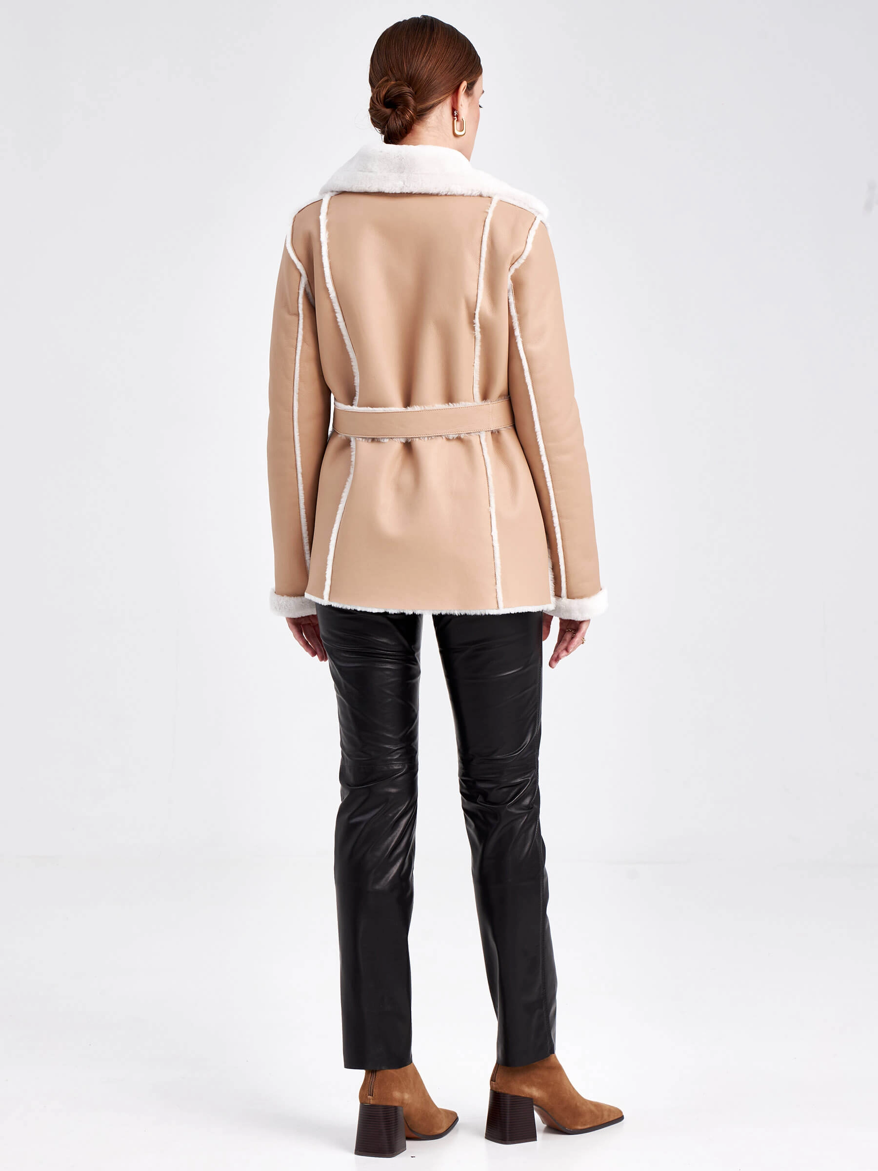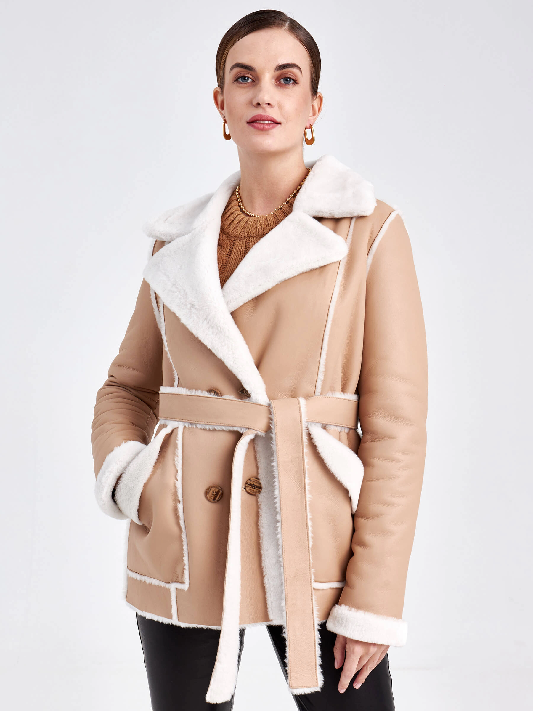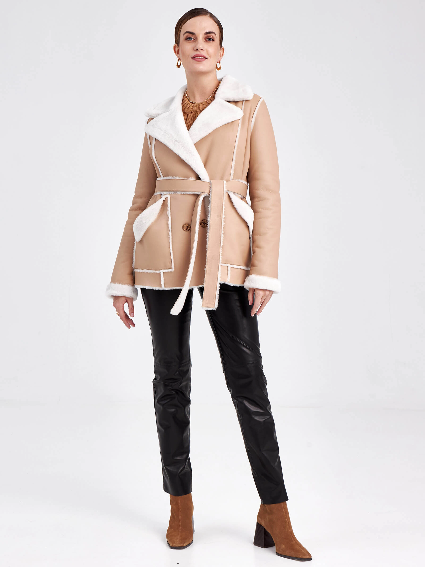 Для создания этой двубортной дублёнки использовали мягкую тонкую овчину, благодаря чему вещь получилась лёгкой и пластичной, а её внутренняя сторона отлично сохраняет тепло. Короткая длина (51-74 см) и прямой силуэт в сочетании с английским воротником создают лаконичный образ, который завершают два больших кармана с меховым отворотом и длинный пояс, подчёркивая безупречное качество и комфортную посадку. Совет стилиста: эта модель, балансирующая между классикой и утилитарным шиком, идеальна для динамичной городской жизни. Сочетайте её с джинсами скинни или прямыми брюками и высокими ботинками, чтобы подчеркнуть бунтарский дух, или наденьте поверх платья с юбкой-карандаш — меховые отвороты на карманах добавят образу игривости. Длинный пояс можно завязать свободным узлом на талии или бедрах, создавая расслабленный силуэт, не перегружая образ.