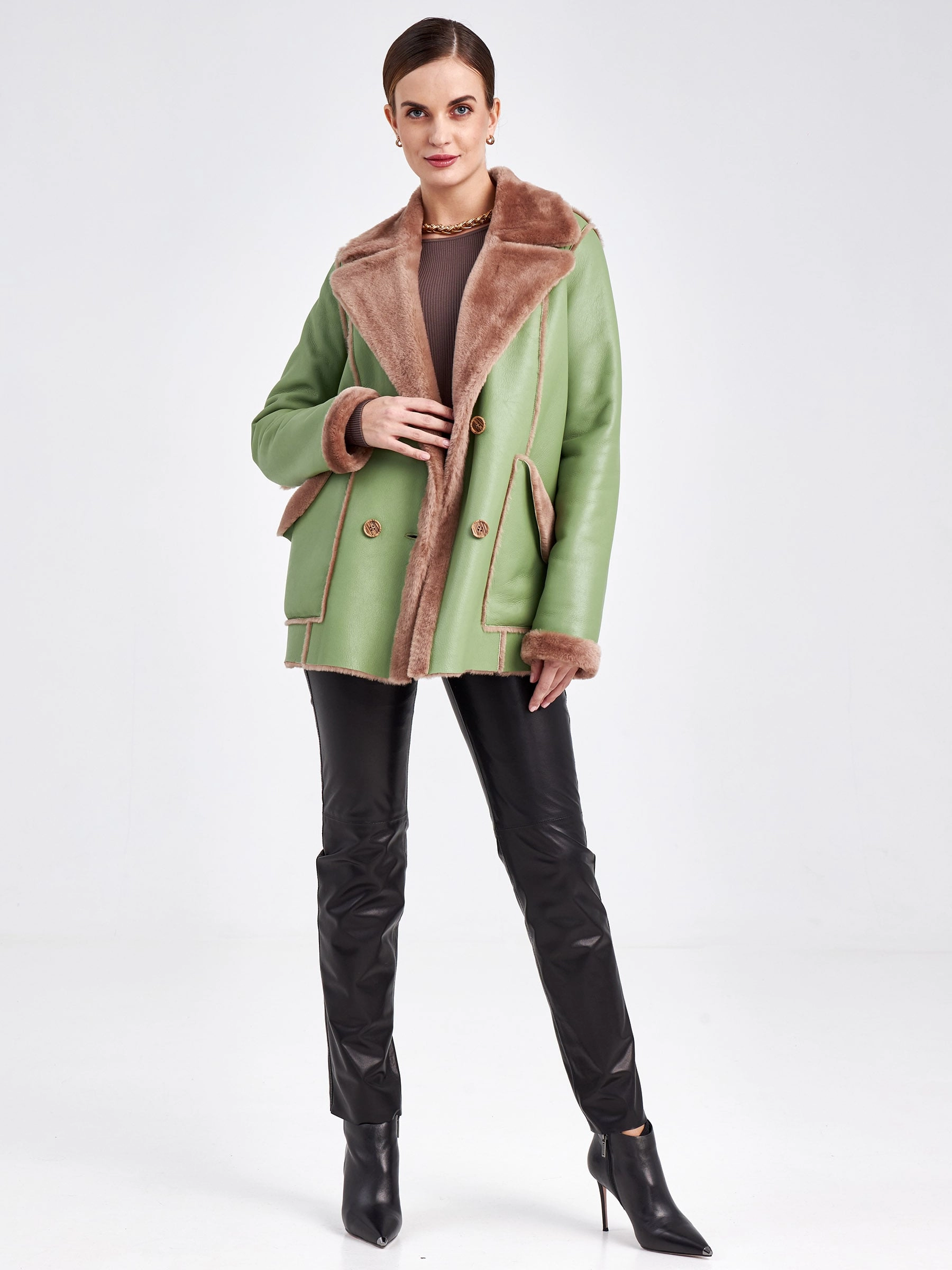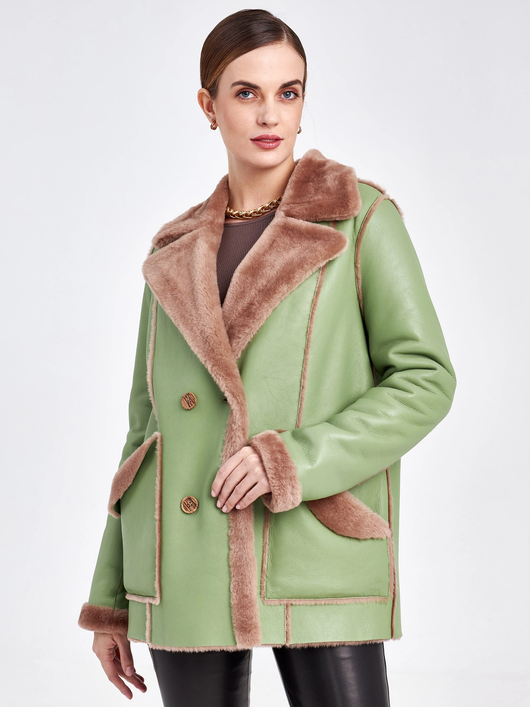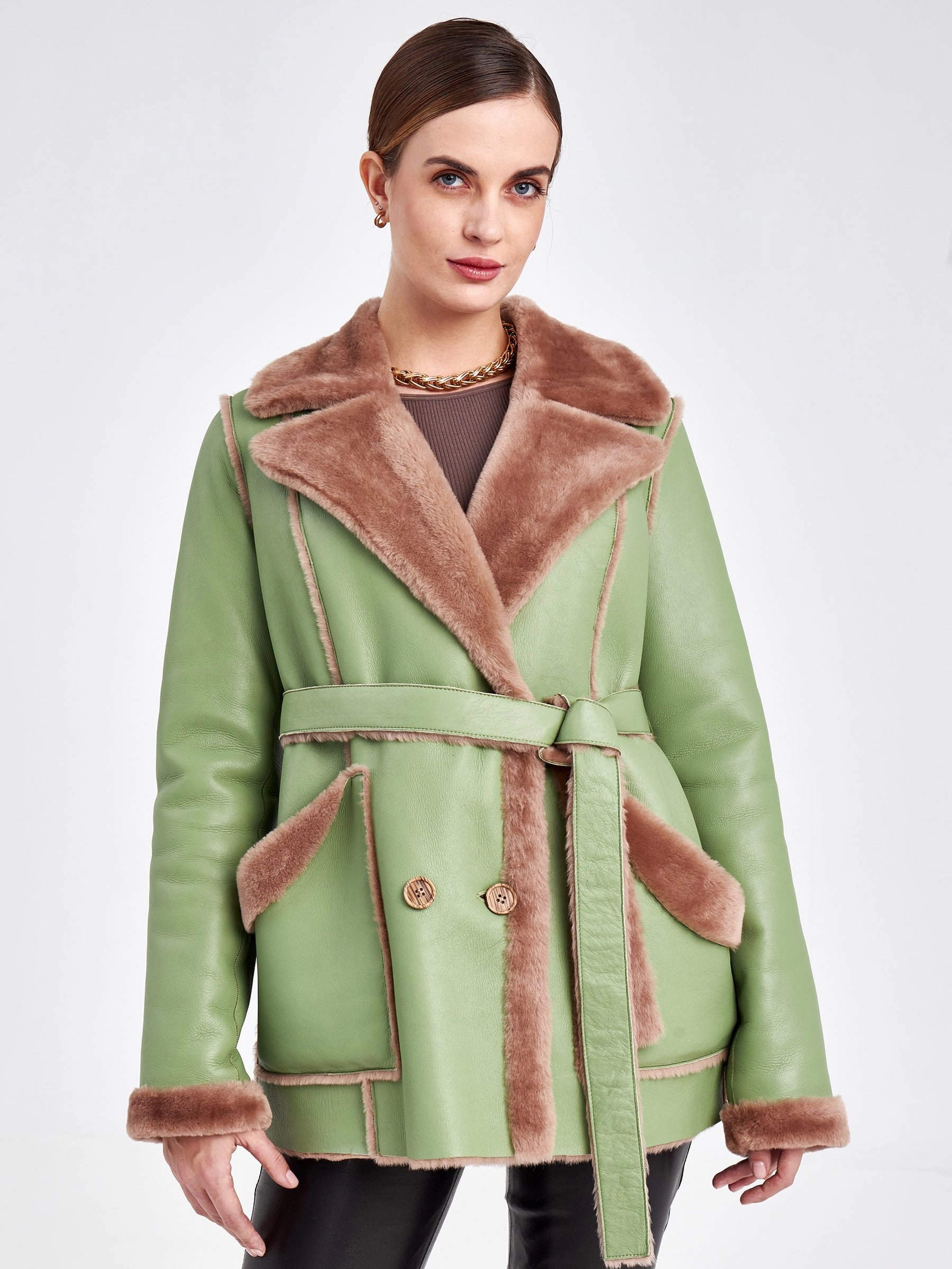 Для создания этой двубортной дублёнки использовали мягкую тонкую овчину, благодаря чему вещь получилась лёгкой и пластичной, а её внутренняя сторона отлично сохраняет тепло. Короткая длина (51-74 см) и прямой силуэт в сочетании с английским воротником создают лаконичный образ, который завершают два больших кармана с меховым отворотом и длинный пояс, подчёркивая безупречное качество и комфортную посадку. Совет стилиста: эта модель, балансирующая между классикой и утилитарным шиком, идеальна для динамичной городской жизни. Сочетайте её с джинсами скинни или прямыми брюками и высокими ботинками, чтобы подчеркнуть бунтарский дух, или наденьте поверх платья с юбкой-карандаш — меховые отвороты на карманах добавят образу игривости. Длинный пояс можно завязать свободным узлом на талии или бедрах, создавая расслабленный силуэт, не перегружая образ.